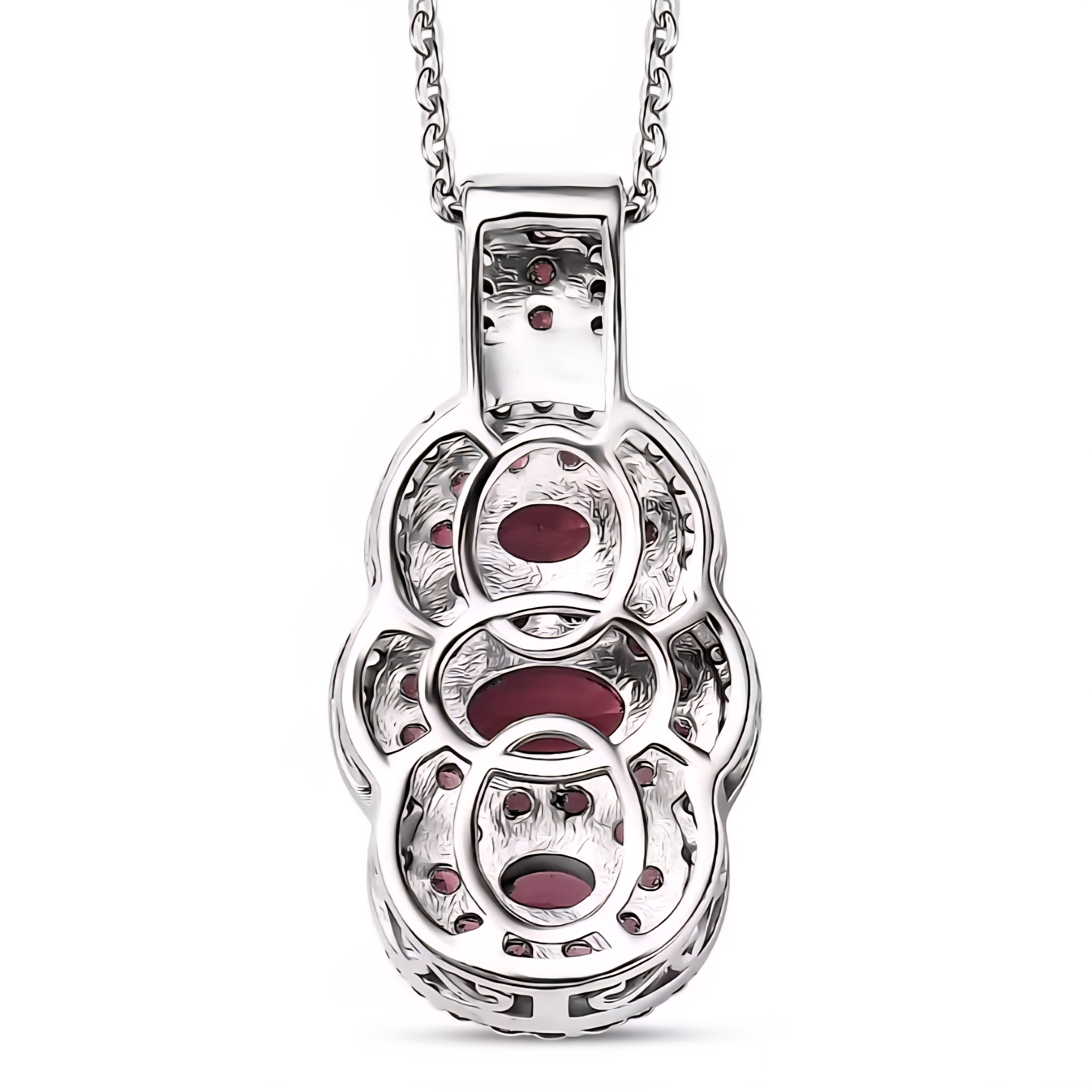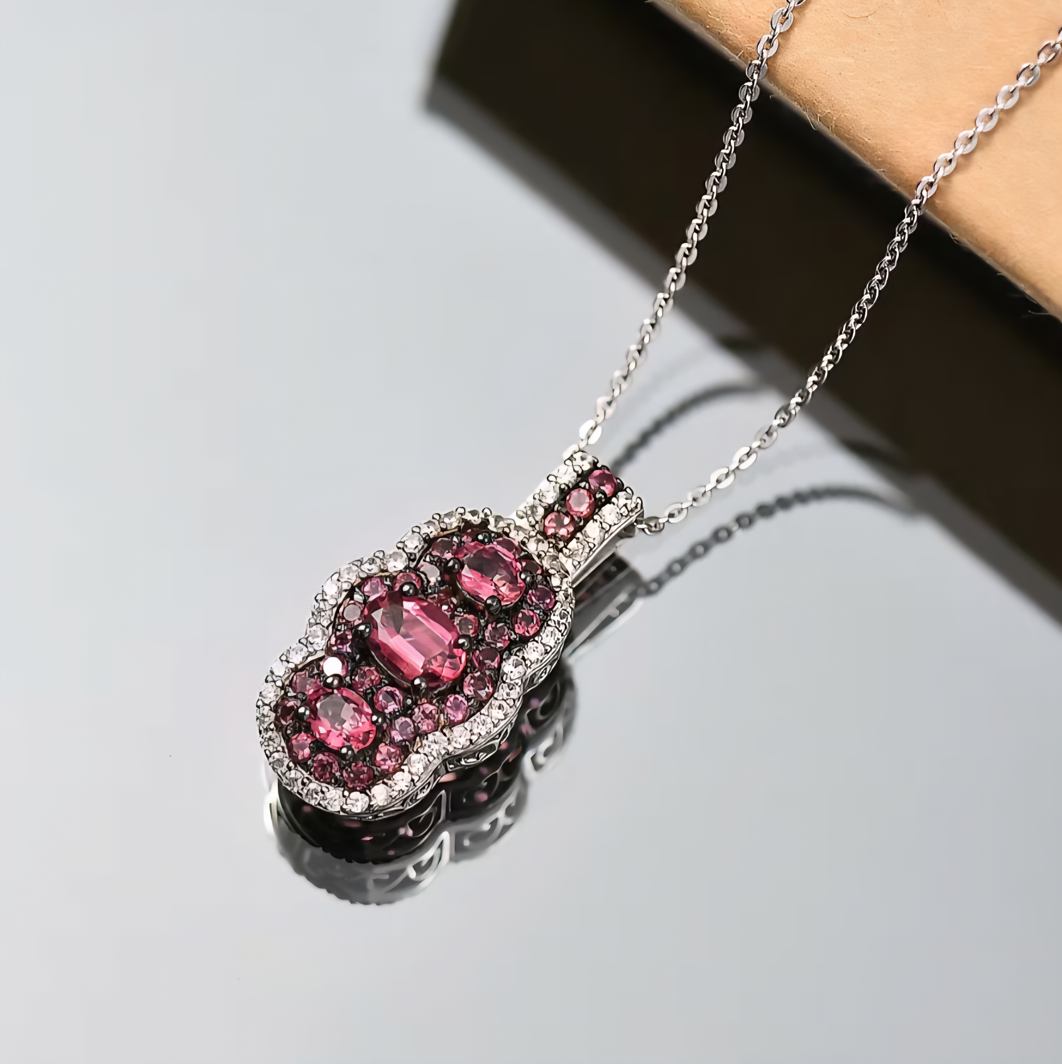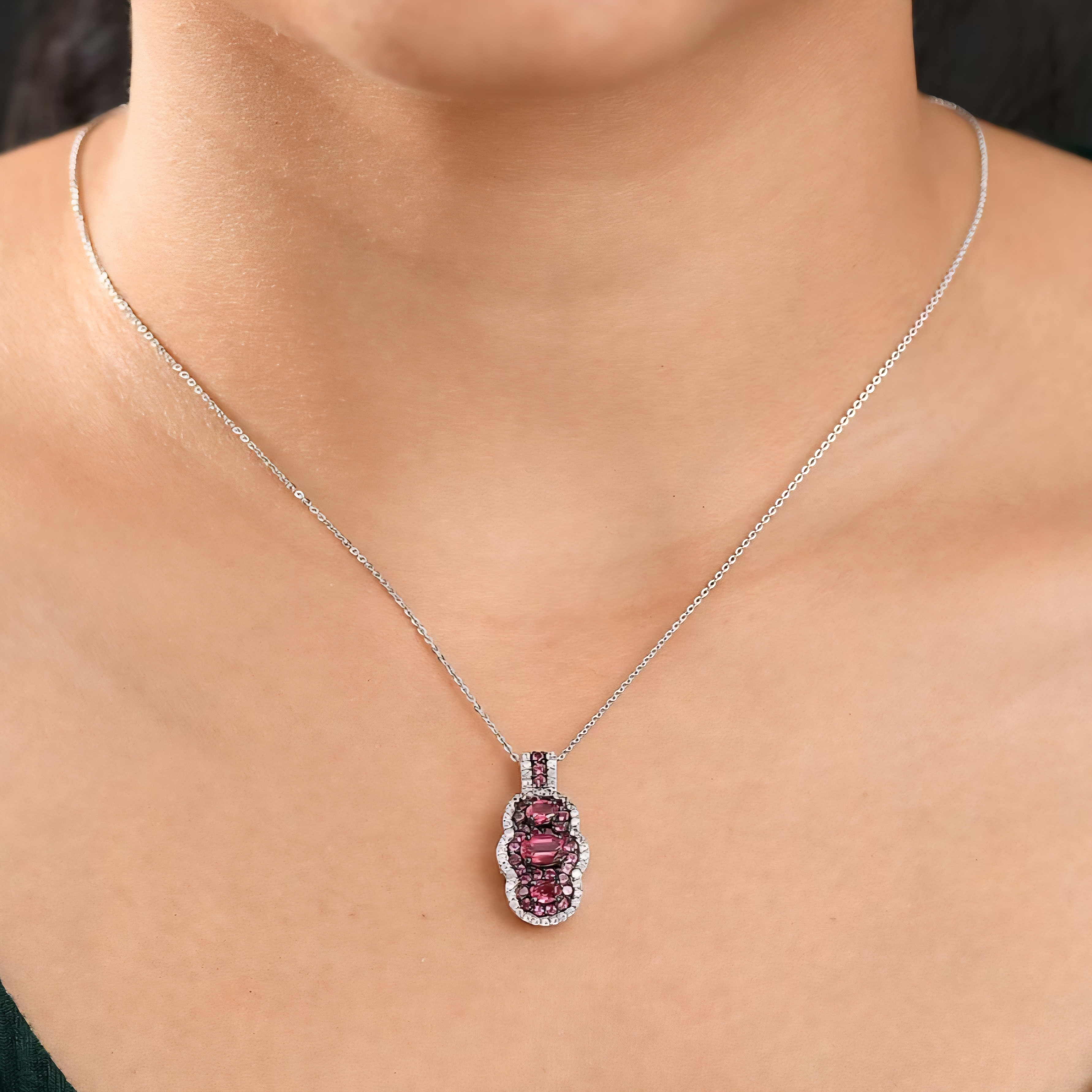 Radiant pink-red brilliance with timeless elegance. This pendant features a trilogy of oval rubellite tourmalines (0.84ctw) accented by rounds (0.49ctw), glowing with the vivid color that makes rubellite so rare and prized. Surrounding halos of white zircon (0.67ctw) amplify the sparkle and create luminous contrast, while black rhodium adds depth to the design. Crafted in solid 925 sterling silver, this 2.00ctw pendant celebrates the richness of rubellite tourmaline in a classic yet dramatic silhouette.