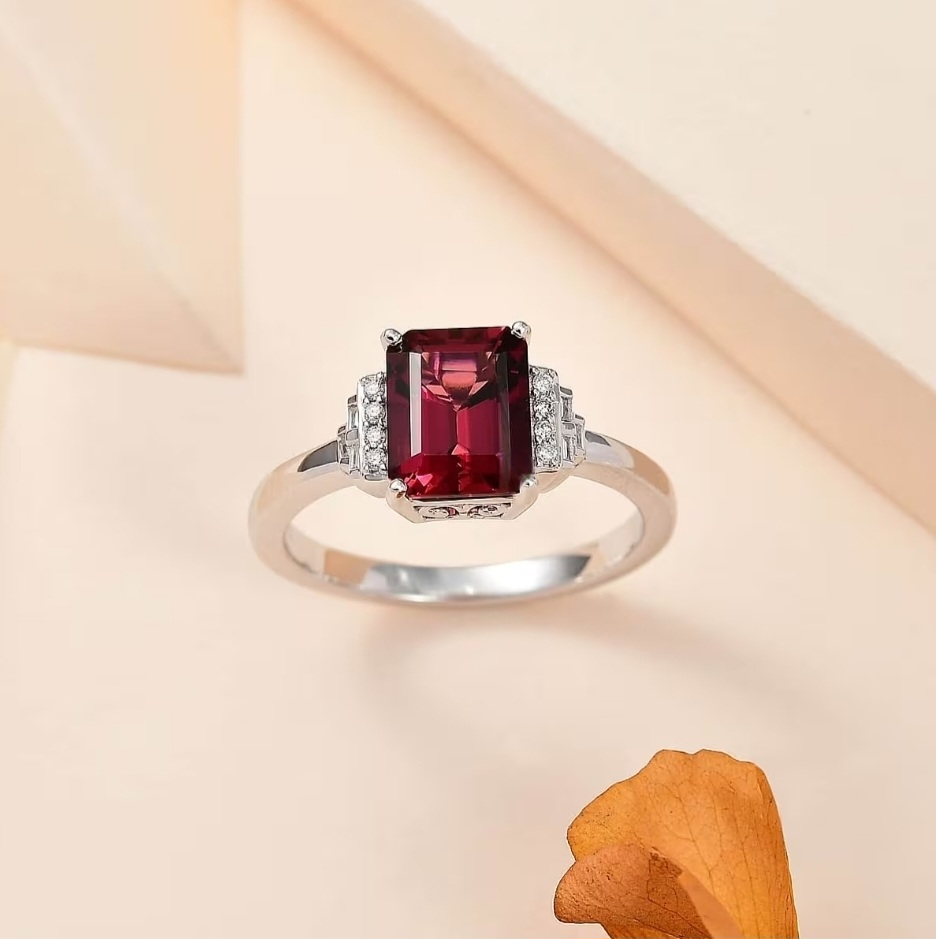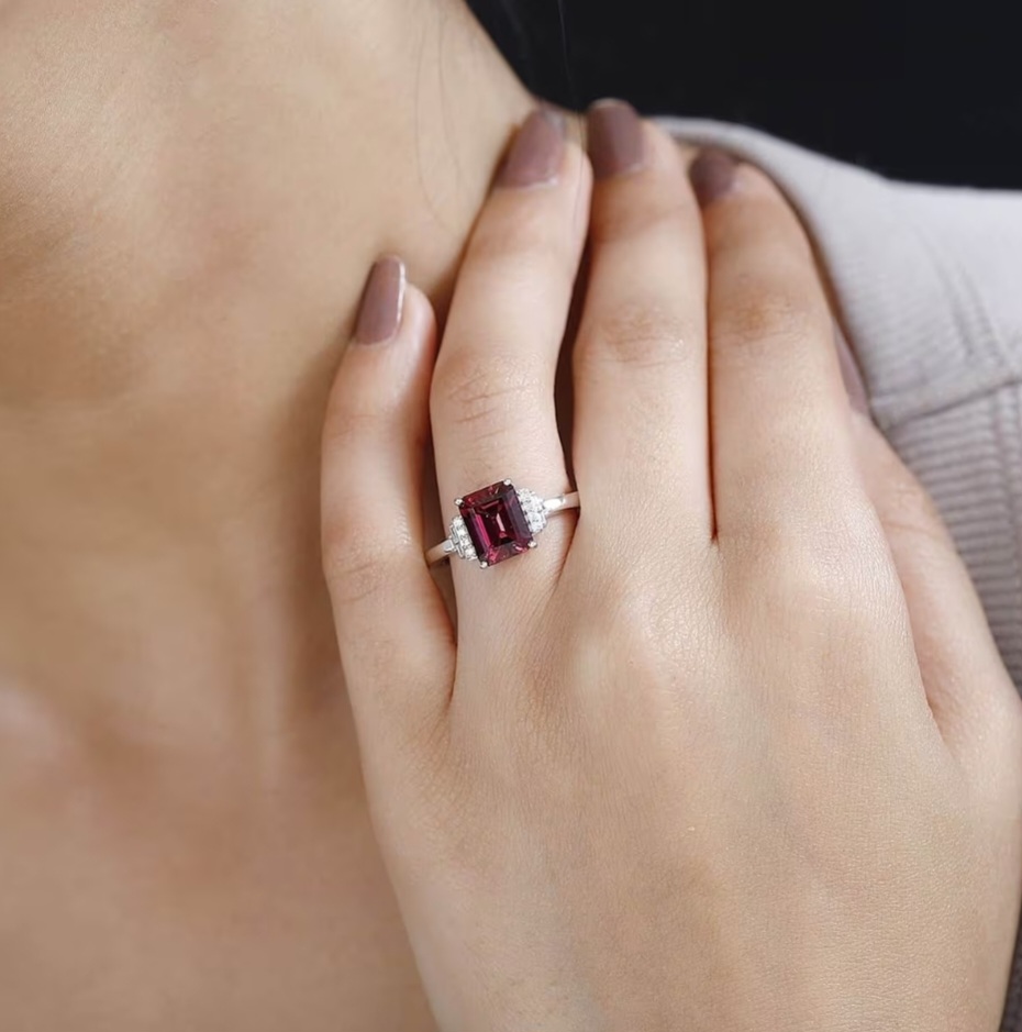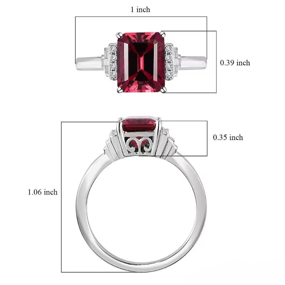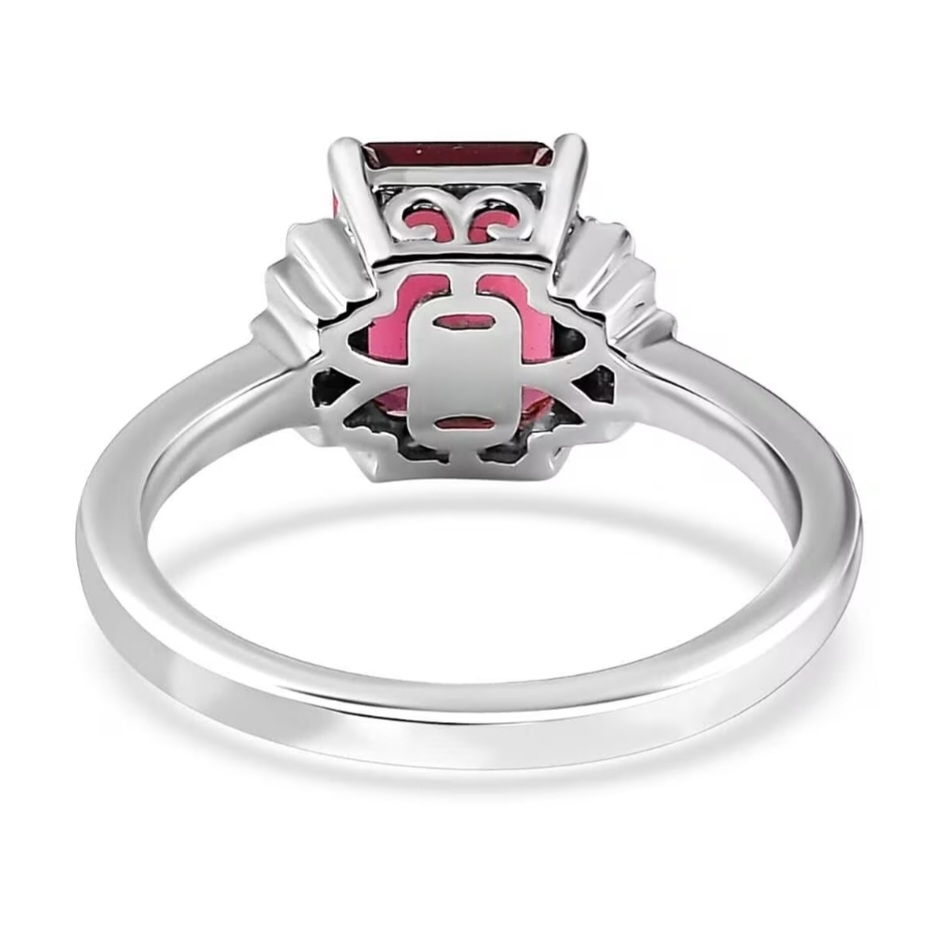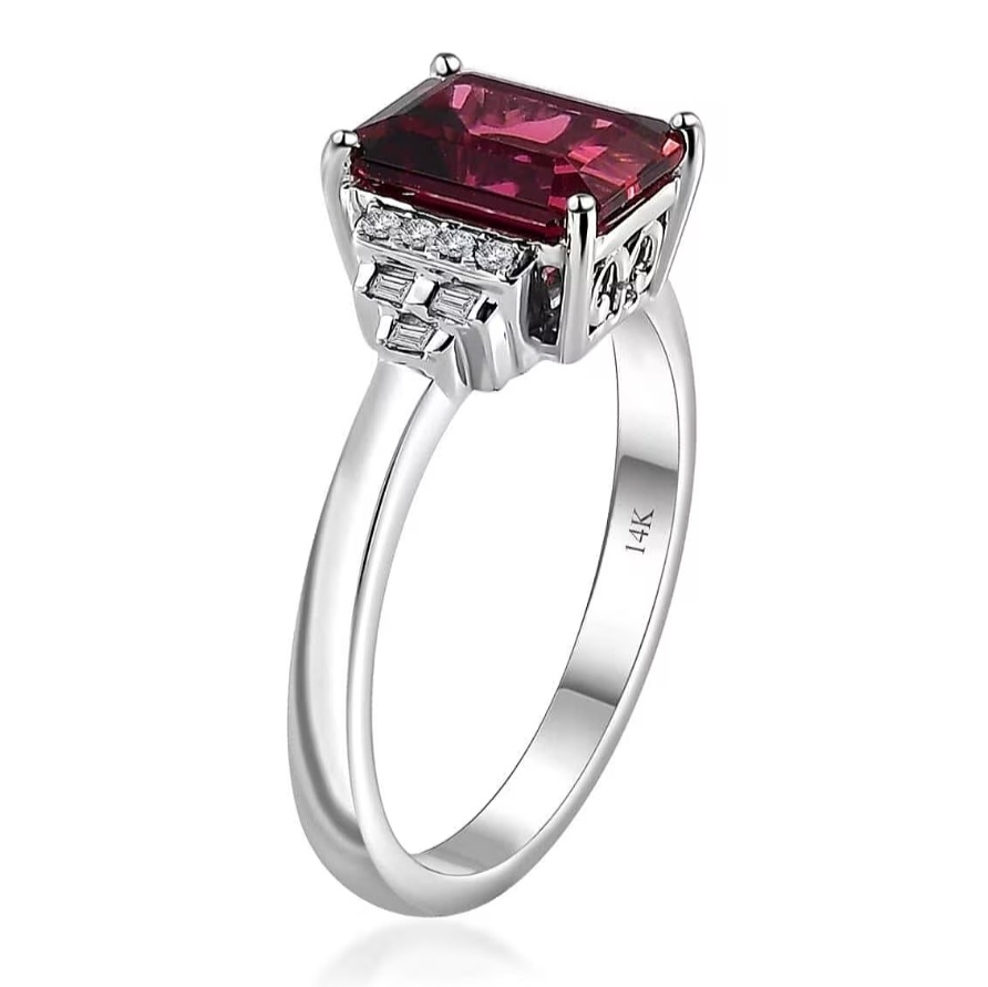 Bold, elegant, and utterly captivating — this ring showcases a 2.80ct Brazilian Rubellite Tourmaline cut into a striking emerald shape that radiates rich pink-red fire. Flanked by sparkling diamond baguettes and rounds, the geometric accents enhance the gem’s natural depth while adding refined brilliance. Set in solid 14K white gold with rhodium finish, this design balances sophistication with everyday wearability. A statement piece for collectors and connoisseurs alike.