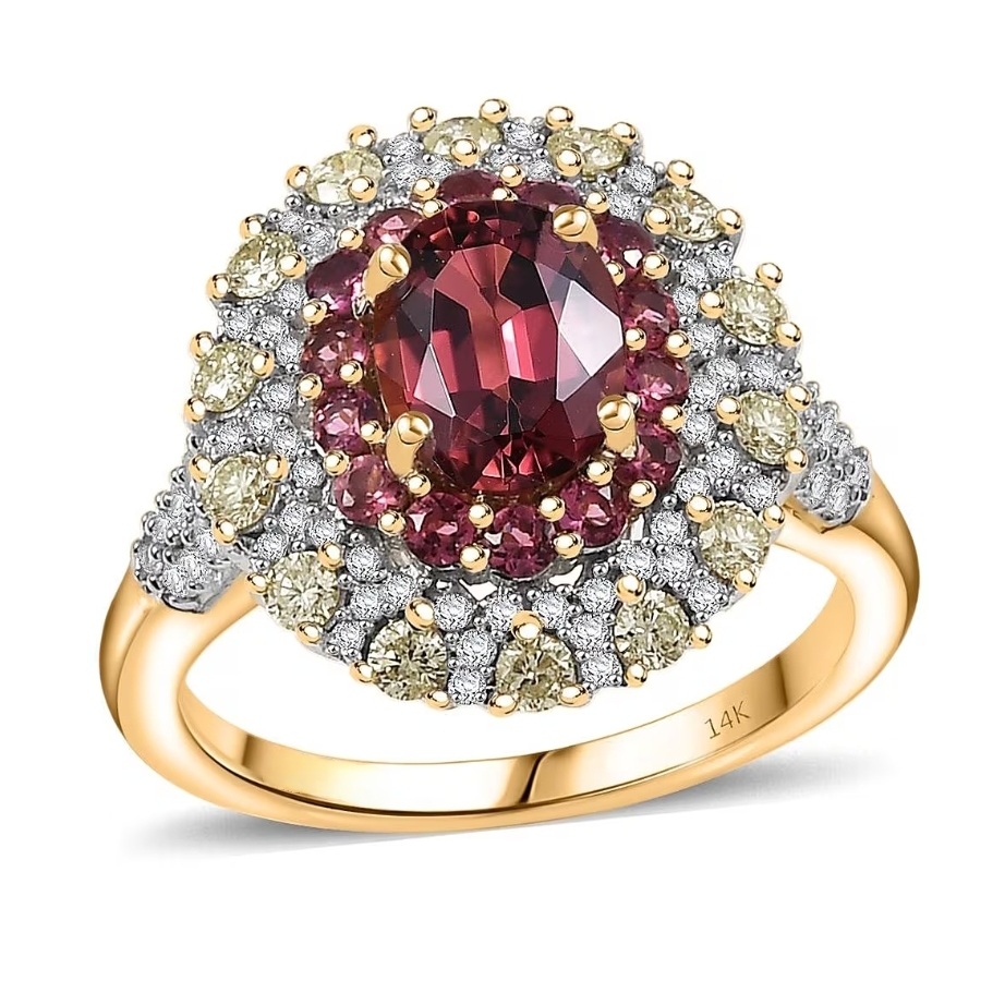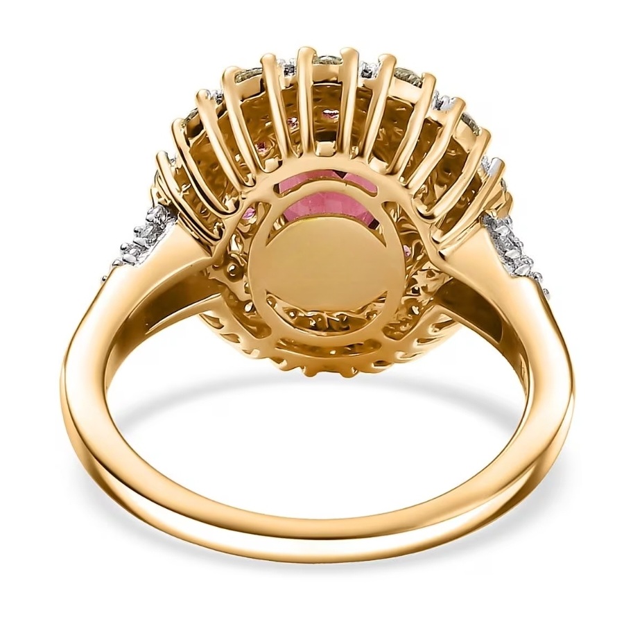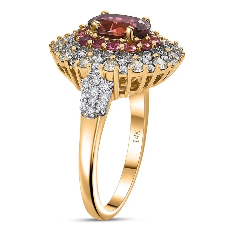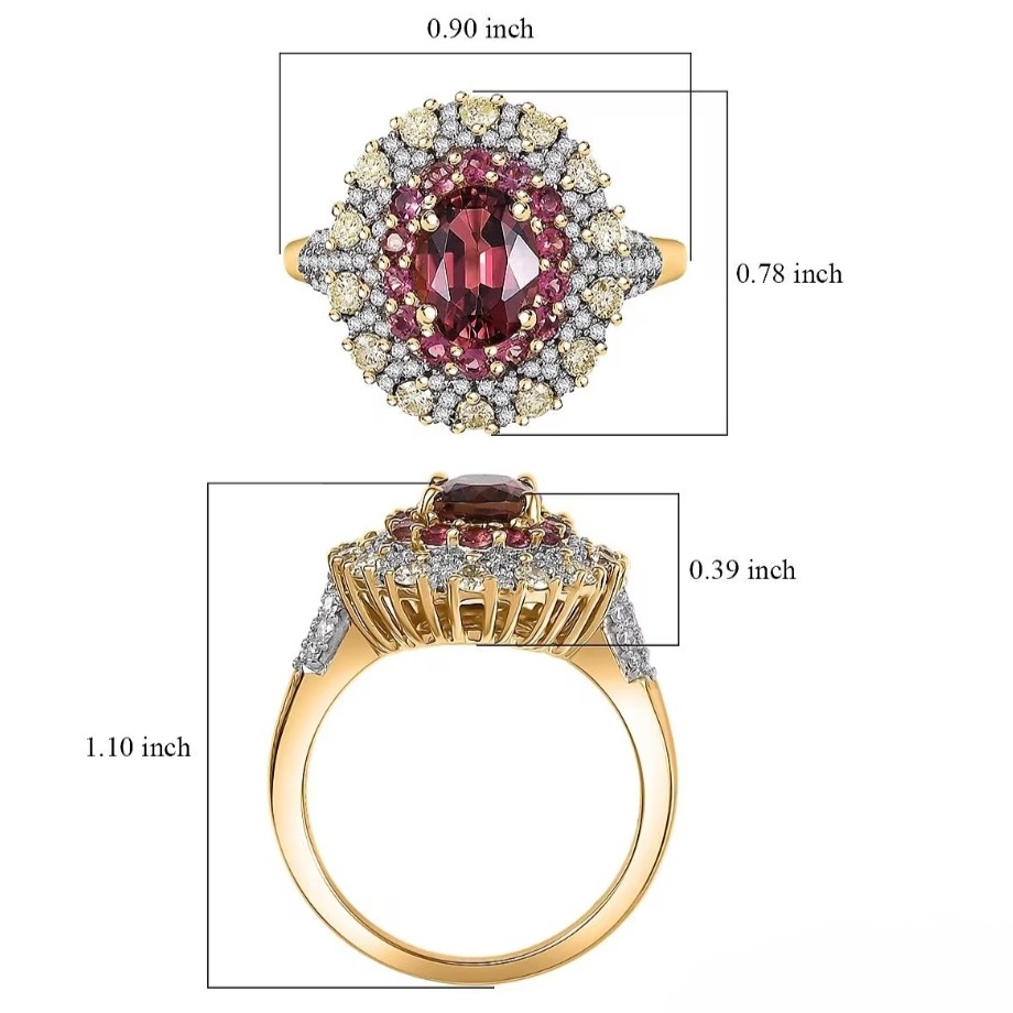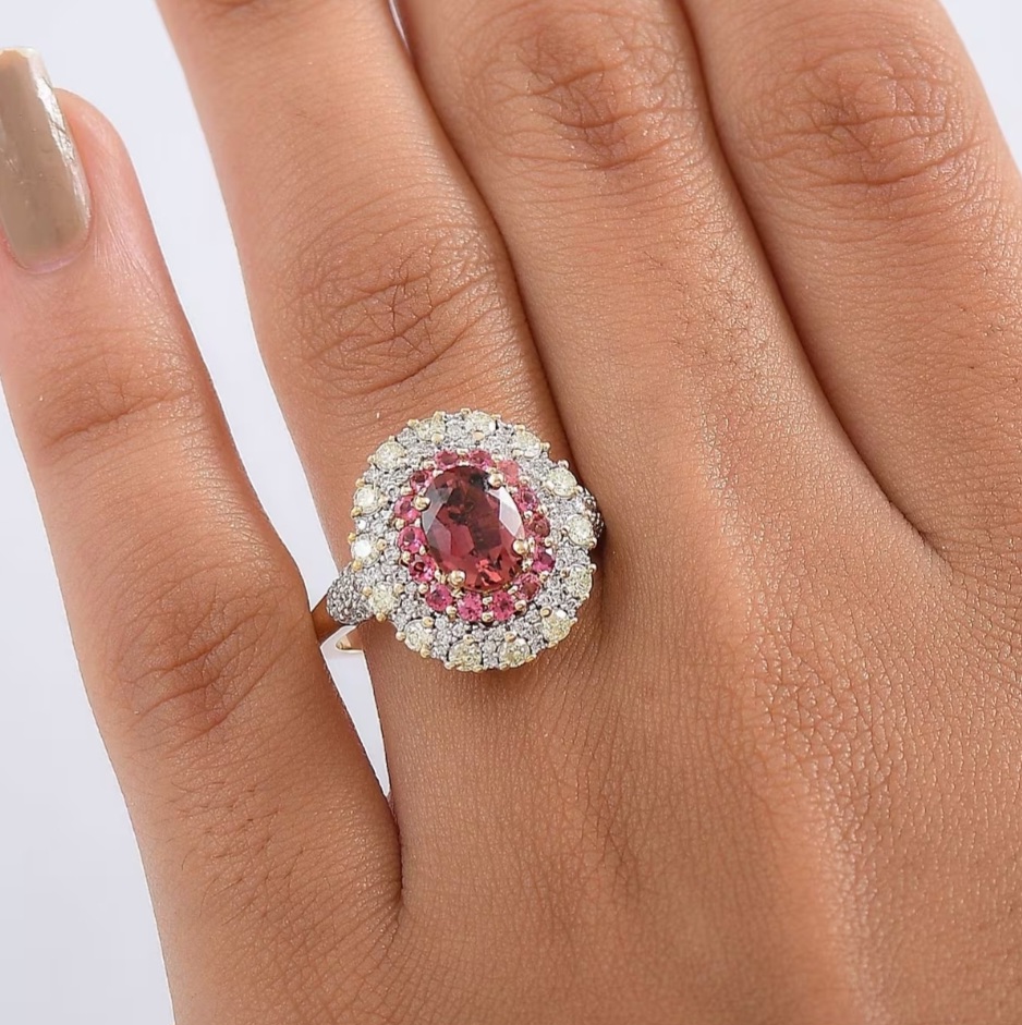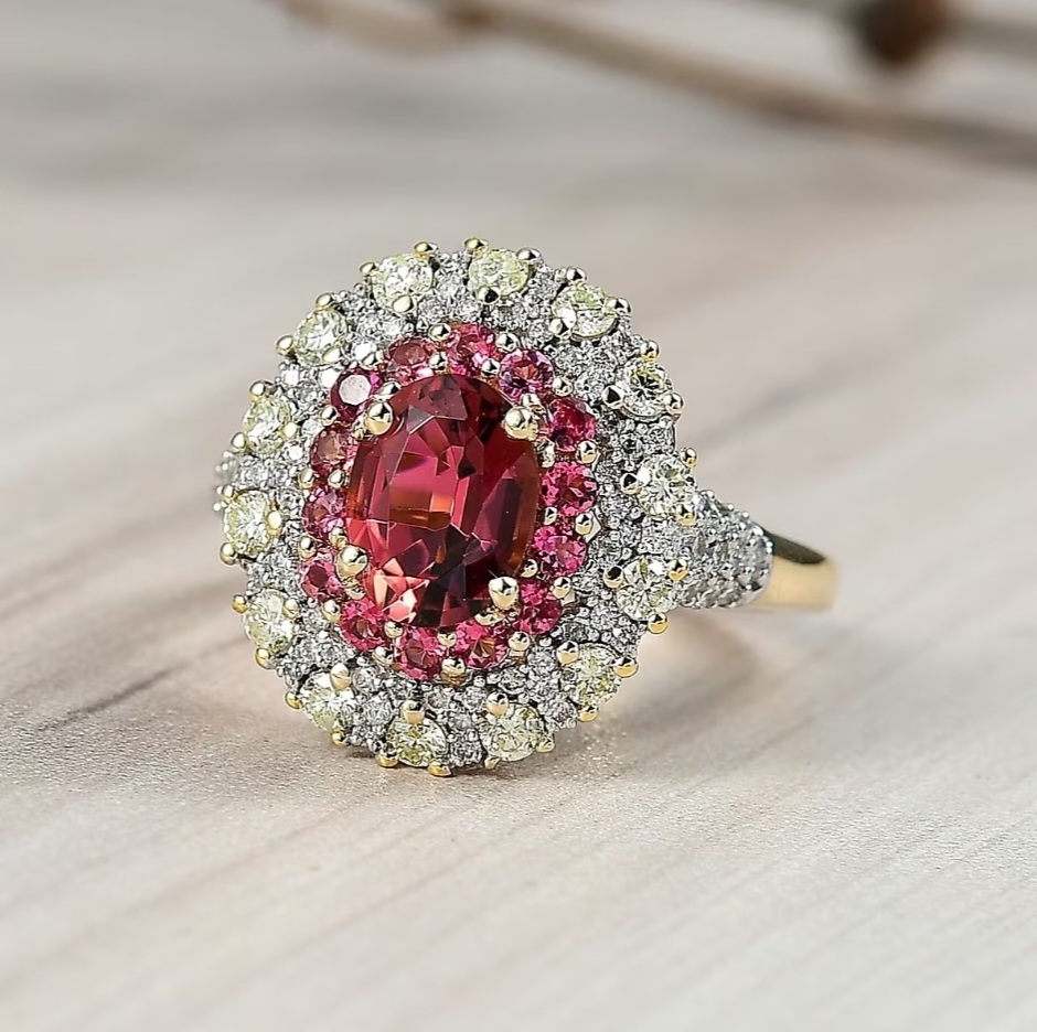 Radiating with rare color harmony, this Rubellite Tourmaline ring turns heat and brilliance into wearable art. The Brazilian Rubellite ignites with vivid pink-red intensity, framed in a double halo of natural yellow and white diamonds for a dimensional glow that shifts with every movement. Precision-set in solid 14k yellow gold, the design balances luxury and clarity — bold enough to draw attention, refined enough to keep it. The smooth, sculpted gallery and crisp diamond symmetry give this piece the balance of fine craftsmanship and high-voltage allure.