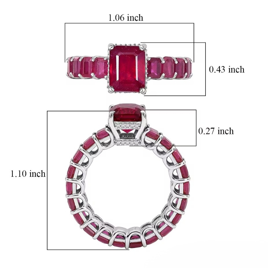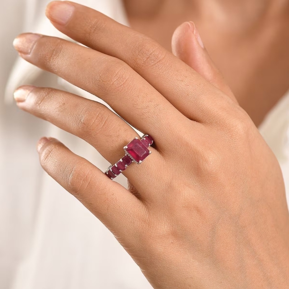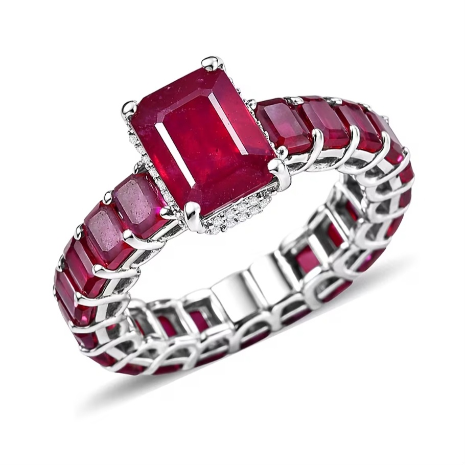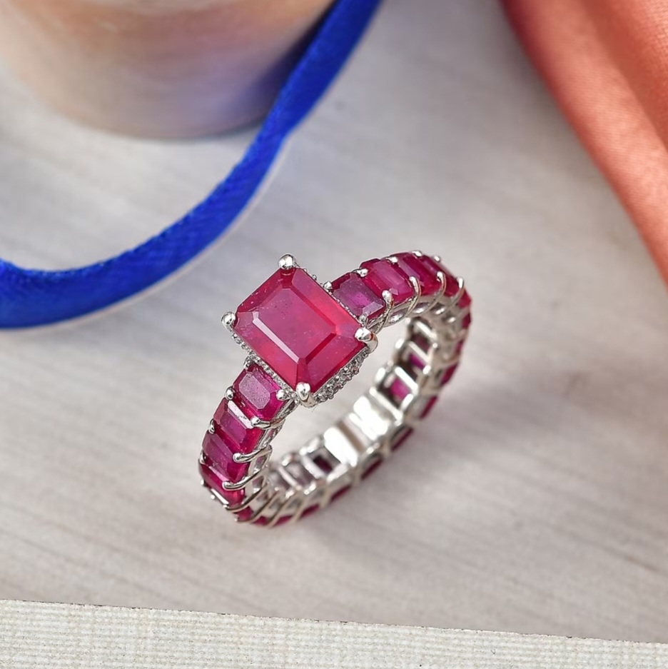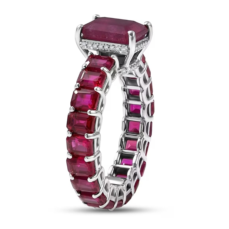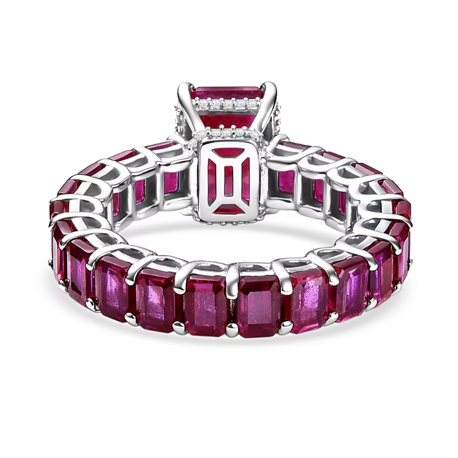 This Mozambique ruby ring combines a full eternity-style layout with a defined center feature, creating a continuous band of vivid red with a clear focal point. Emerald-cut rubies run around the band, forming an unbroken line of strong, saturated color.