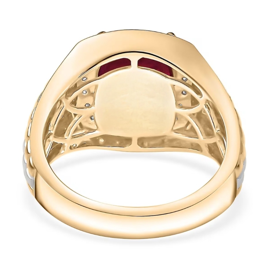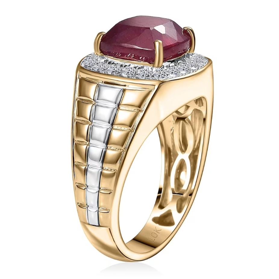 Crafted in solid 10k yellow and white gold, the two-tone construction is deliberate. Warm yellow gold forms the body of the ring, while white gold elements highlight the halo and accent details, creating separation between metal, diamond, and ruby. The wide shank and reinforced top give the ring real substance, with a low-profile build that keeps it comfortable for daily wear.