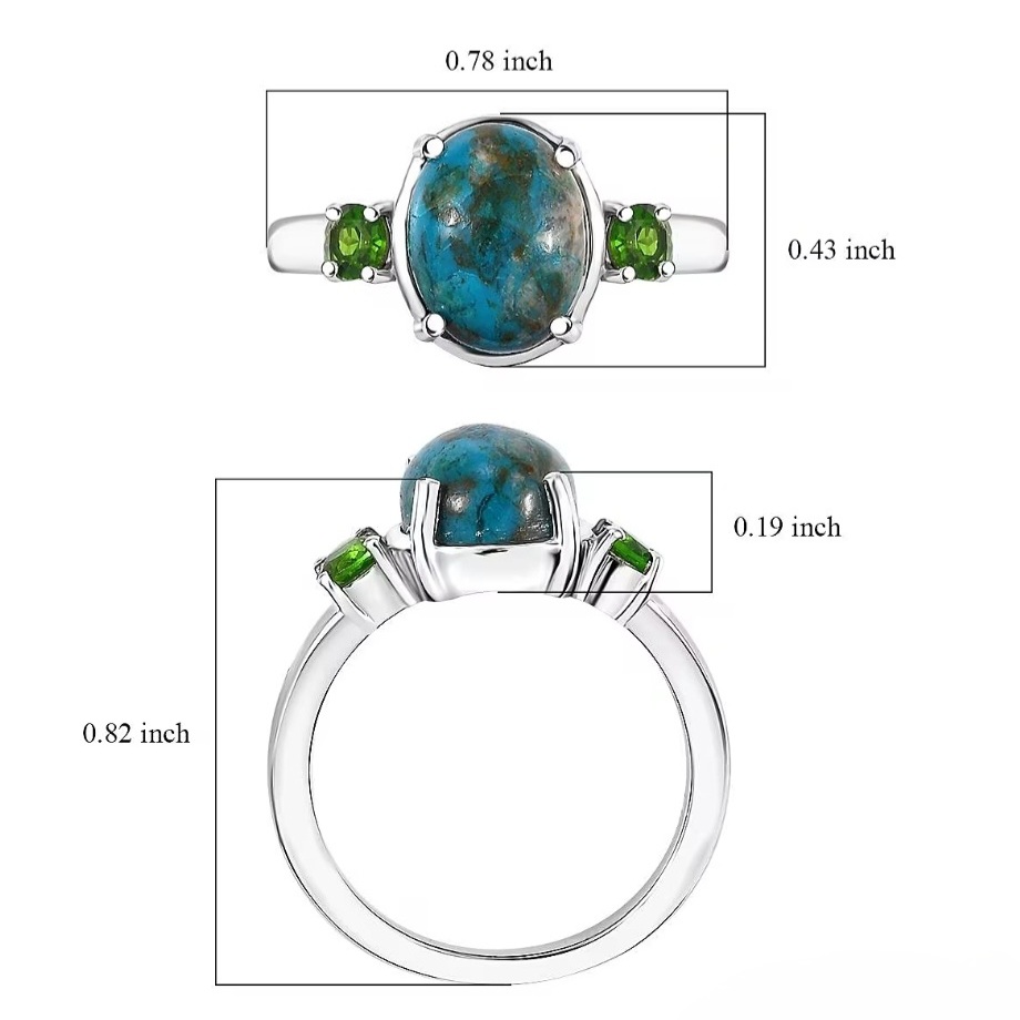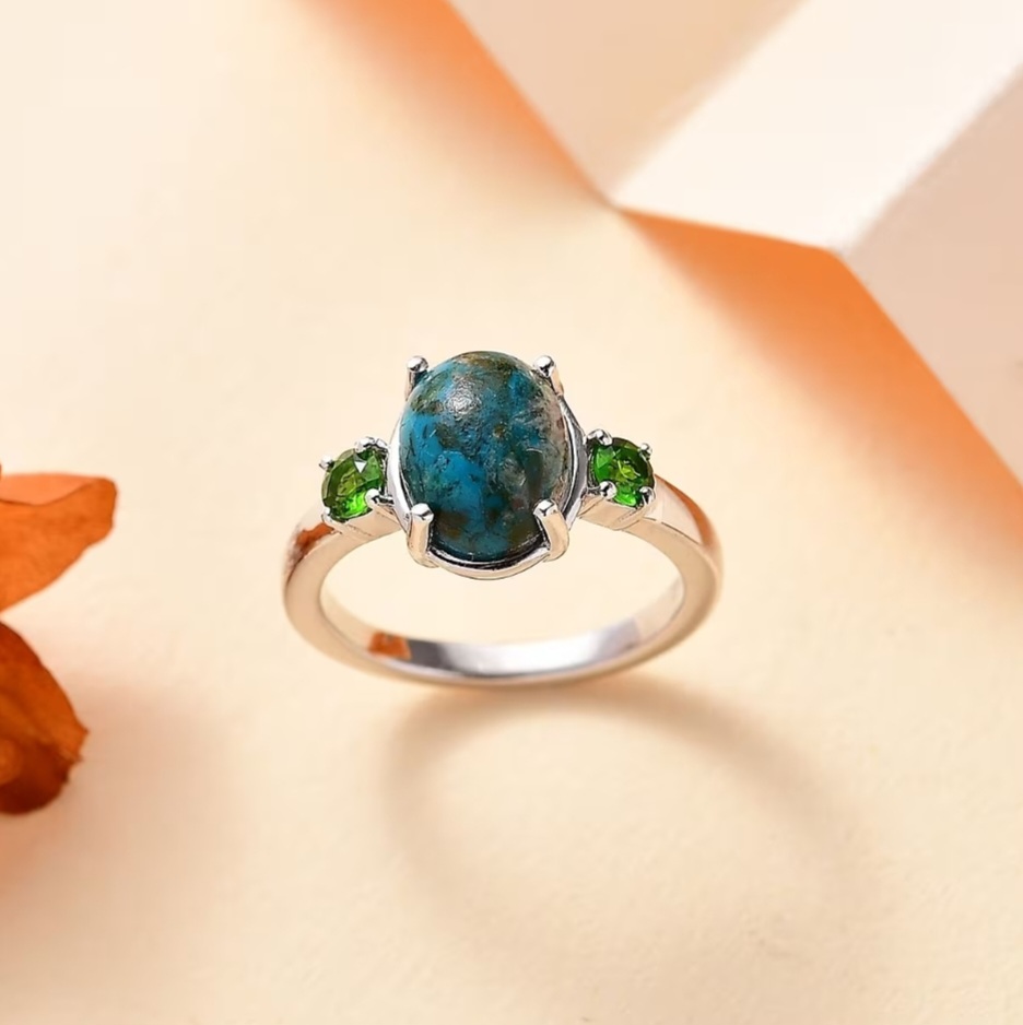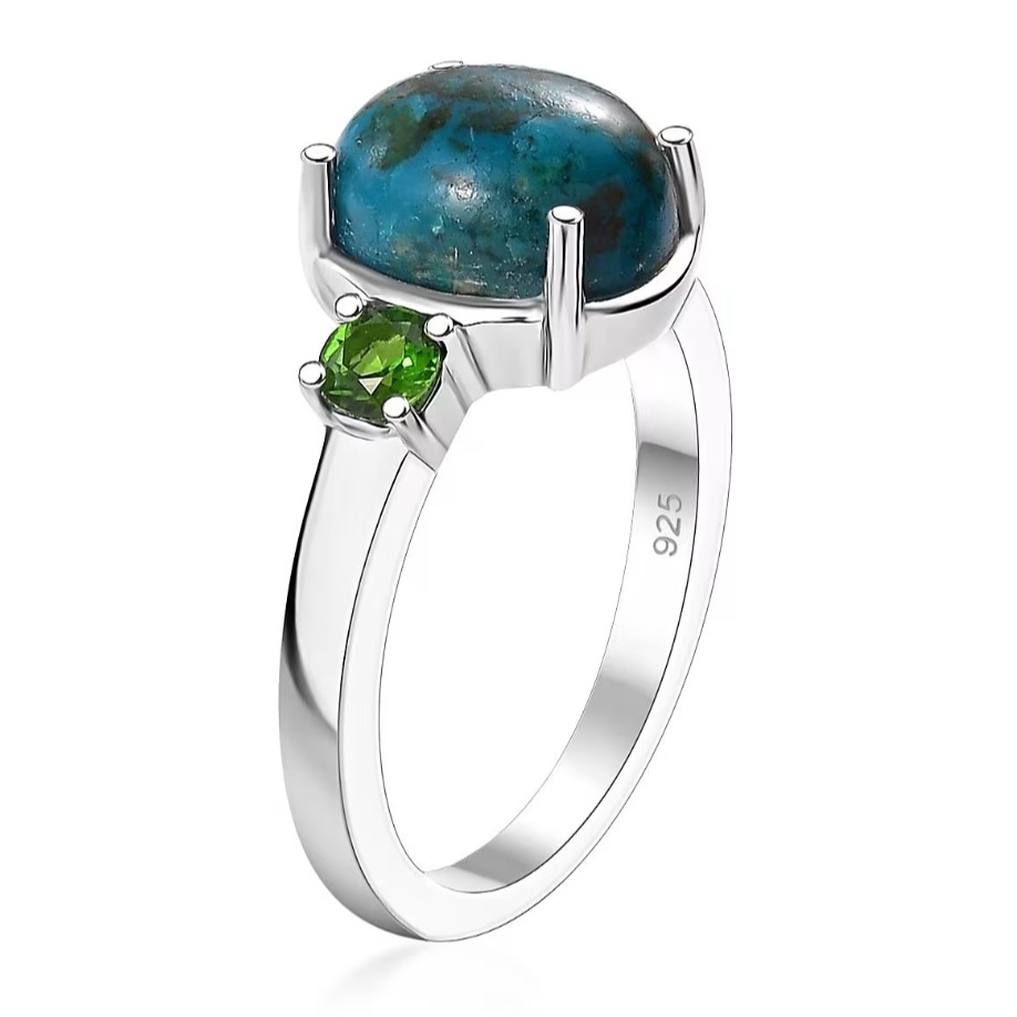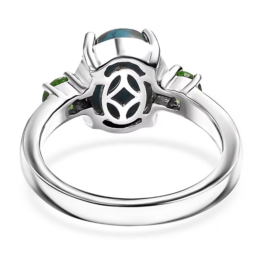 Flanking the center are two round chrome diopsides totaling 0.45 carats. Their vivid green saturation creates striking contrast against the blue Shadowkite, giving the ring a crisp, color-forward presence without unnecessary embellishment.