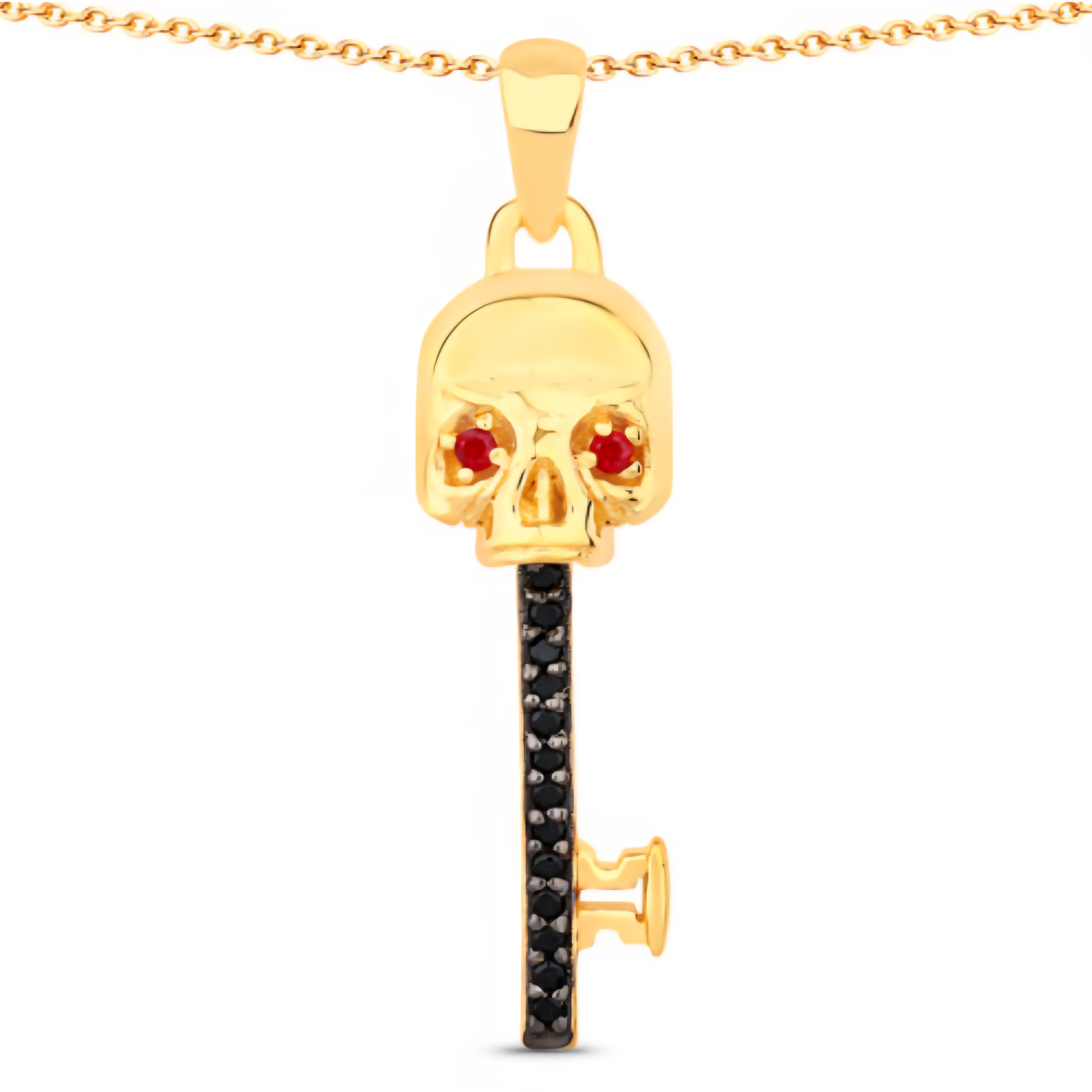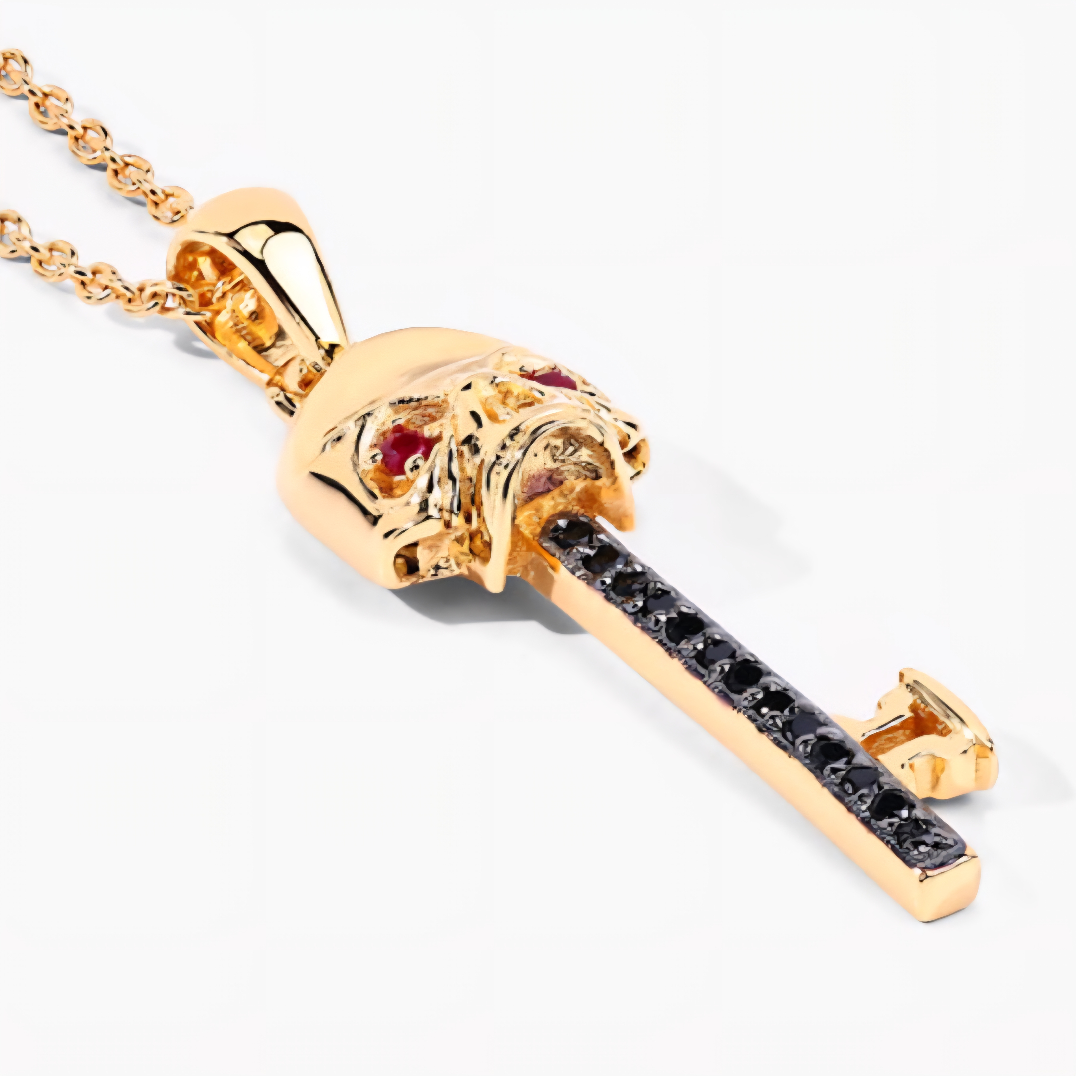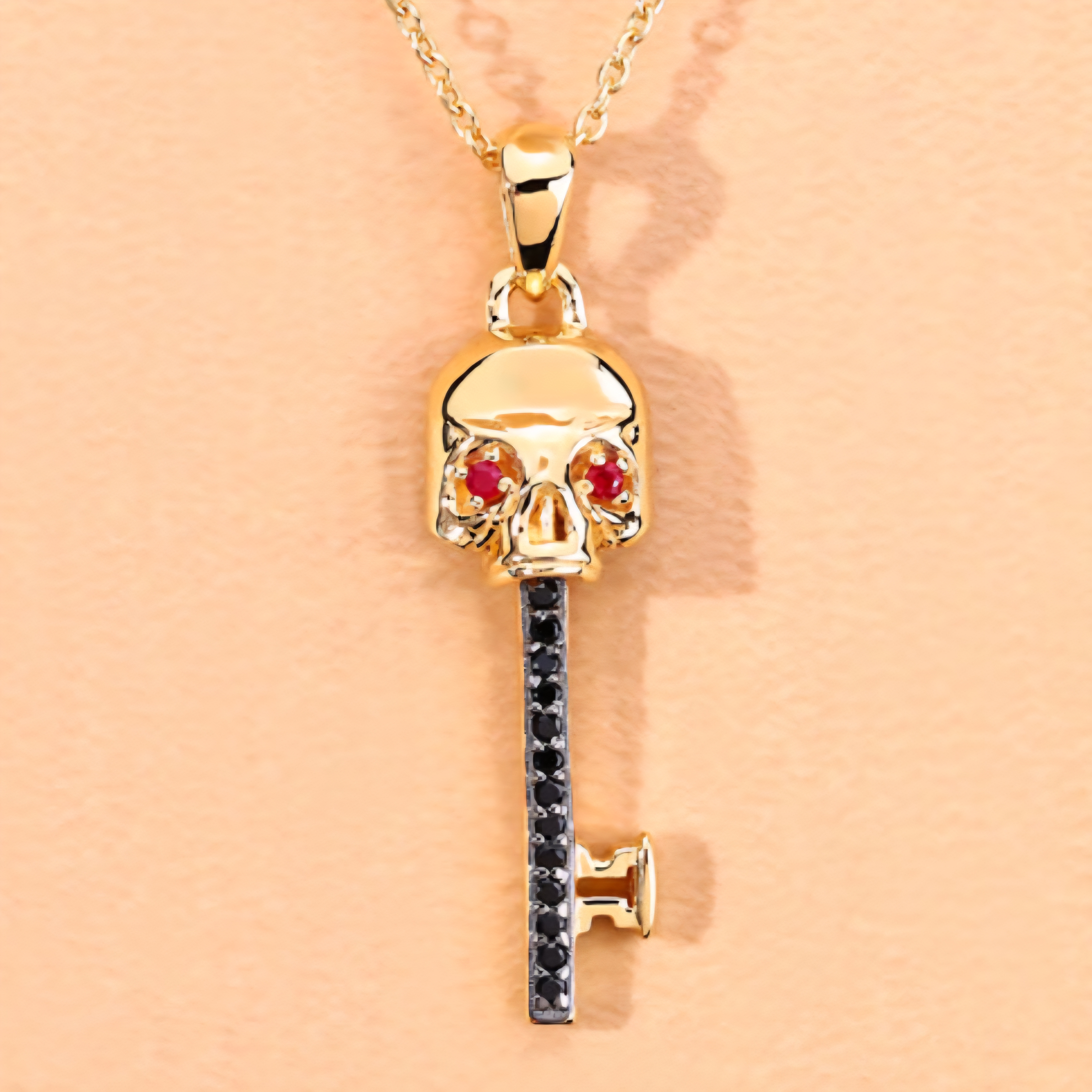 The key to chaos — and you know you want to turn it. This Skull Key Pendant fuses fine jewelry with rebellion, featuring a sculpted skull crowned in 18K yellow gold with blazing ruby eyes and a stem lined with black spinel. The mix of red fire and jet-black shimmer hits that perfect balance between danger and luxury. It’s not subtle. It’s not safe. It’s Gallery Gems gothic — designed for those who unlock doors others are too afraid to touch.