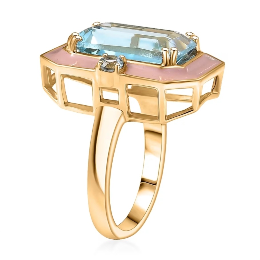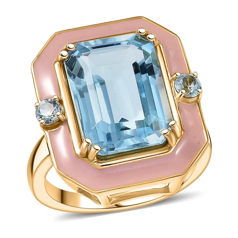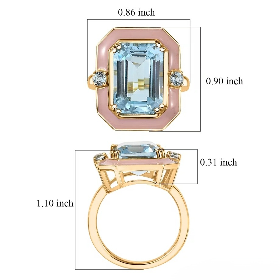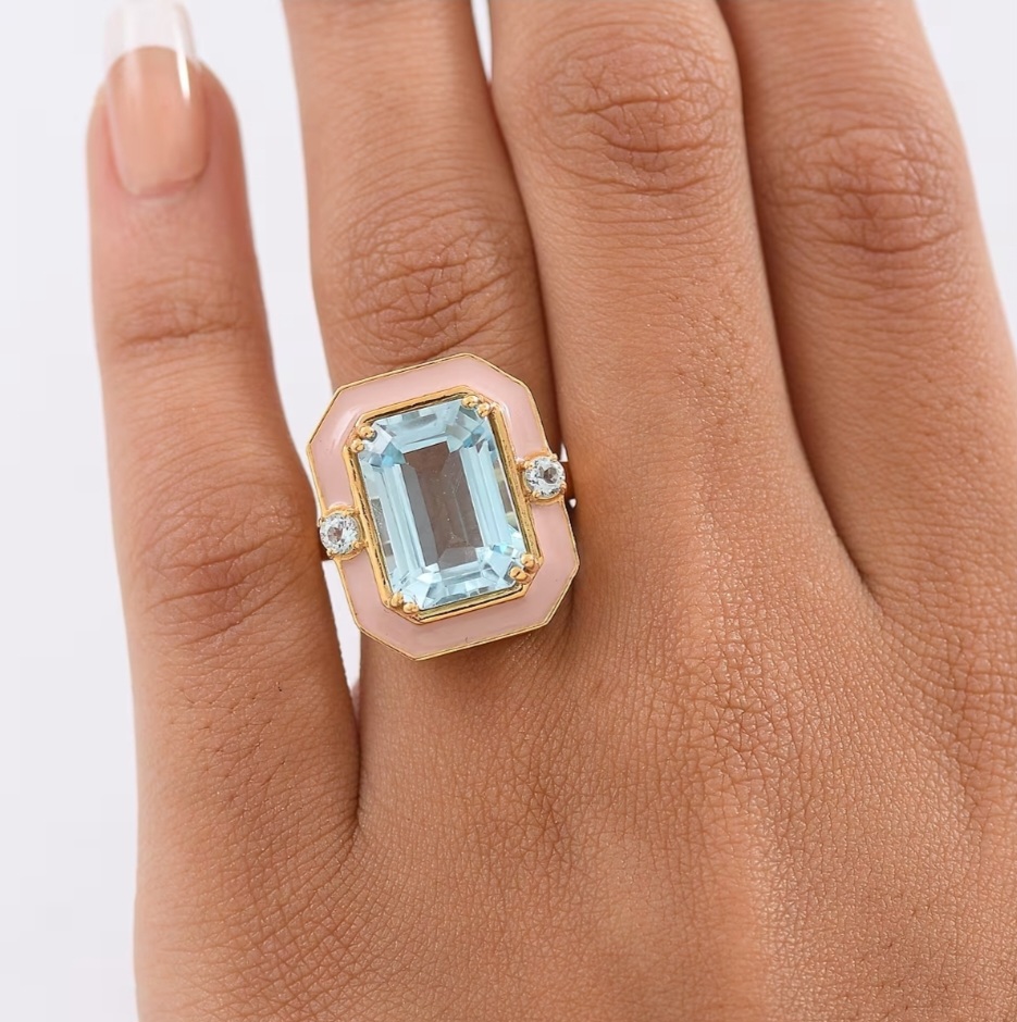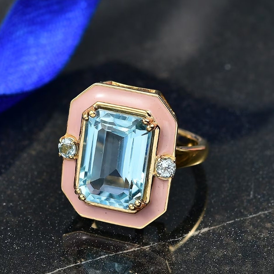 A bold pink enamel frame surrounds the center stone, creating a high-contrast color block that makes the sky-blue topaz read even brighter. Two matching 3mm round Sky Blue Topaz accents (0.25ctw total) add balanced pops of blue at the sides, reinforcing the color story without overcomplicating the design.