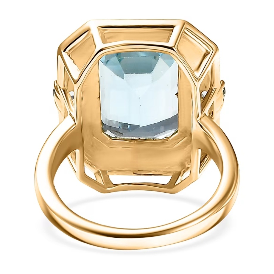 This statement ring centers on a 14x10mm emerald-cut Sky Blue Topaz weighing 7.65 carats. The step-cut faceting gives it crisp flashes and a clean, architectural look — all clarity and line, not scattered sparkle.