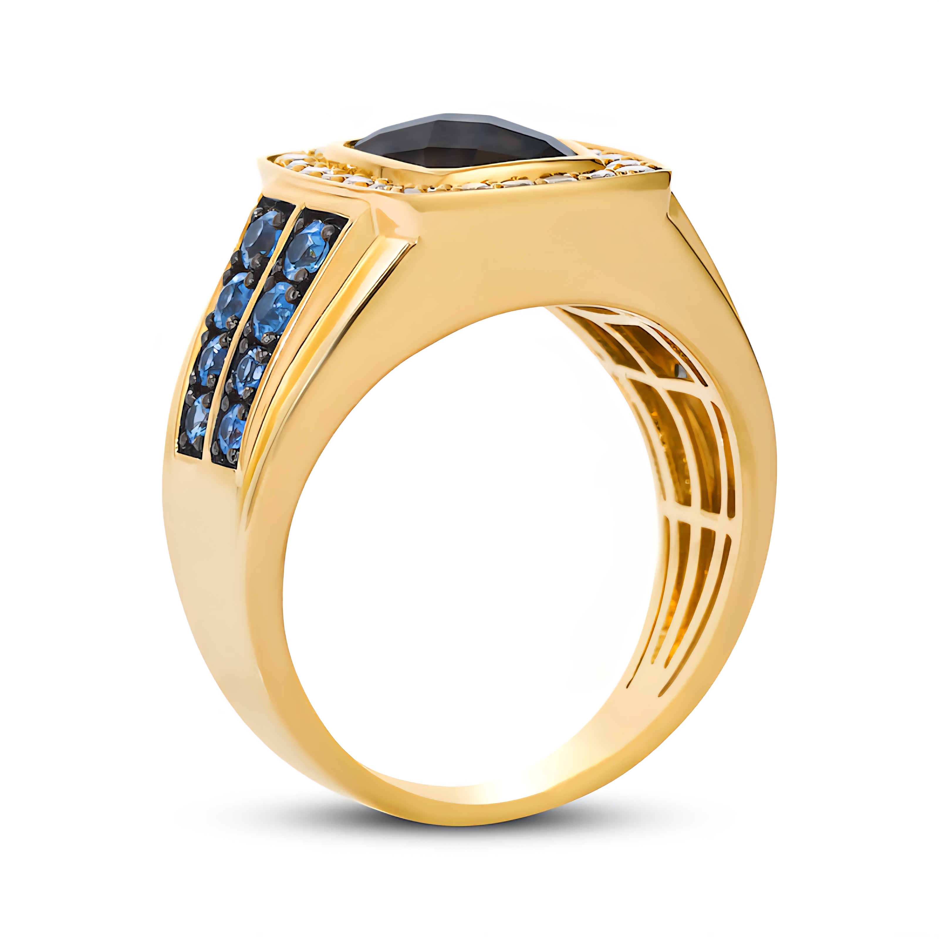 This ring makes its presence known. At the center, a cushion-cut smoky quartz shows rich brown depth with every turn. Deep blue sapphires run down the shoulders for sharp contrast, while a halo of natural diamonds delivers pure fire. Set in solid gold, this design isn’t shy or delicate. It’s bold, heavy, and unapologetically Real AF.