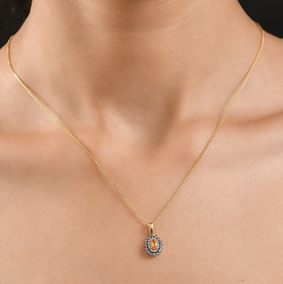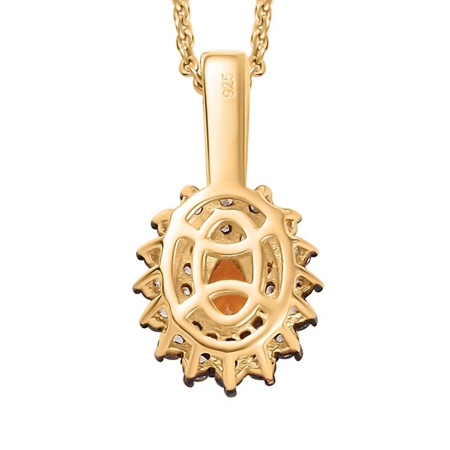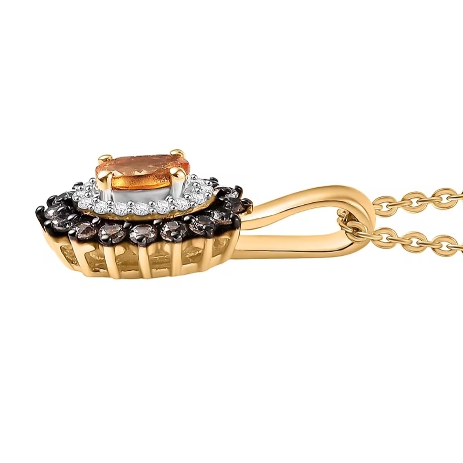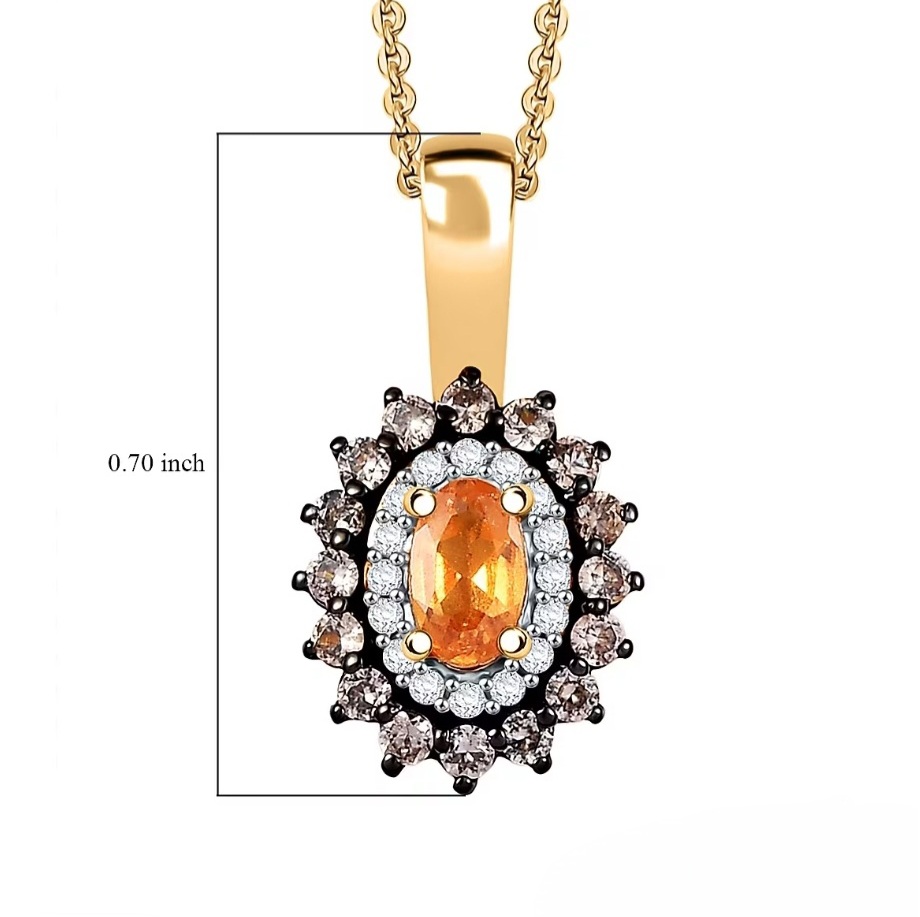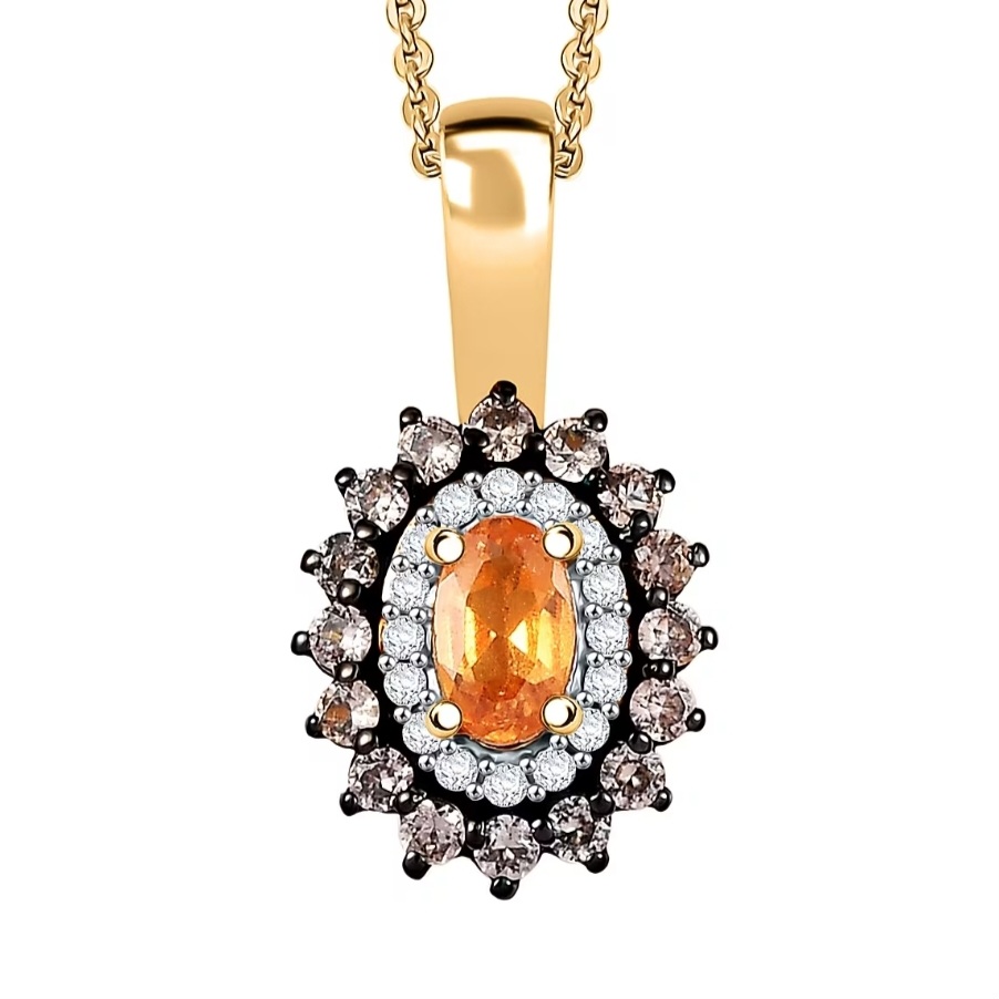 This pendant features a vivid 0.32 ct Tanzanian Spessartine Garnet — glowing with sunset-orange brilliance — encircled by a double halo of brown and white zircon. The inner halo adds light and sparkle, while the darker outer ring brings contrast and depth. Together, they create a luxurious radiance that feels both vintage and modern.