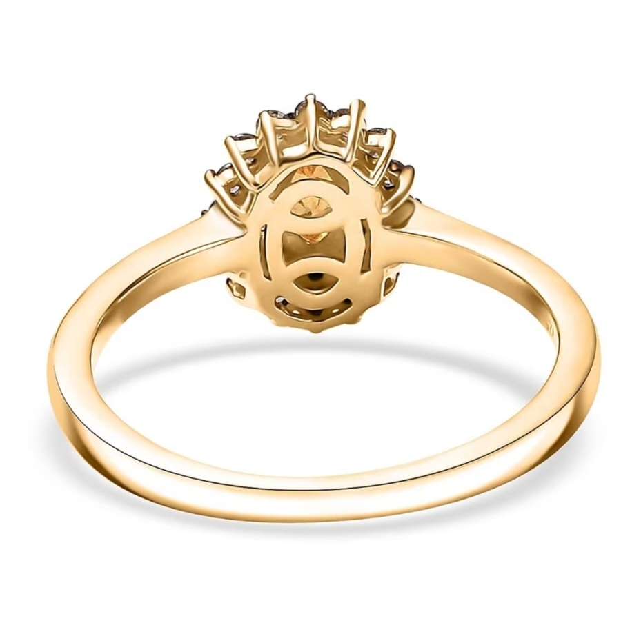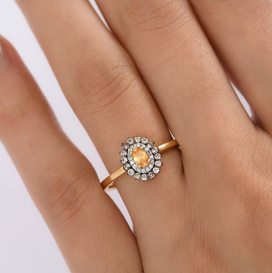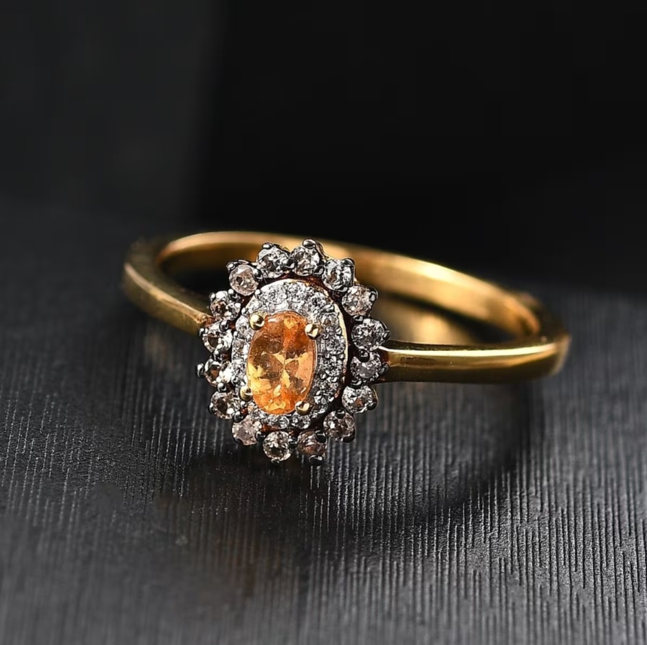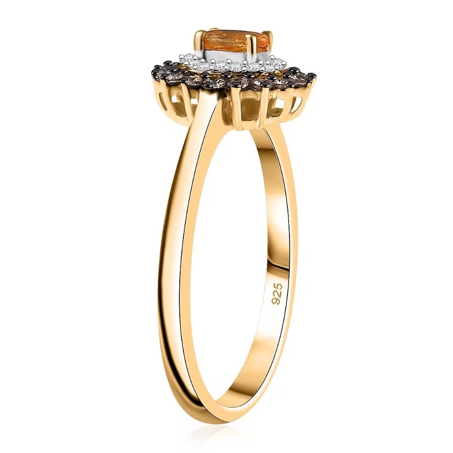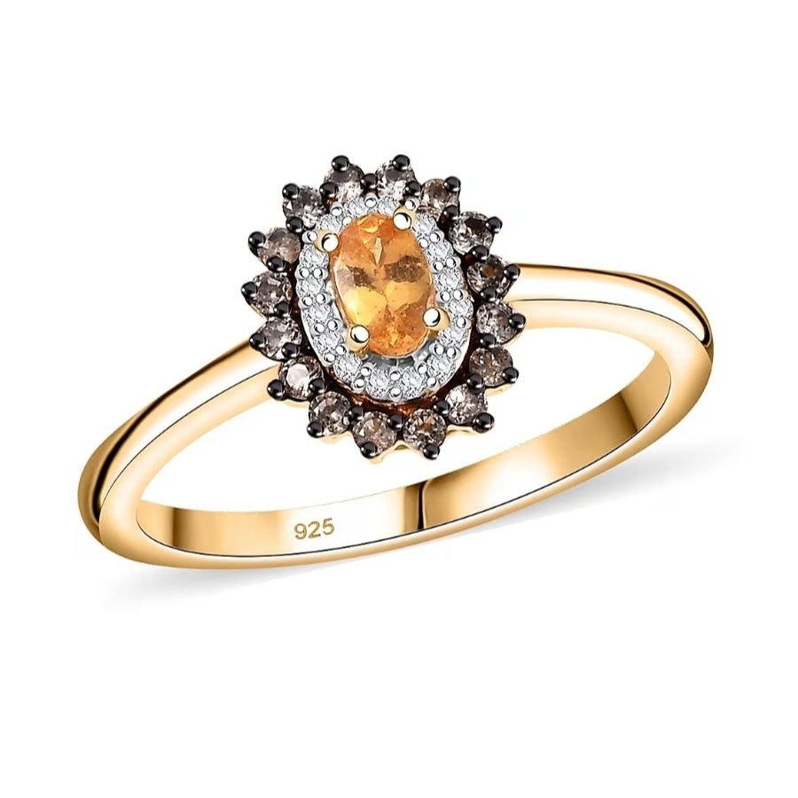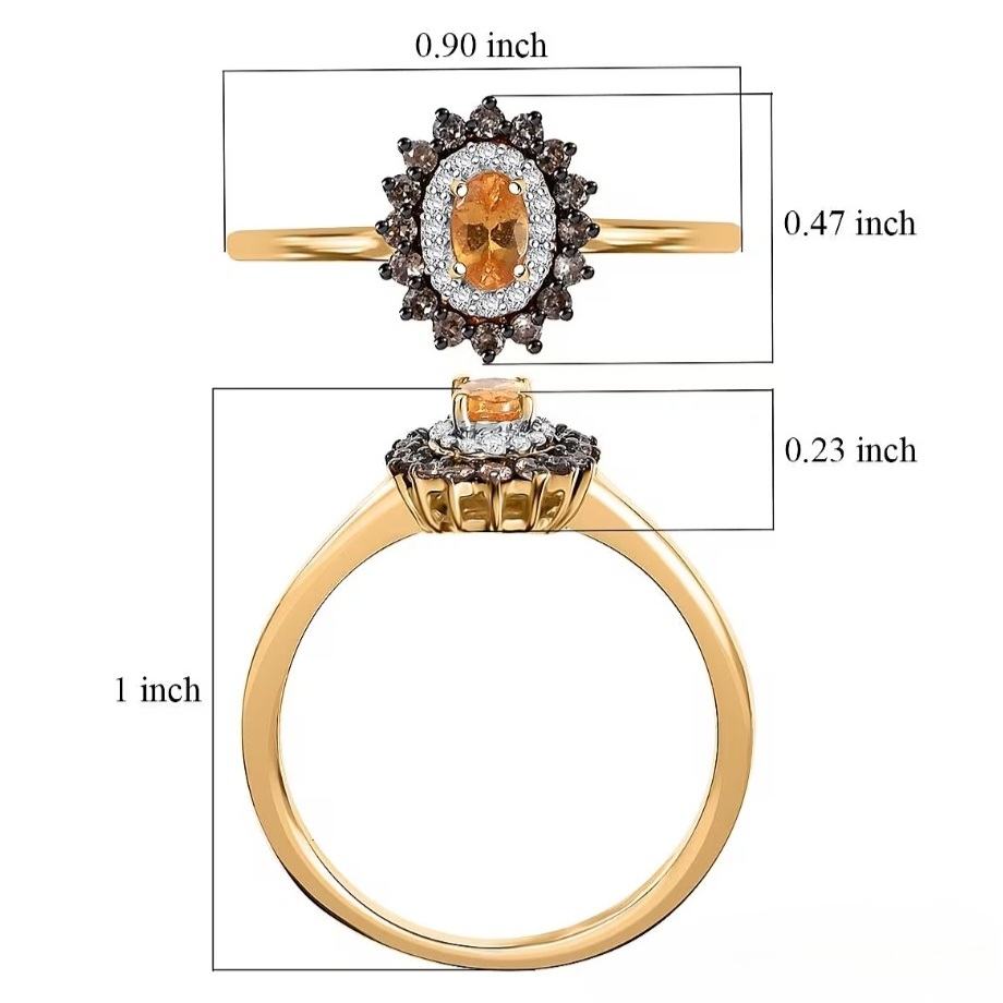 Bright, elegant, and full of warmth — this double halo ring highlights the vibrant orange glow of Tanzanian Spessartine Garnet surrounded by contrasting halos of white and brown zircon. The 5×3mm oval center stone radiates fire and brilliance, framed by sparkling pavé-set accents that create depth and definition. Crafted in solid sterling silver with luxurious 18k yellow gold plating and rhodium highlights, this piece offers the perfect balance of fine detailing and everyday sophistication.