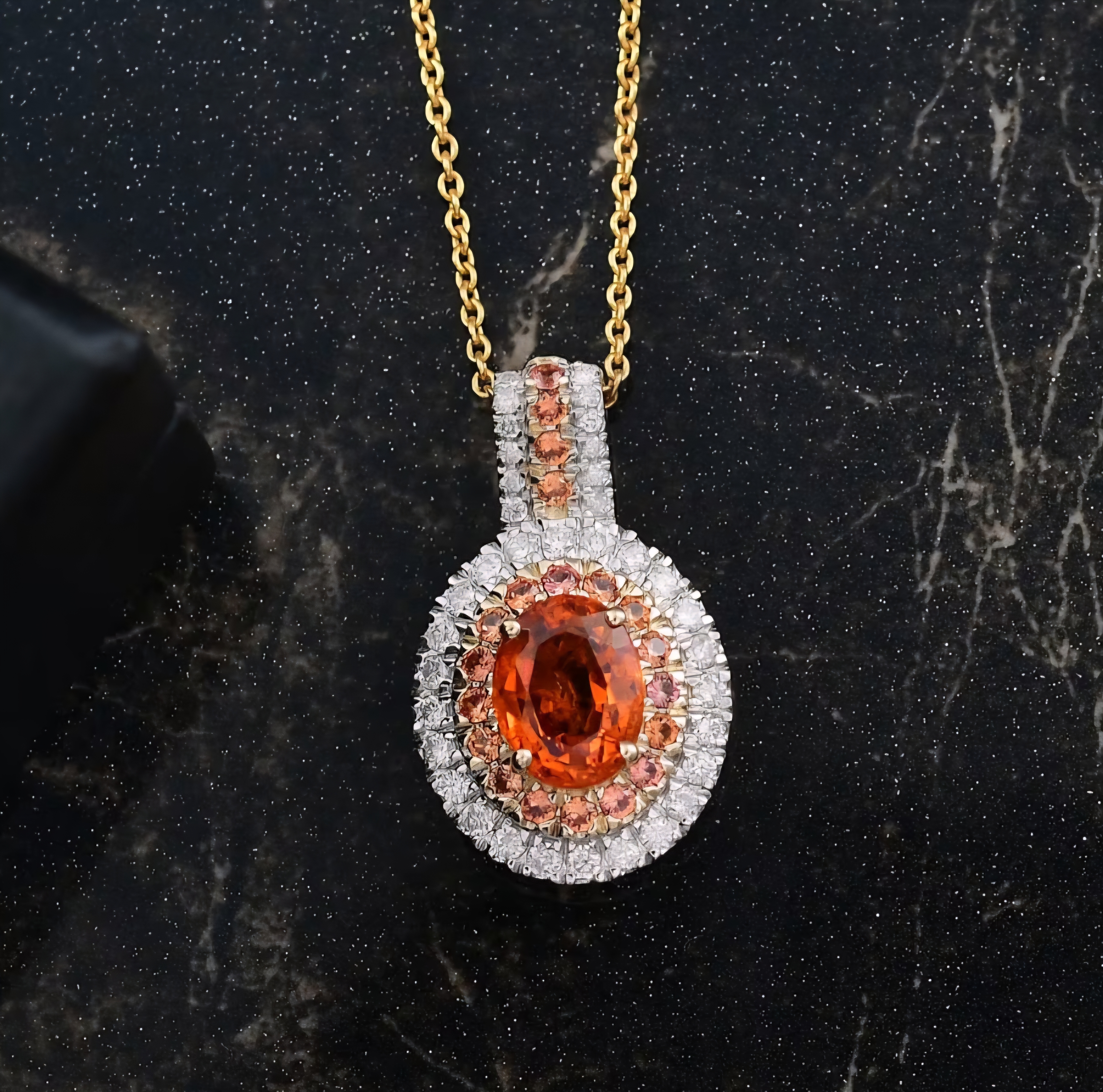Adorn yourself with the captivating glow of this exquisite halo pendant necklace. A vibrant oval spessartine garnet, with its rich mandarin orange hue, takes center stage, radiating warmth and energy. It's embraced by a delicate inner halo of rare padparadscha sapphires, their unique blend of pink and orange adding a touch of subtle elegance. A further outer halo of sparkling white diamonds enhances the brilliance of the central gemstones, creating a truly captivating effect. The pendant is crafted in warm 10K yellow gold, suspended from a matching chain.