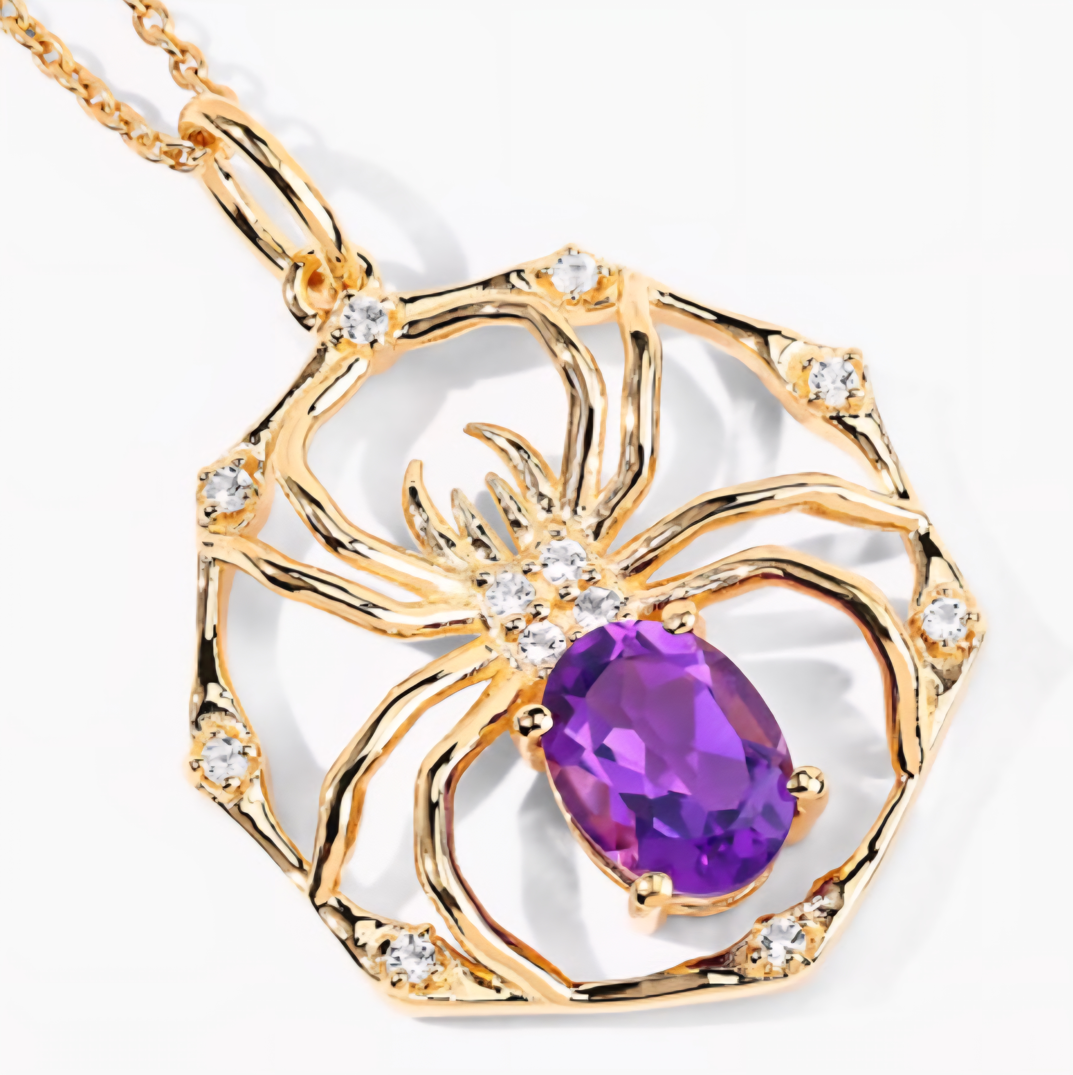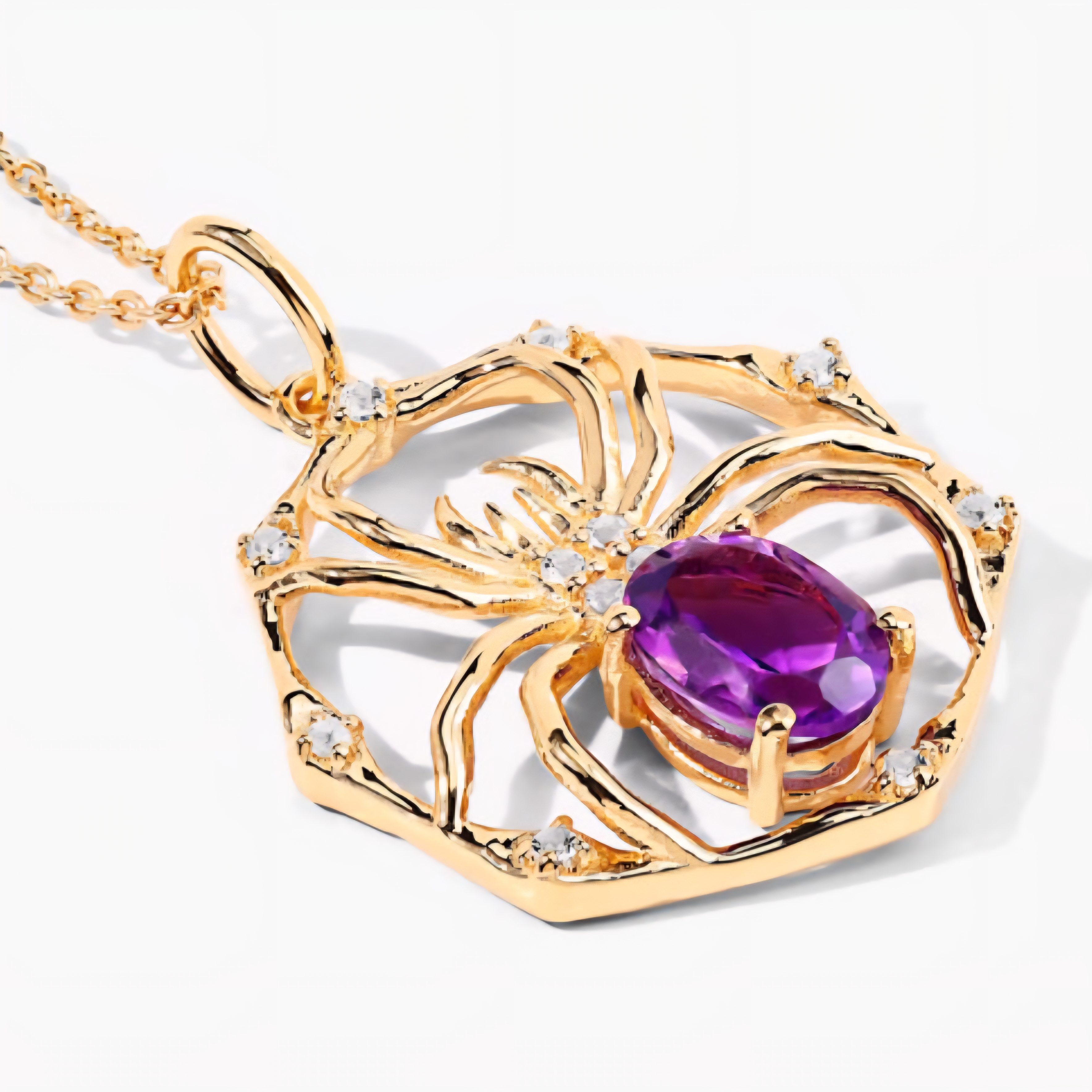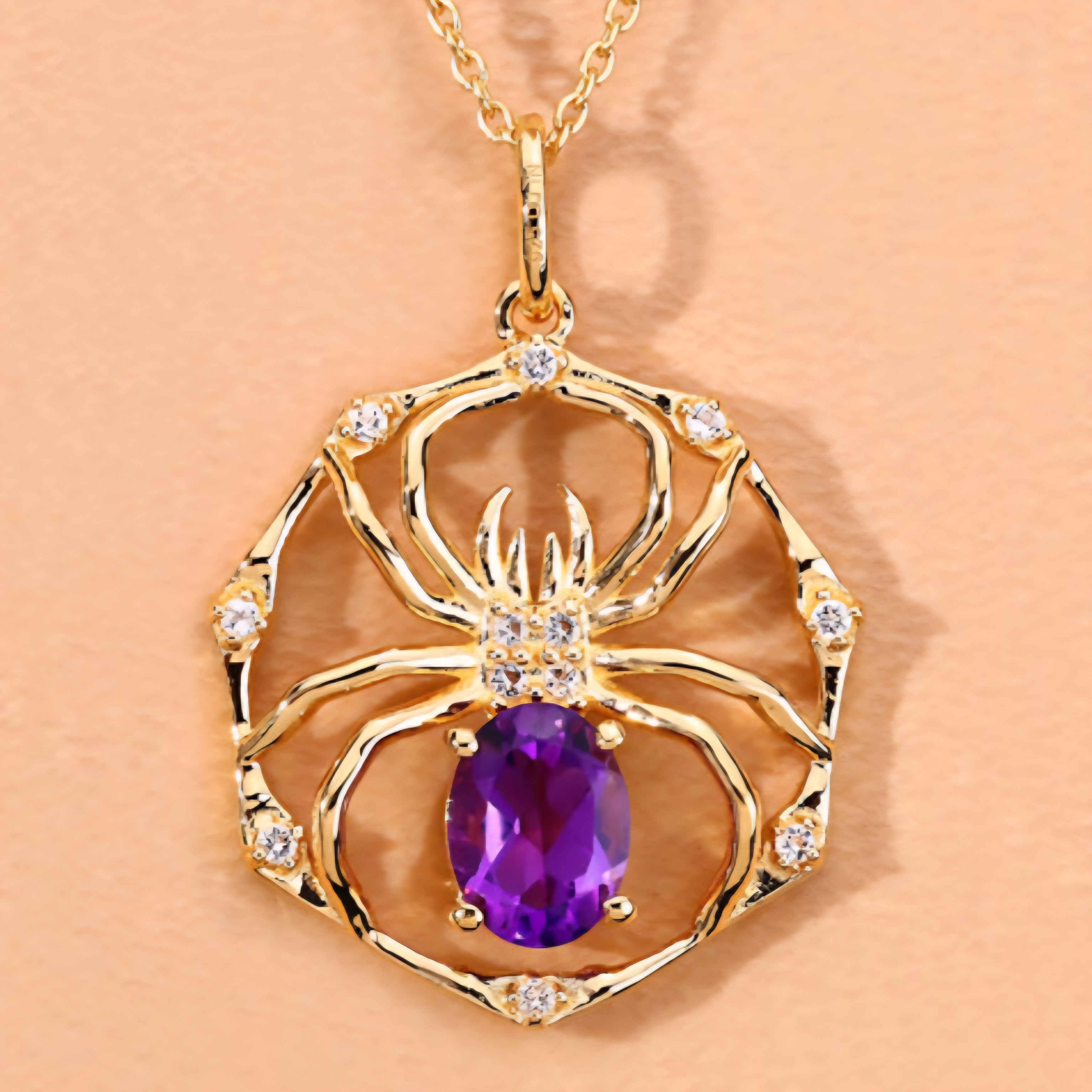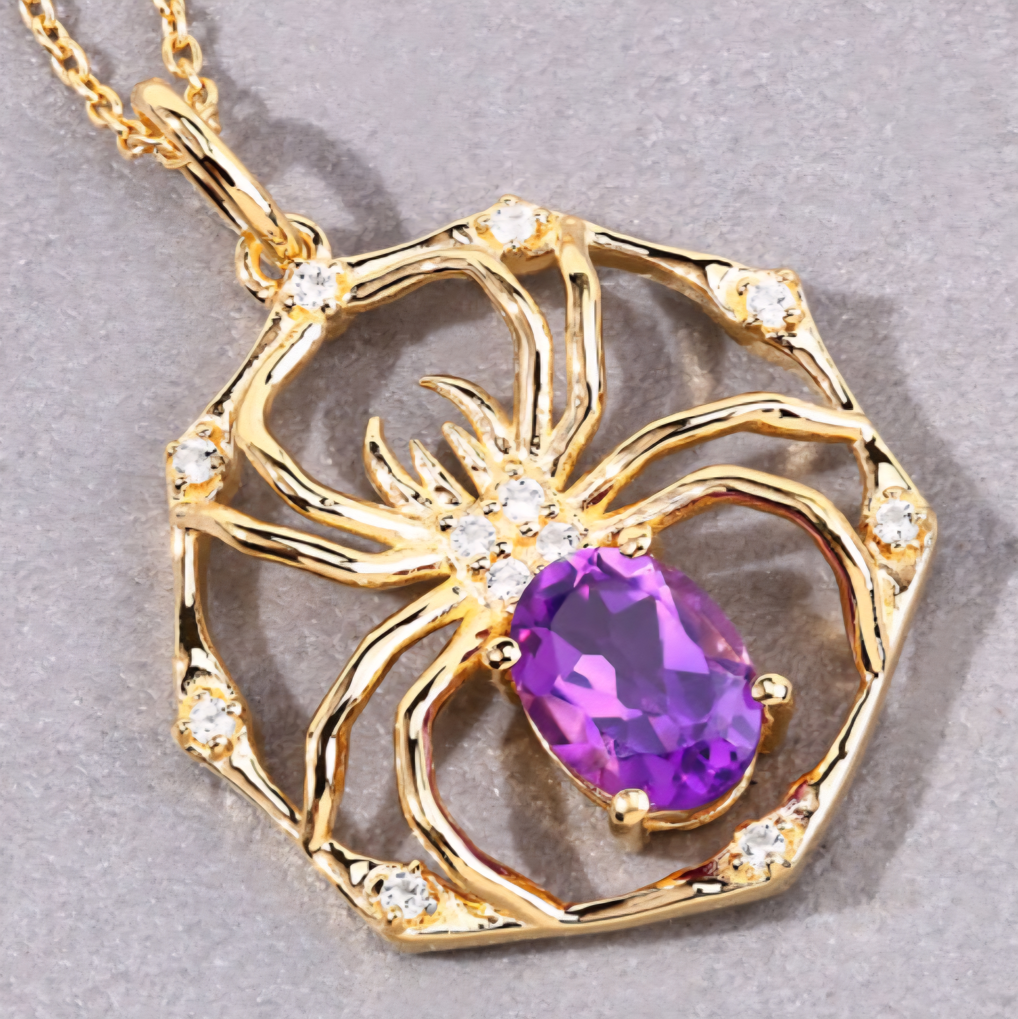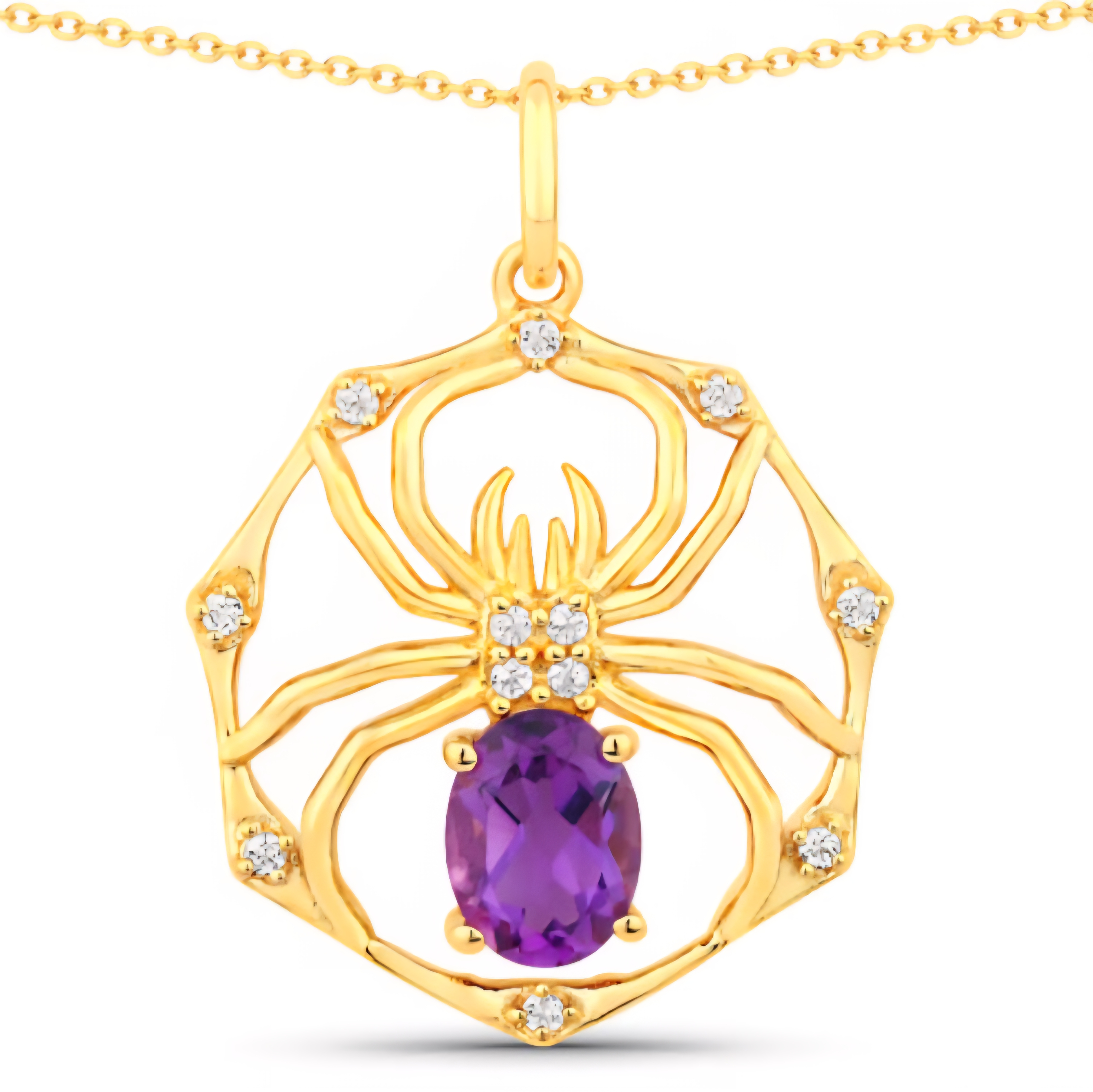 A spider spun in gold — fierce, elegant, and completely magnetic. This pendant necklace weaves an intricate web design centered around a vivid 8x6mm oval-cut amethyst, gleaming with royal purple intensity. White topaz accents glimmer like dew drops along the web, amplifying every curve and shadow of the design. Crafted in solid 925 sterling silver and finished with rich 18K yellow gold plating, this piece walks the line between gothic luxury and high-fashion brilliance. Statement energy, sealed in shimmer and symmetry.