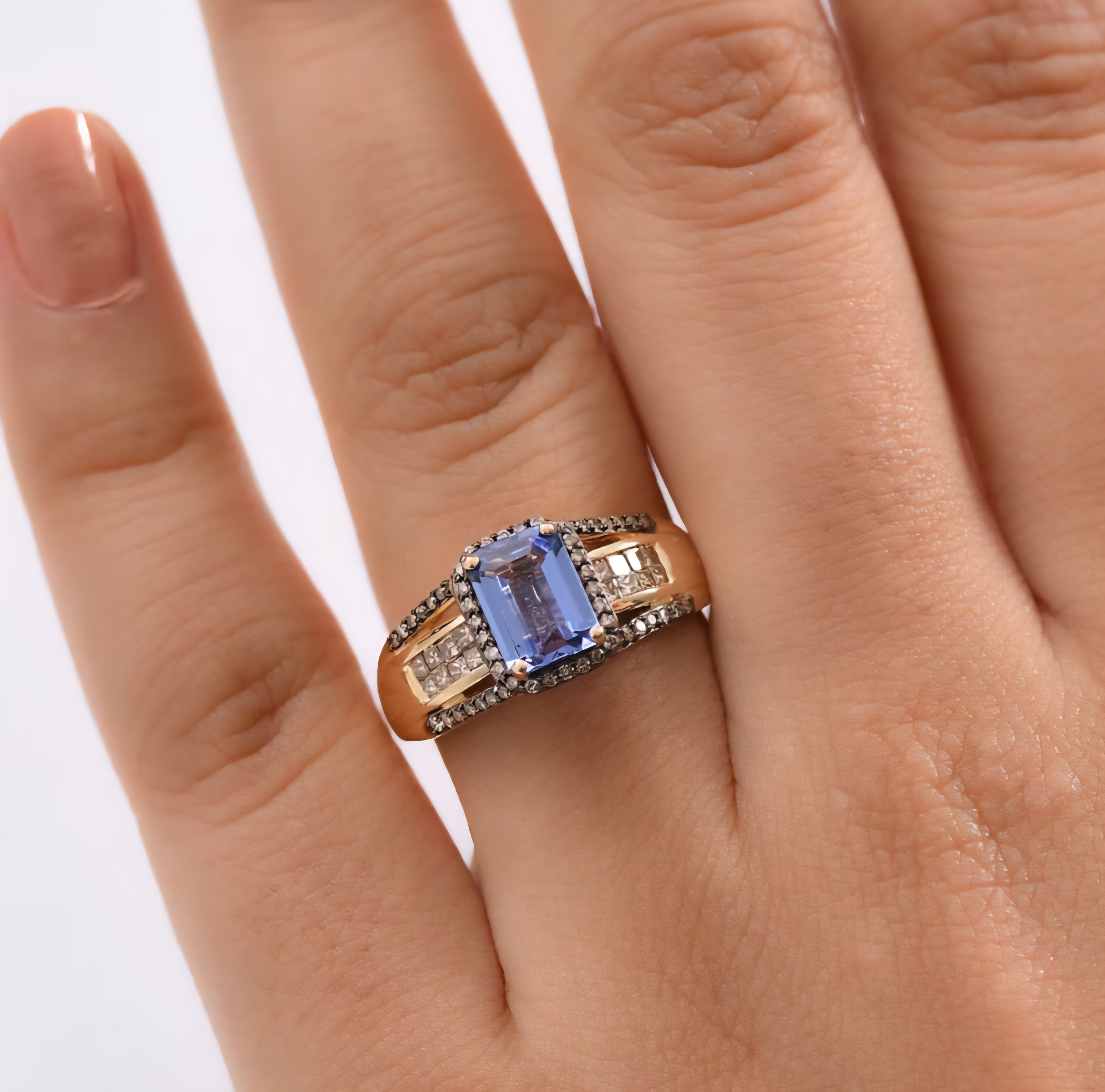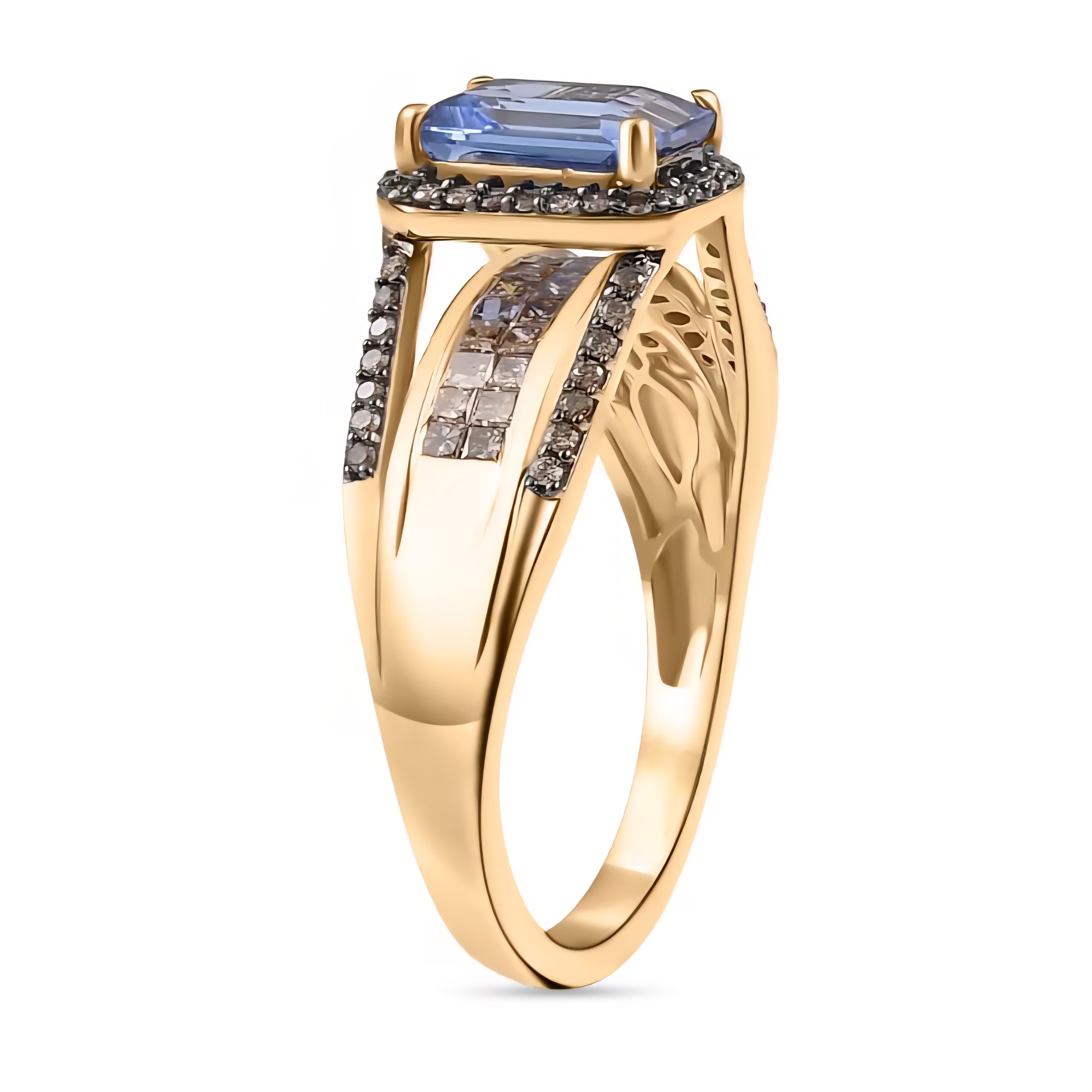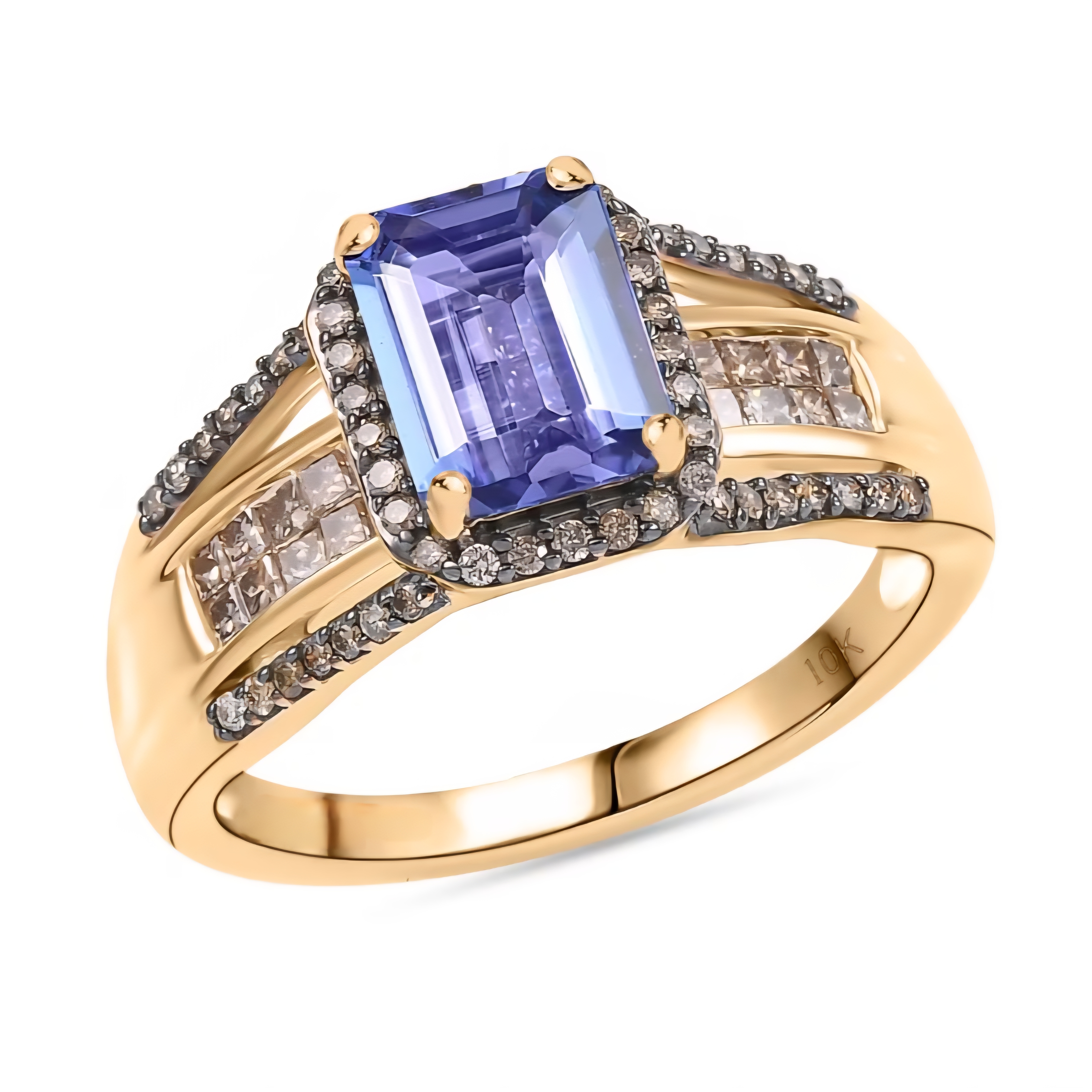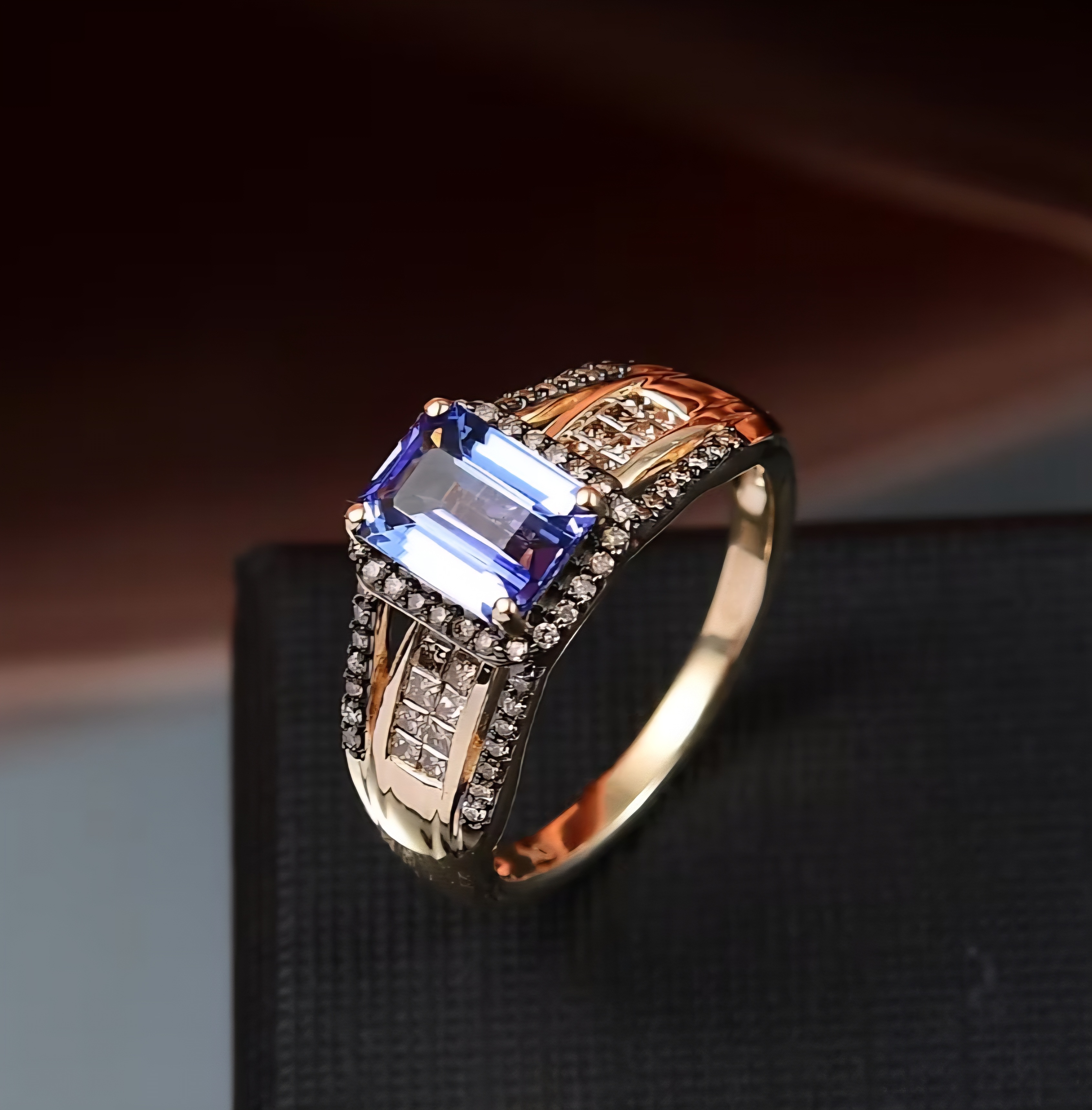 This magnificent Tanzanite and Champagne Diamond Halo Bridge Ring is an exquisite fusion of striking color and elegant design. At its center, a captivating emerald-cut Tanzanite showcases a mesmerizing blue-violet hue, surrounded by a radiant halo of rich champagne diamonds. The sophisticated bridge-style setting features more champagne diamonds cascading down the shoulders, creating a luxurious and harmonious flow. Crafted with precision in solid 10K yellow gold, this ring displays a substantial 2.05ctw of dazzling gemstones, making it a truly exceptional statement piece. It includes free worldwide shipping and a free lifetime warranty.