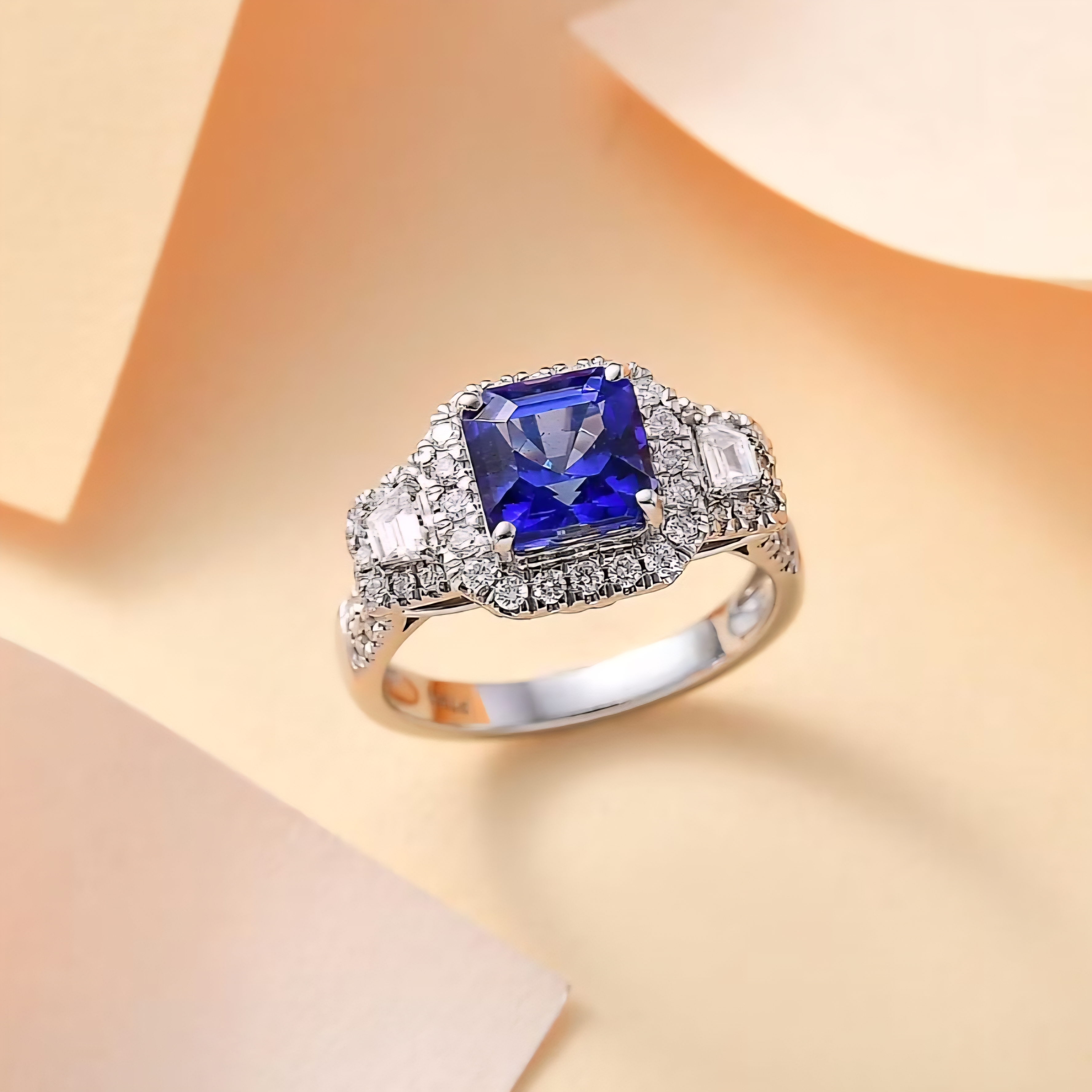 A bold, square emerald cut tanzanite takes the center with that electric blue violet glow that only tanzanite can pull off. The cut gives it clean lines and mirror-like flashes, while the color shifts between deep sapphire blue and flashes of violet depending on the angle.