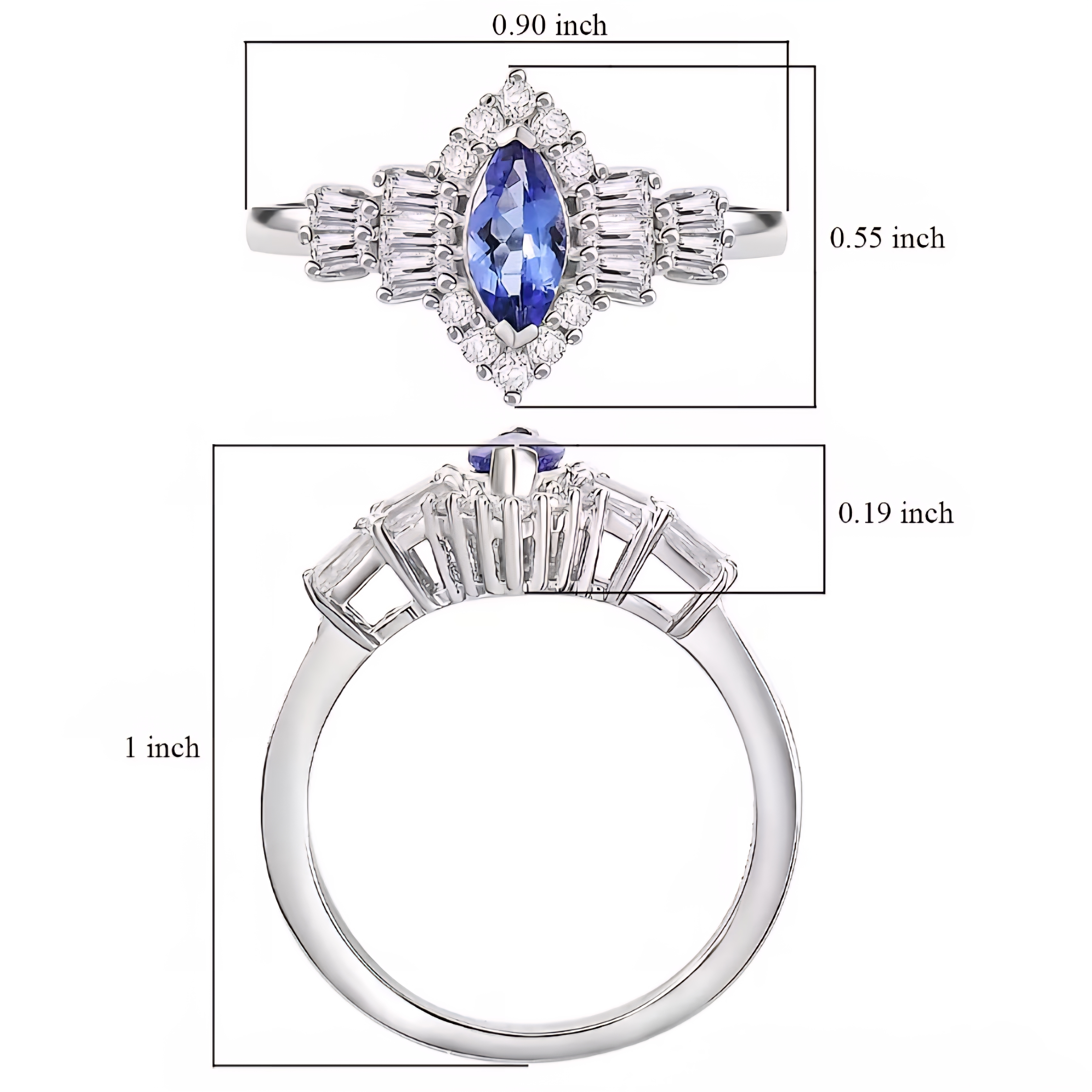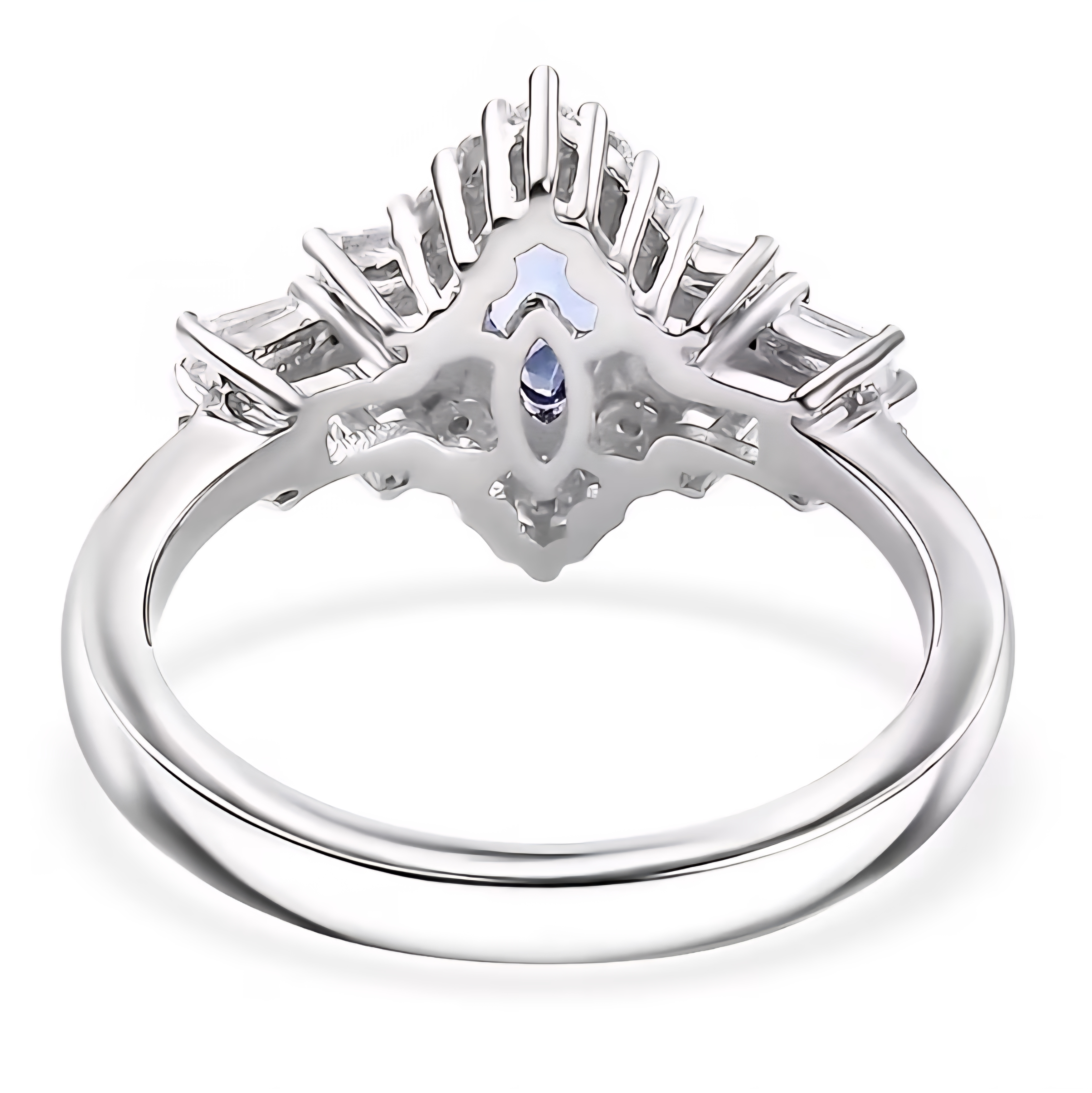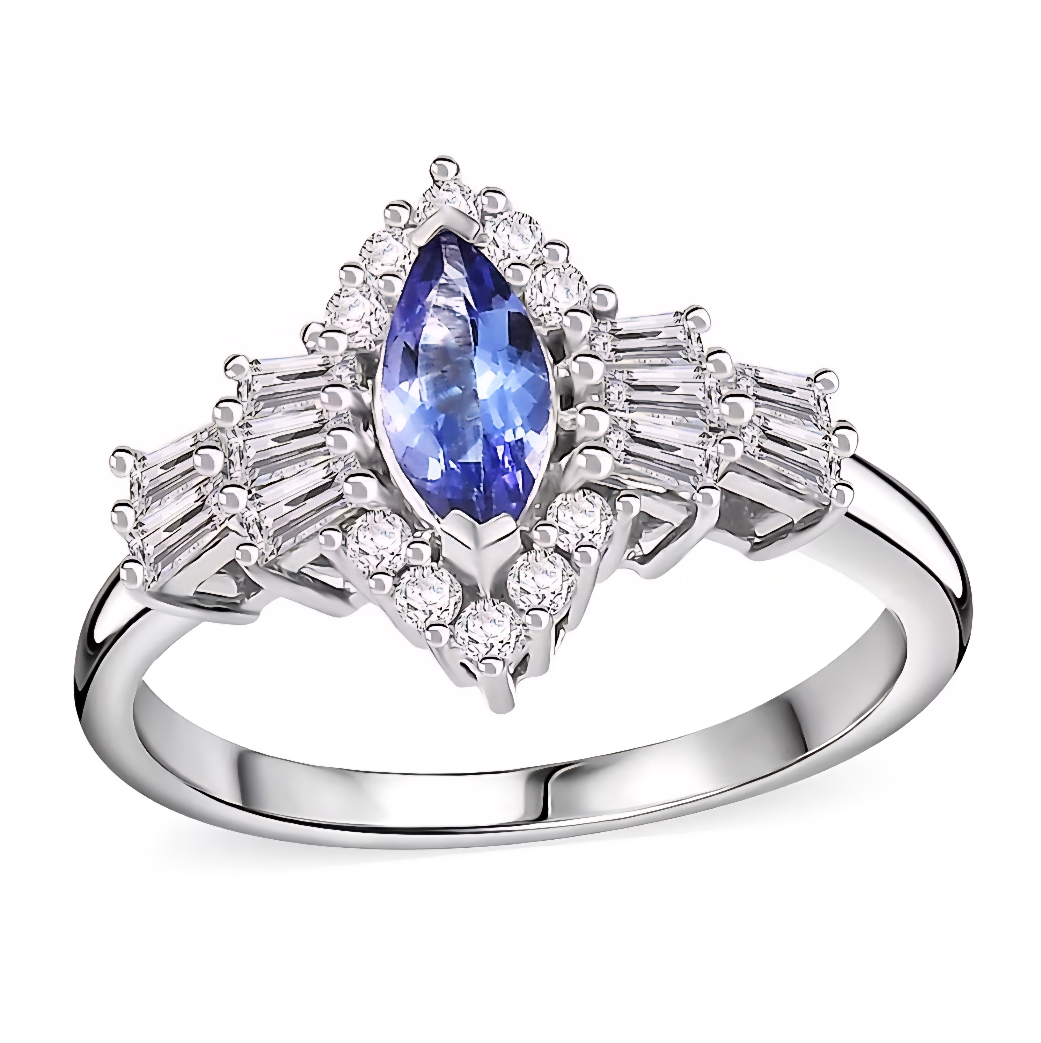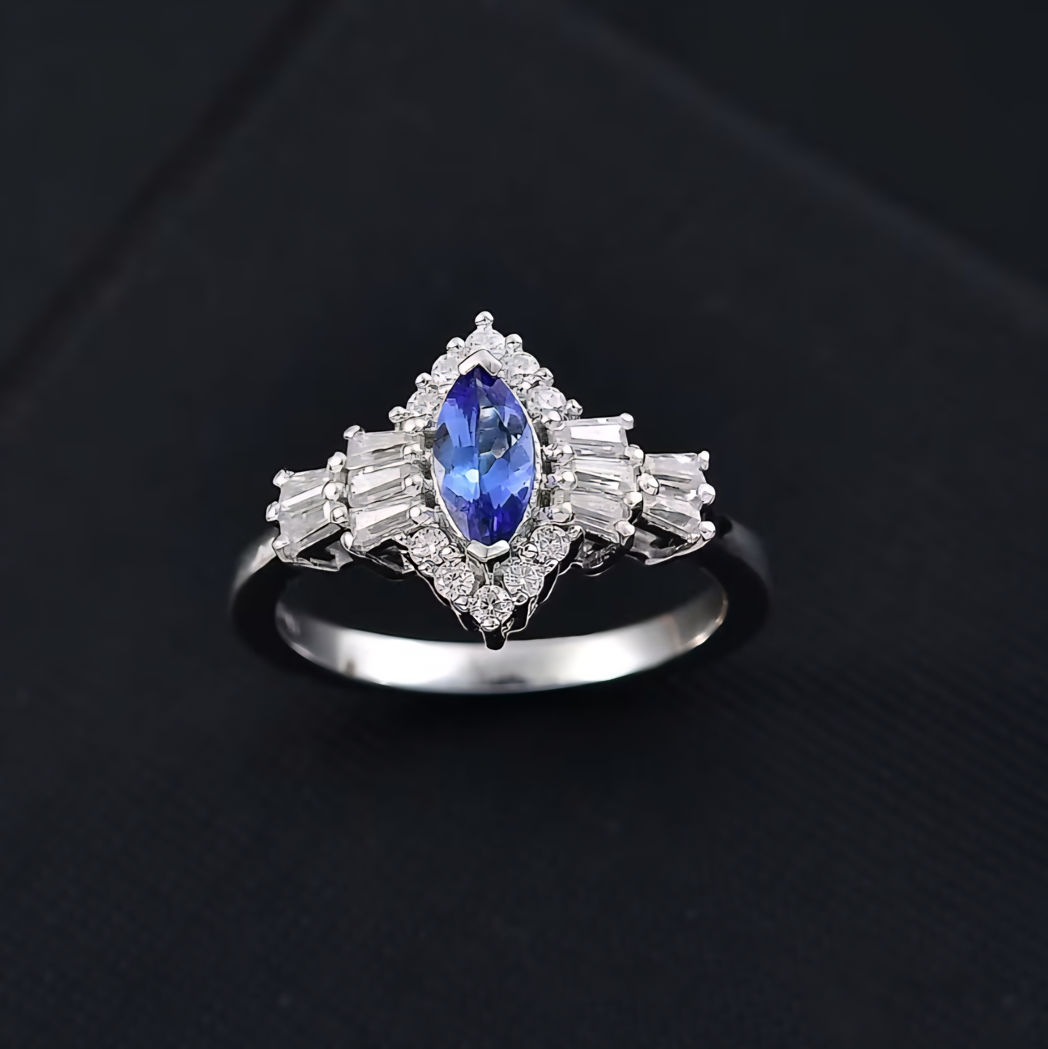 This ring centers on a marquise-cut tanzanite, chosen for its vivid blue hue and natural depth that shifts subtly with light. The elongated shape draws the eye upward, giving the ring presence without bulk. Surrounding the center stone is a structured halo of tapered baguette moissanite, creating architectural lines and a crisp, high-end look, while round moissanite accents soften the edges with controlled sparkle.