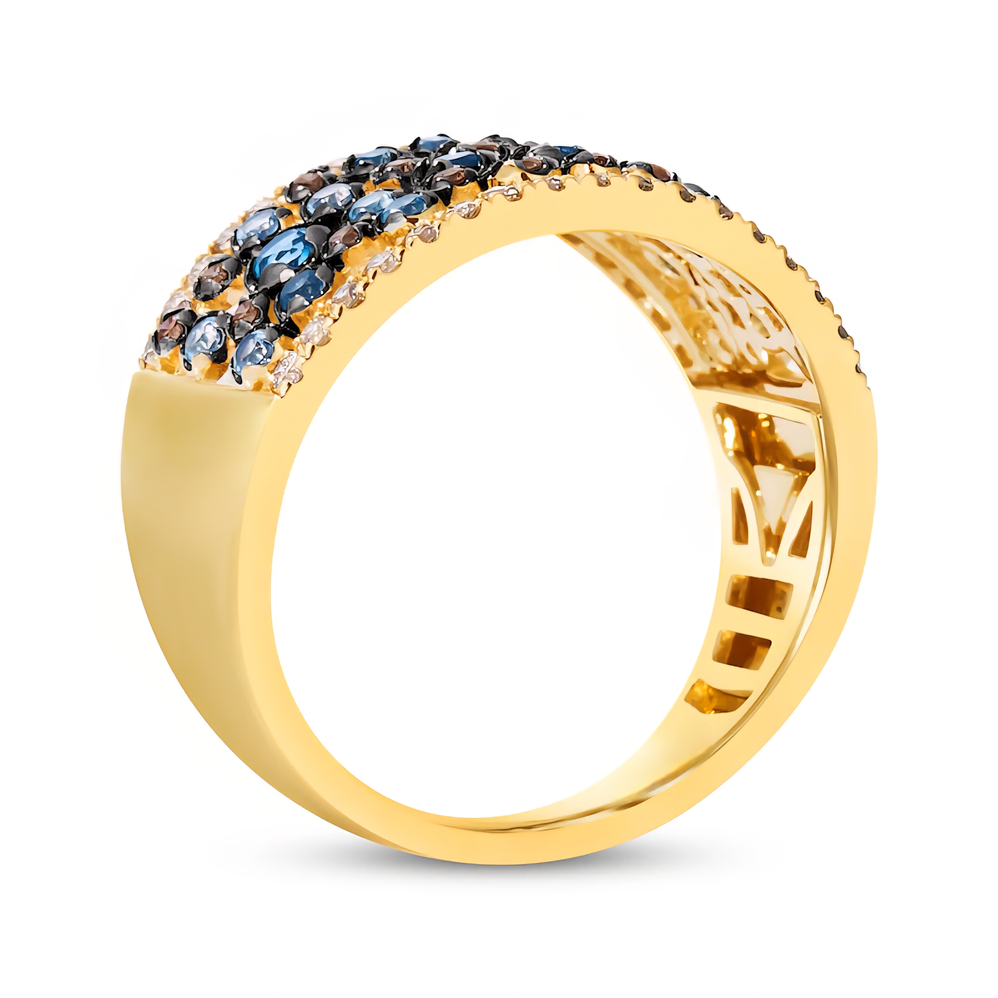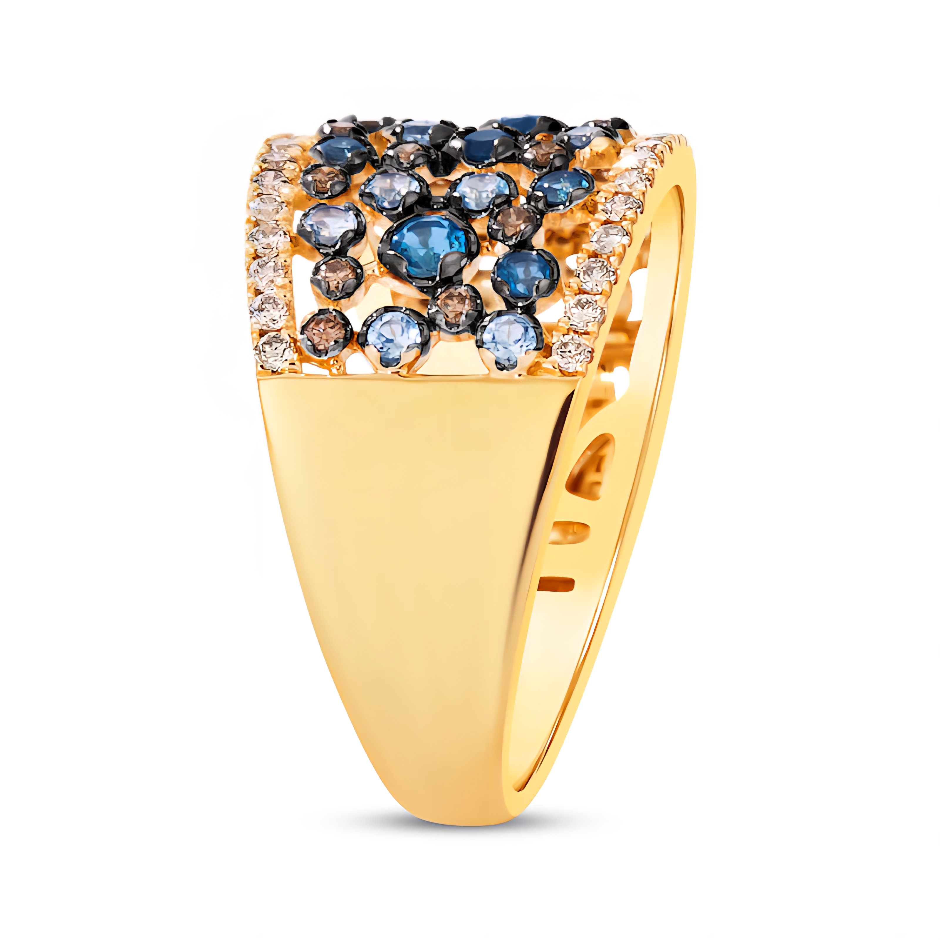 Dive into a spectrum of blues with this dazzling cluster ring, featuring a mix of London Blue, Swiss Blue, and Sky Blue Topaz gemstones. Each shade is arranged in artful harmony, accented by warm champagne and rich brown diamonds along the edges. Crafted in solid 14K yellow gold with a sleek black rhodium finish, this design strikes the perfect balance between bold color and refined sparkle. A versatile, statement-making piece that transitions effortlessly from day to night, it captures the depth of the ocean and the brilliance of the sky in one unforgettable design. Total gemstone weight: 1.60 carats.
