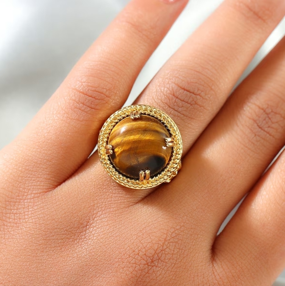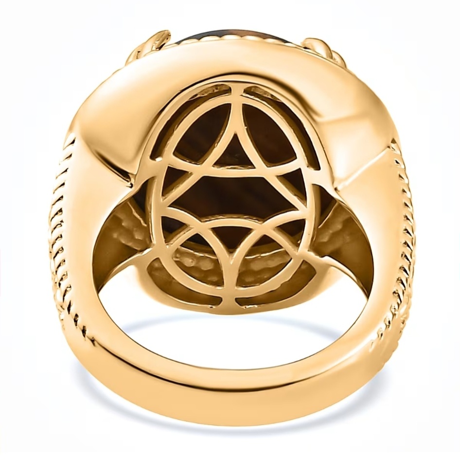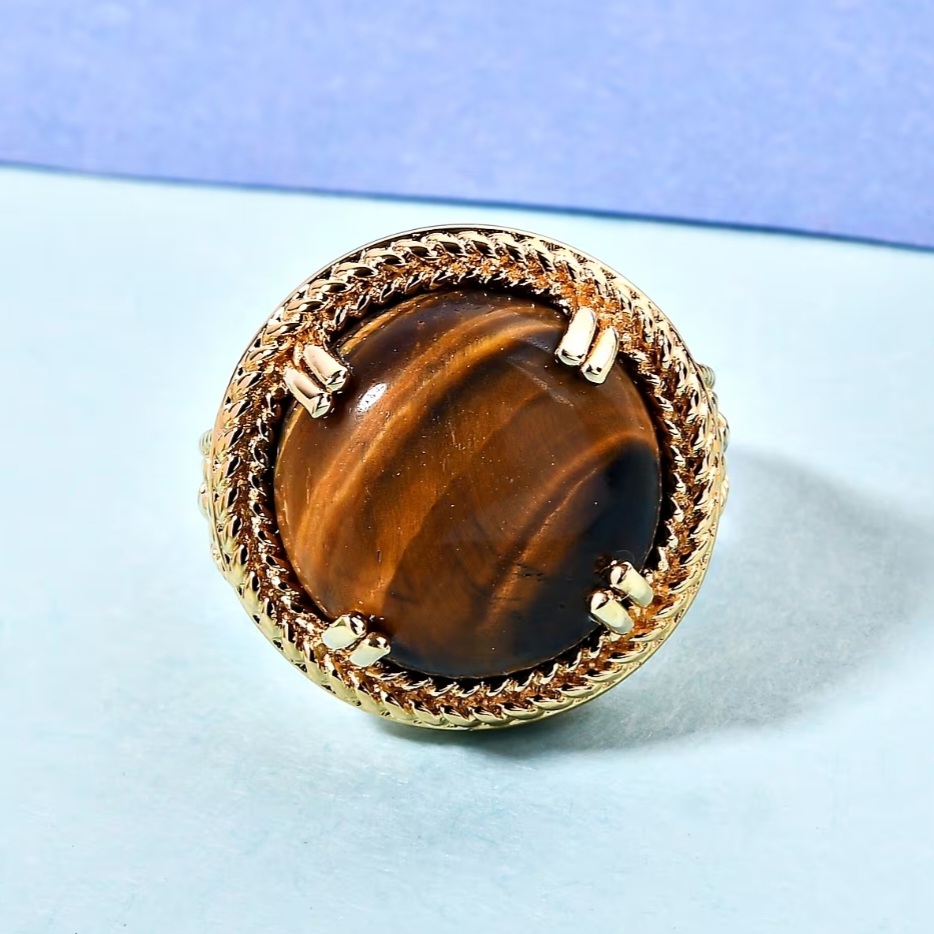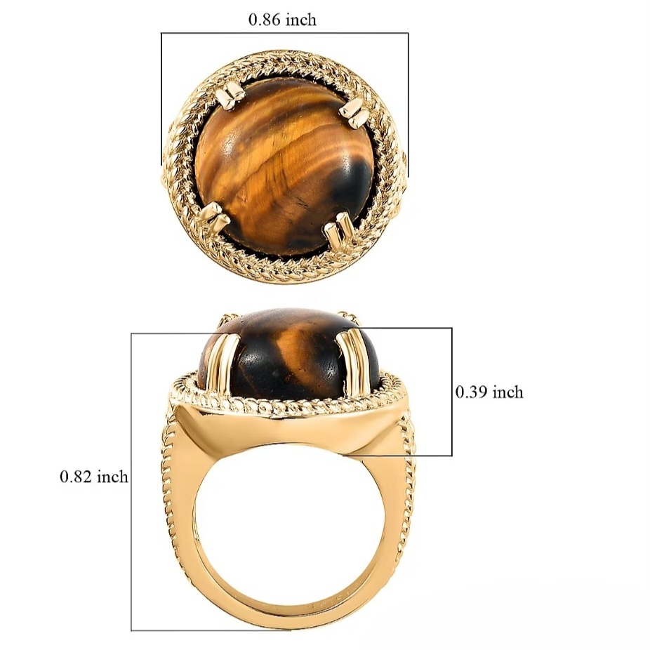 Commanding and confident, this ring centers a 12.25 ct round Tiger’s Eye cabochon that glows with golden-brown bands of shifting light. The gem’s natural chatoyancy creates a rolling “cat’s-eye” effect, enhanced by the warm radiance of solid 10 K yellow gold.