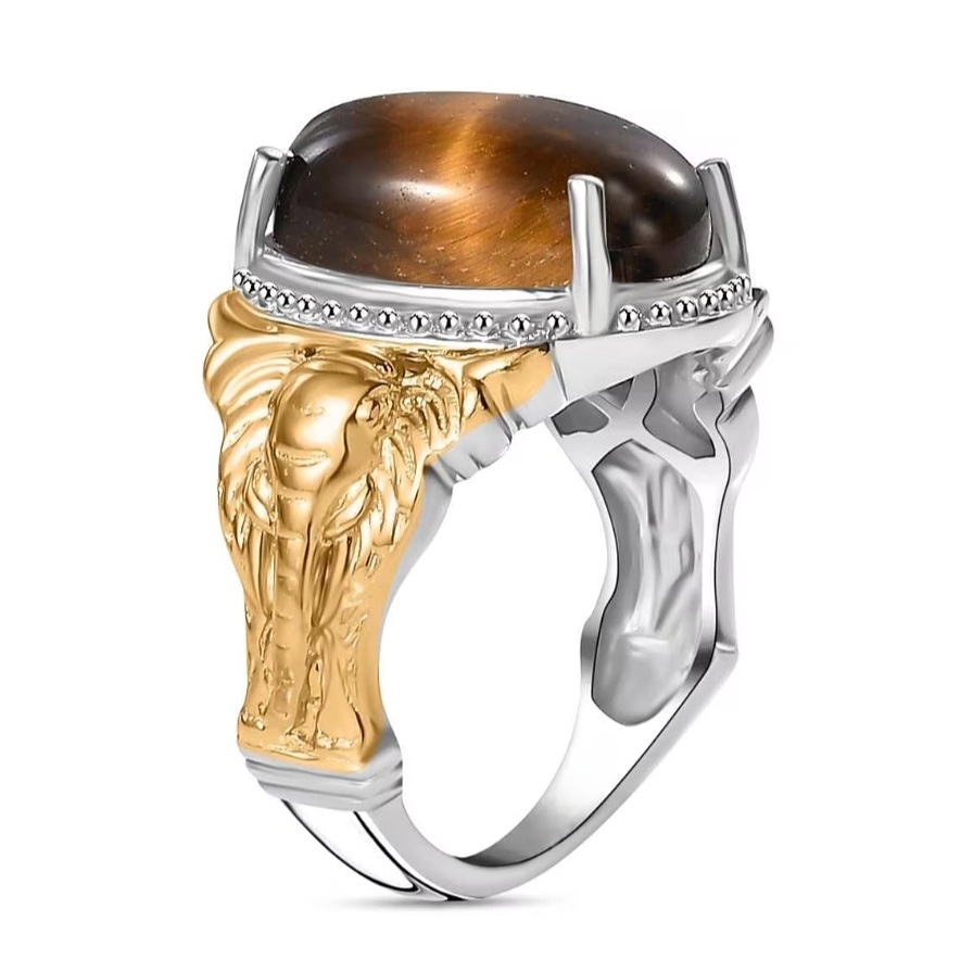 The shank showcases hand-carved elephant heads on each side, finished in rich 18k yellow gold plating against a rhodium-bright sterling base. The contrast creates a regal, two-tone effect that honors tradition and craftsmanship.