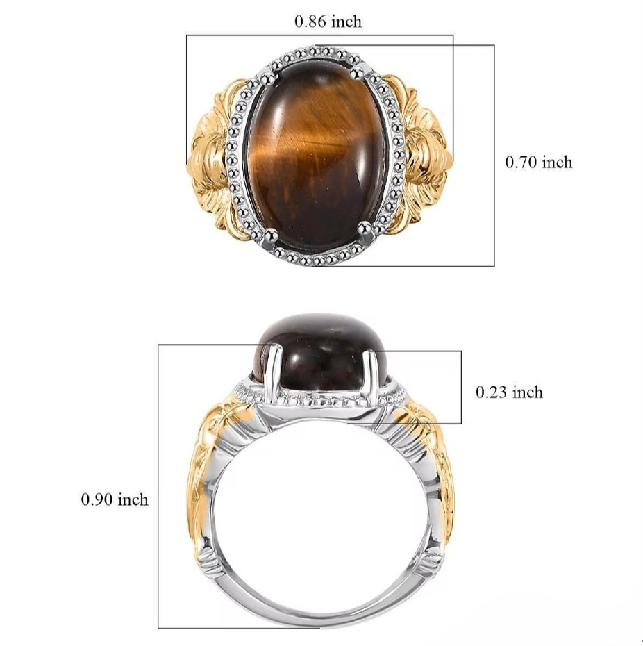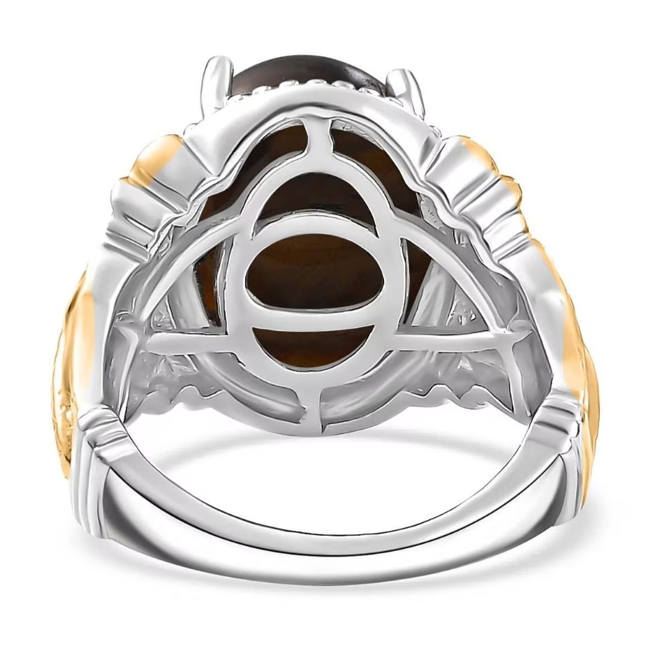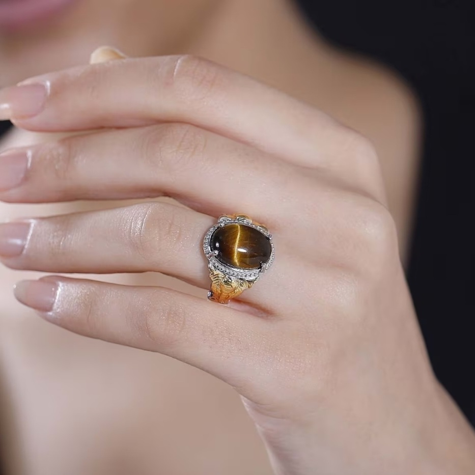Centering a 6.65ct cabochon-cut Tiger’s Eye, it glows with deep bronze light and chatoyant movement — a natural reflection of the gemstone’s legendary protective energy.