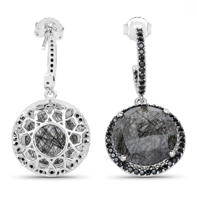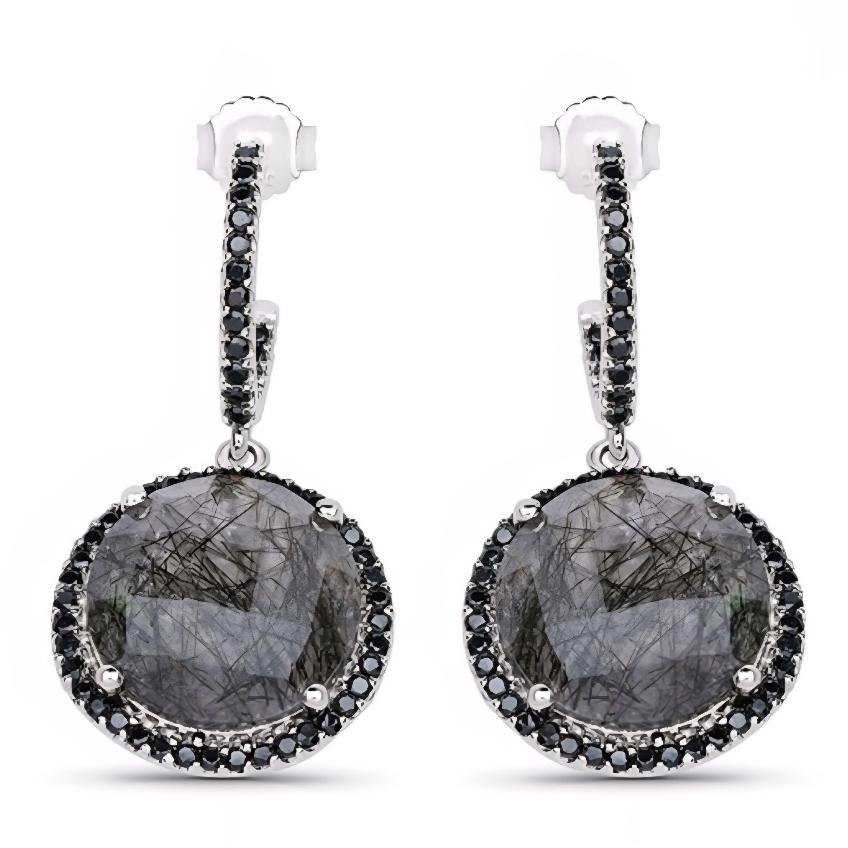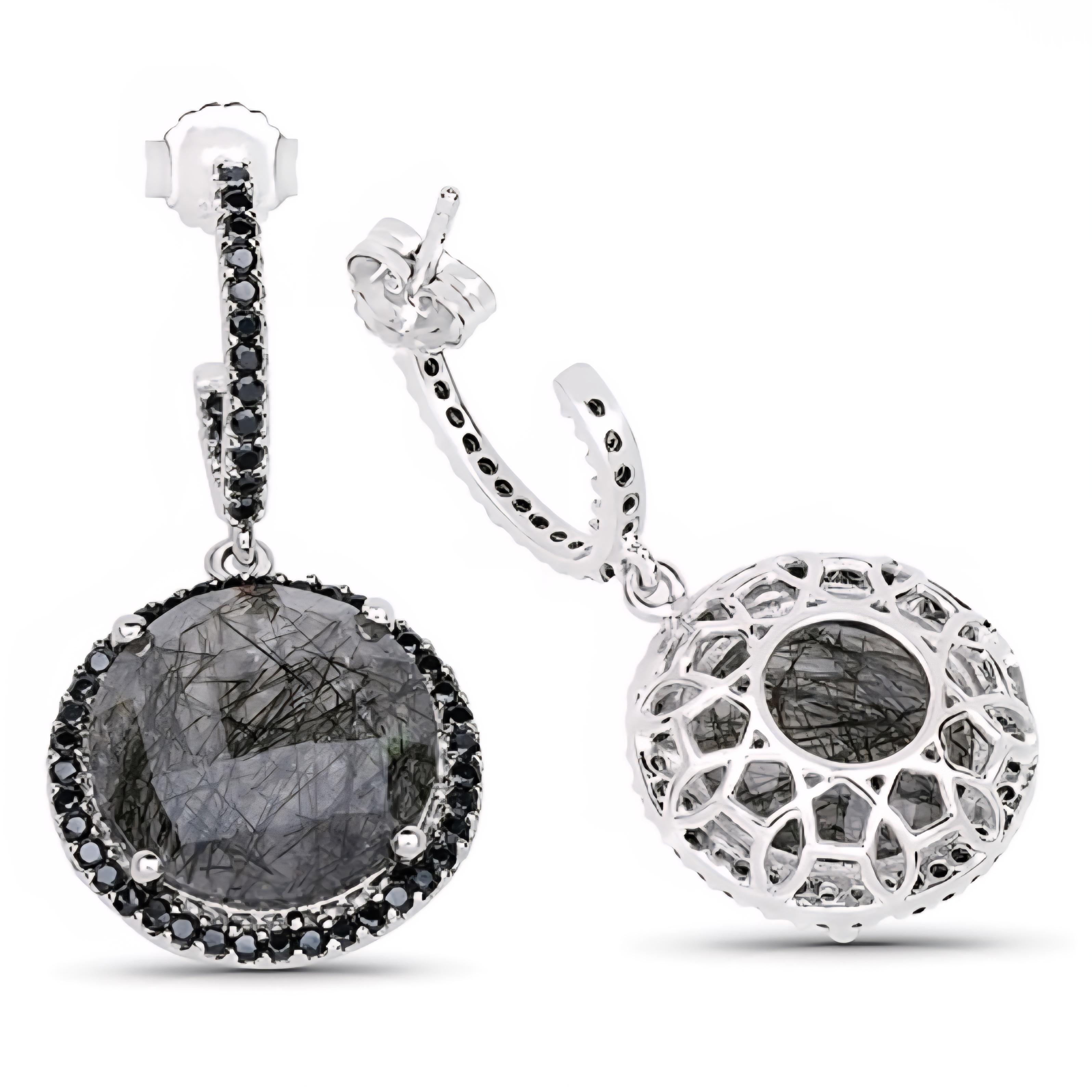 Dark elegance with natural intrigue. Each earring features a bold 15mm round Tourmalinated Quartz (20.30ct total) — a dramatic gemstone marked by delicate black rutile inclusions suspended within clear quartz. The checkerboard-cut surface enhances its dimensional depth, creating a sophisticated play of light and shadow.