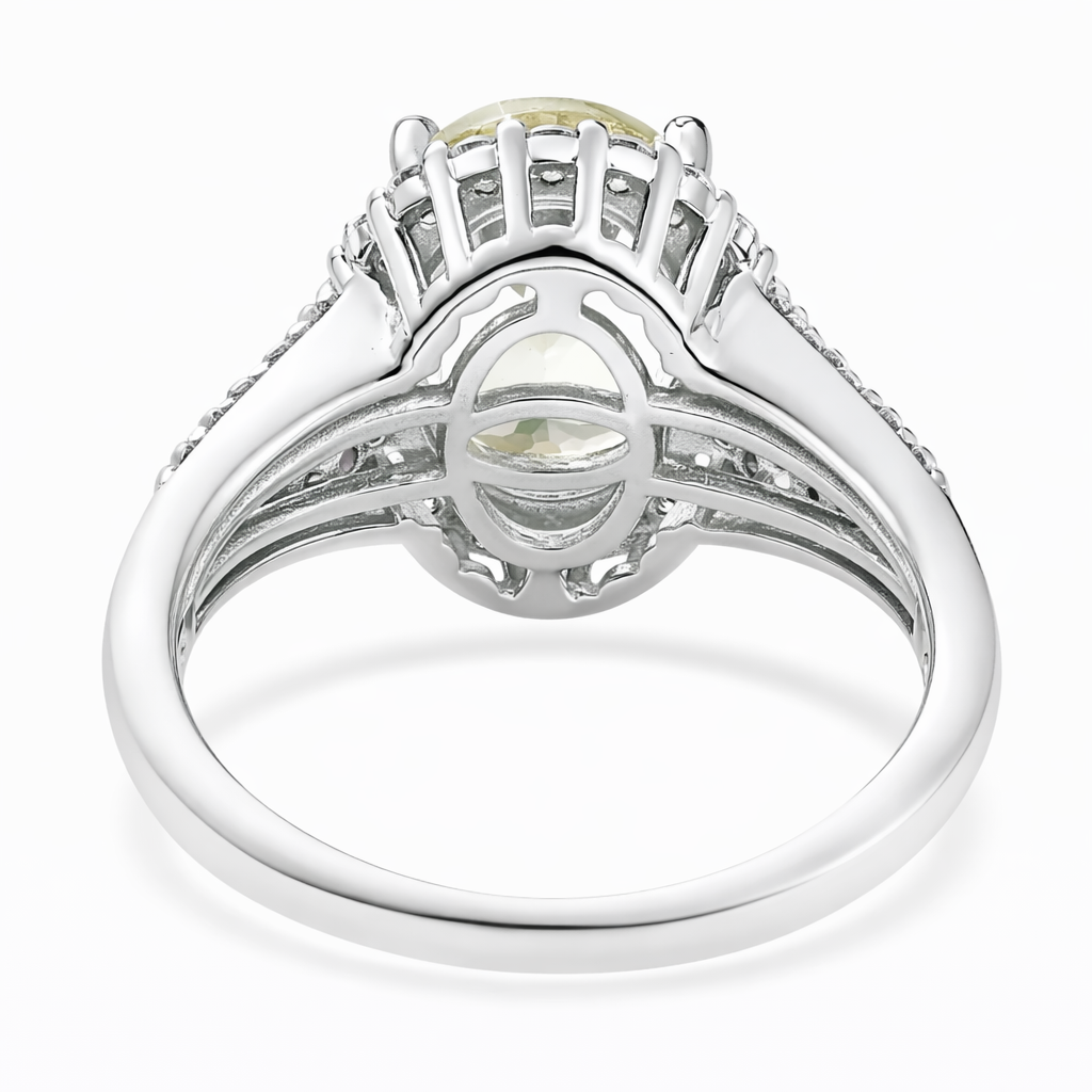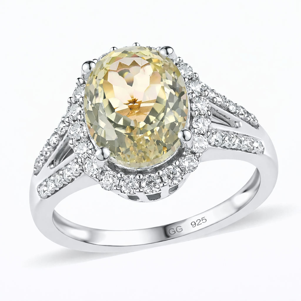 A fine halo of colorless moissanite defines the outline of the stone, adding lift and separation while keeping the focus firmly on color. The split shank introduces structure and visual width, creating balance across the top of the ring without adding unnecessary bulk. Pavé-set moissanite along the shoulders provides controlled brilliance, contributing texture and dimension rather than overt sparkle.