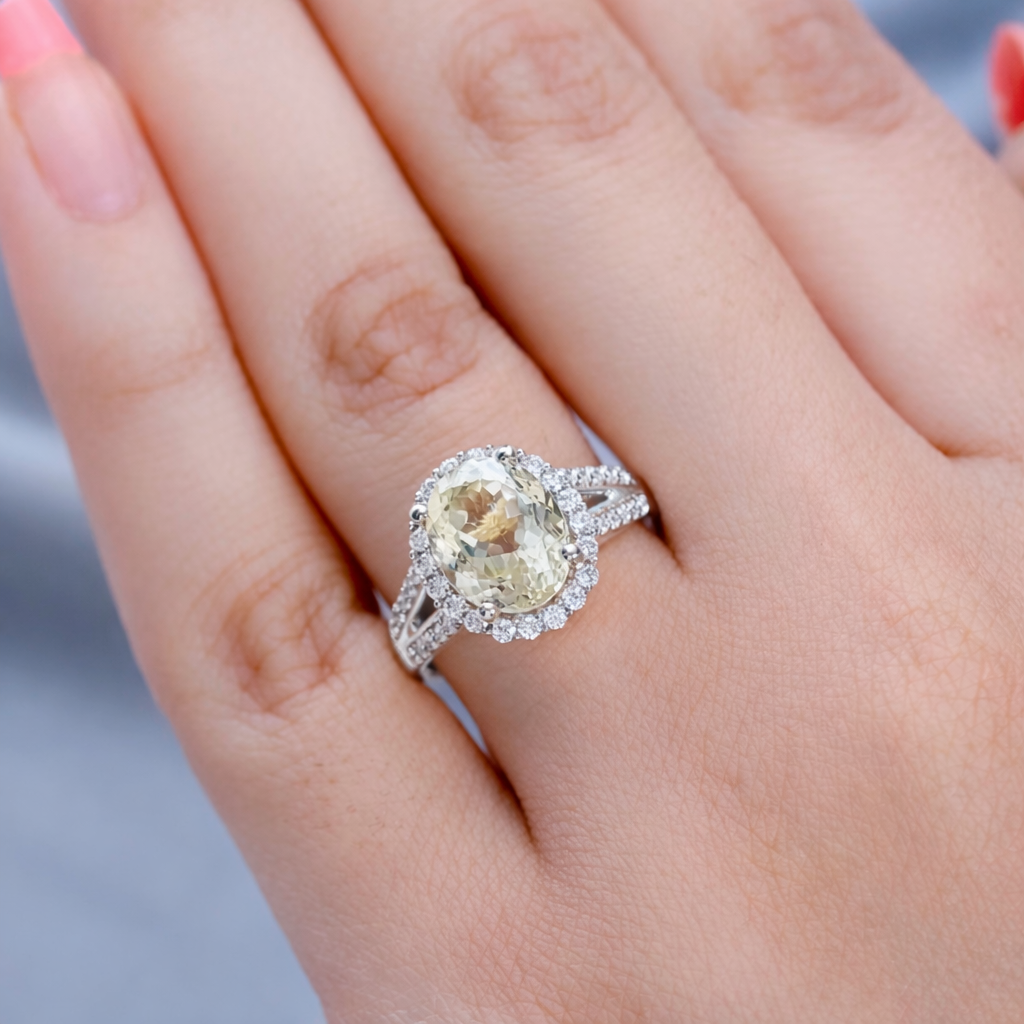 The triphane shows a soft golden-yellow tone that reads luminous rather than bright, with clarity that allows light to move cleanly through the stone. Its oval shape stretches the color across the finger in a composed, deliberate way, giving the ring presence without feeling heavy or oversized. Sometimes informally referred to in the trade as “yellow kunzite,” triphane is gemologically distinct, valued for its transparency and subtle saturation rather than intensity alone.