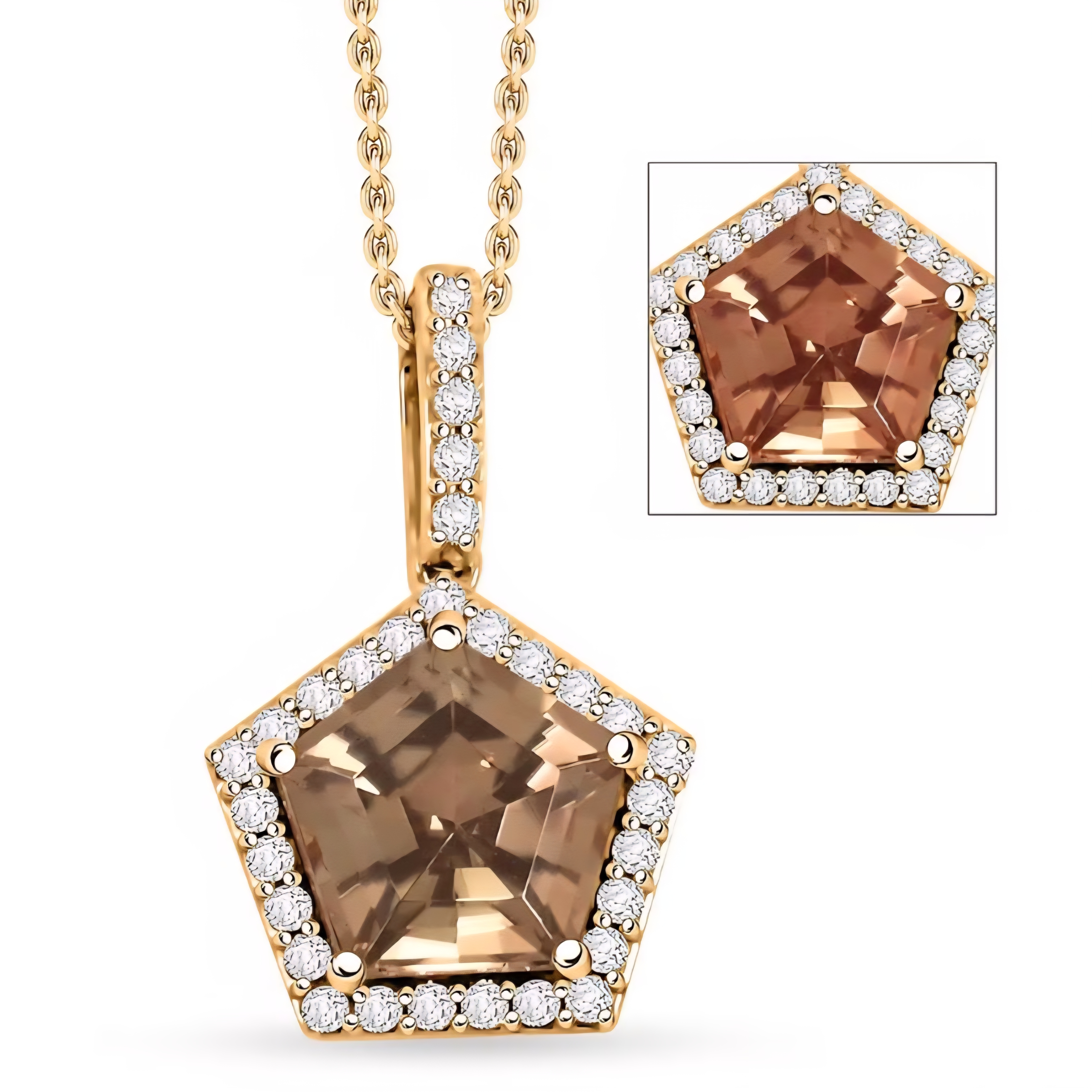 This pendant centers on a 3.06 carat Turkizite Diaspore cut into a striking 9mm pentagon. A halo of natural round diamonds totaling 0.29 carats frames the pentagon silhouette with precision and brightness. The contrast between the angular center and the fine diamond halo creates a balanced, architectural look that feels modern yet timeless.