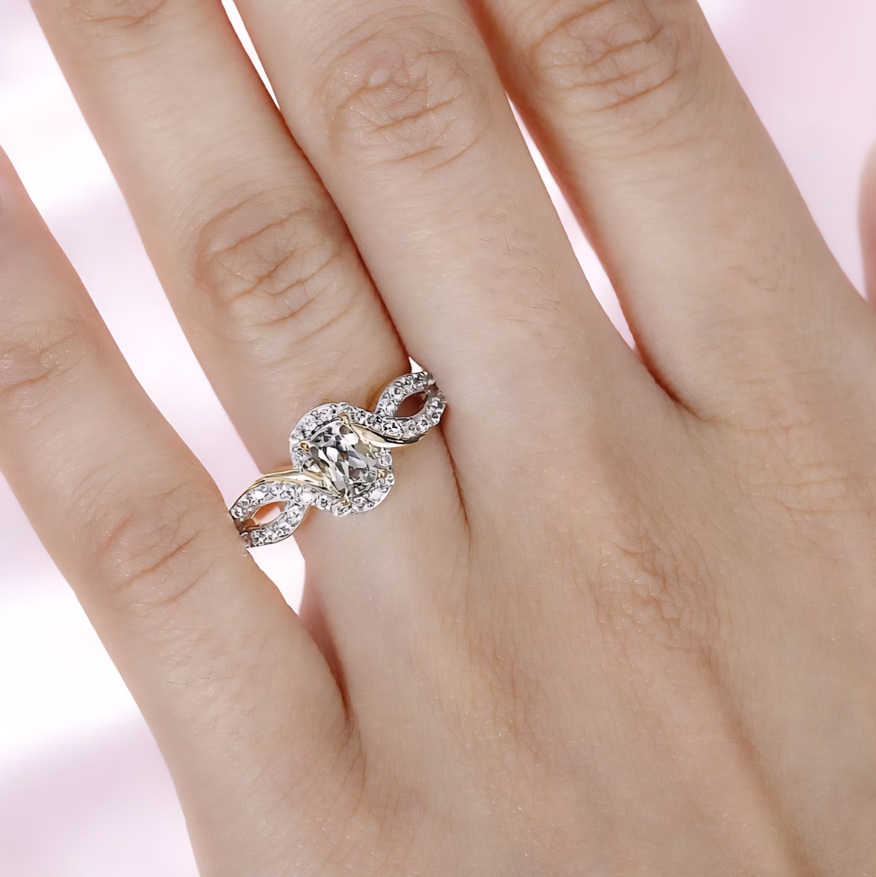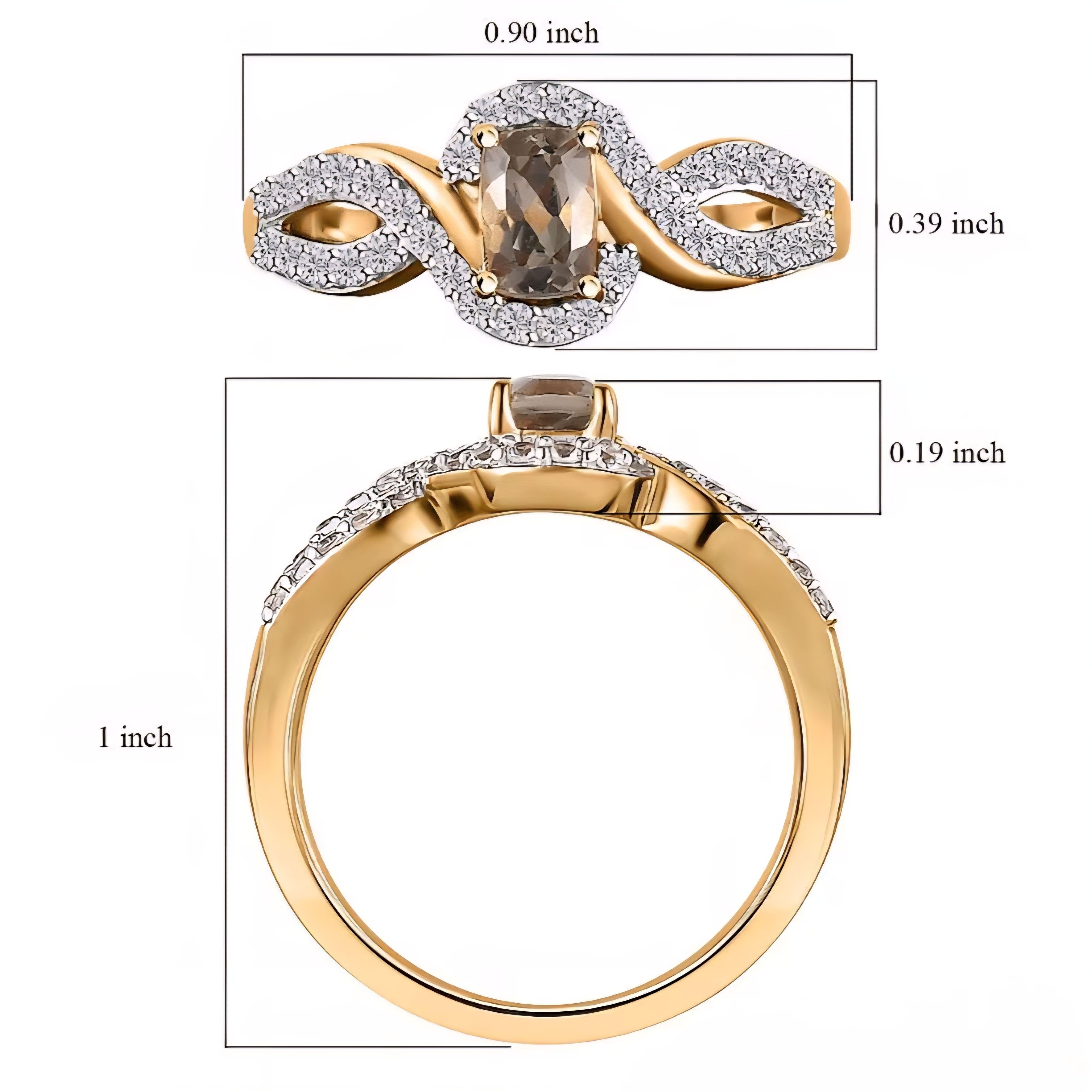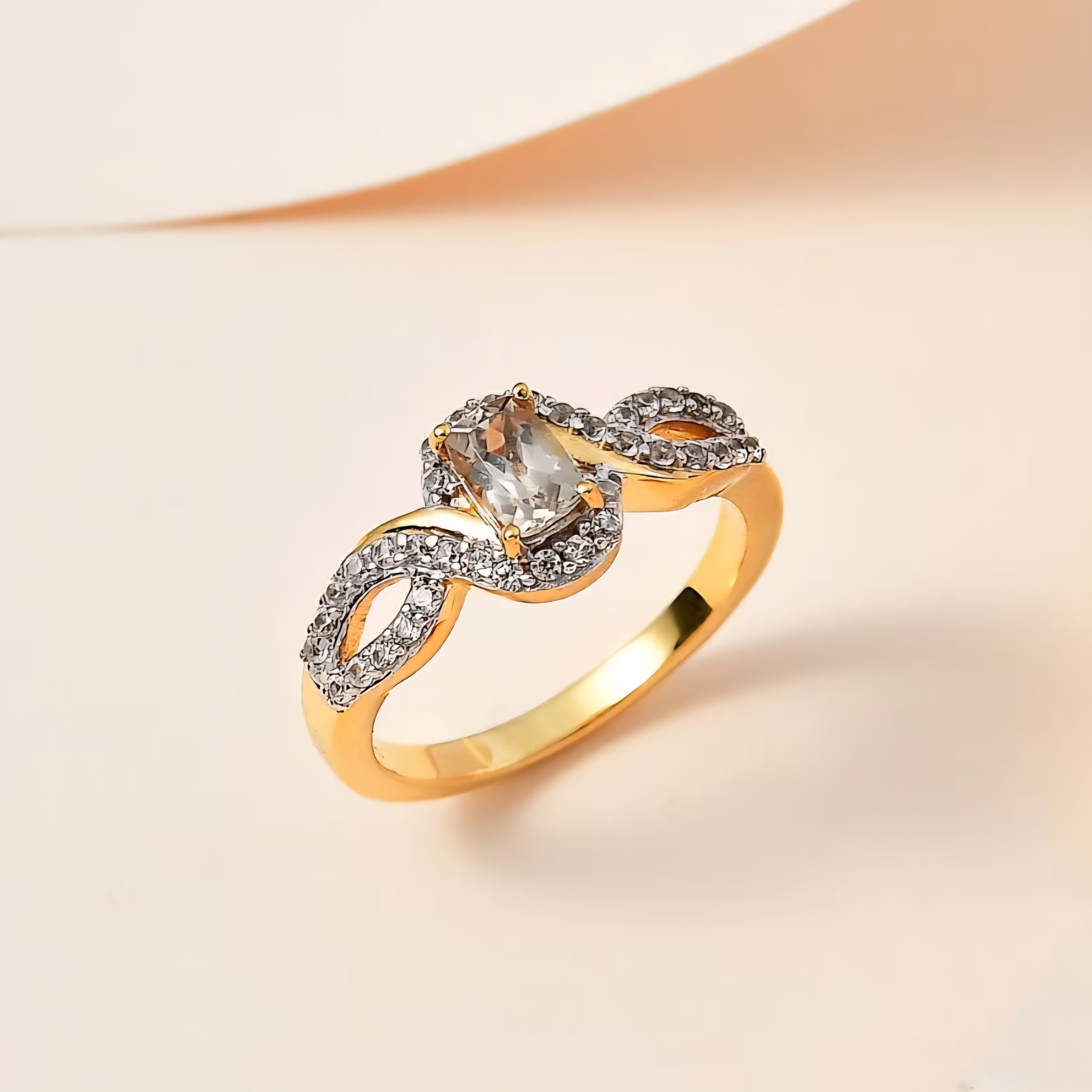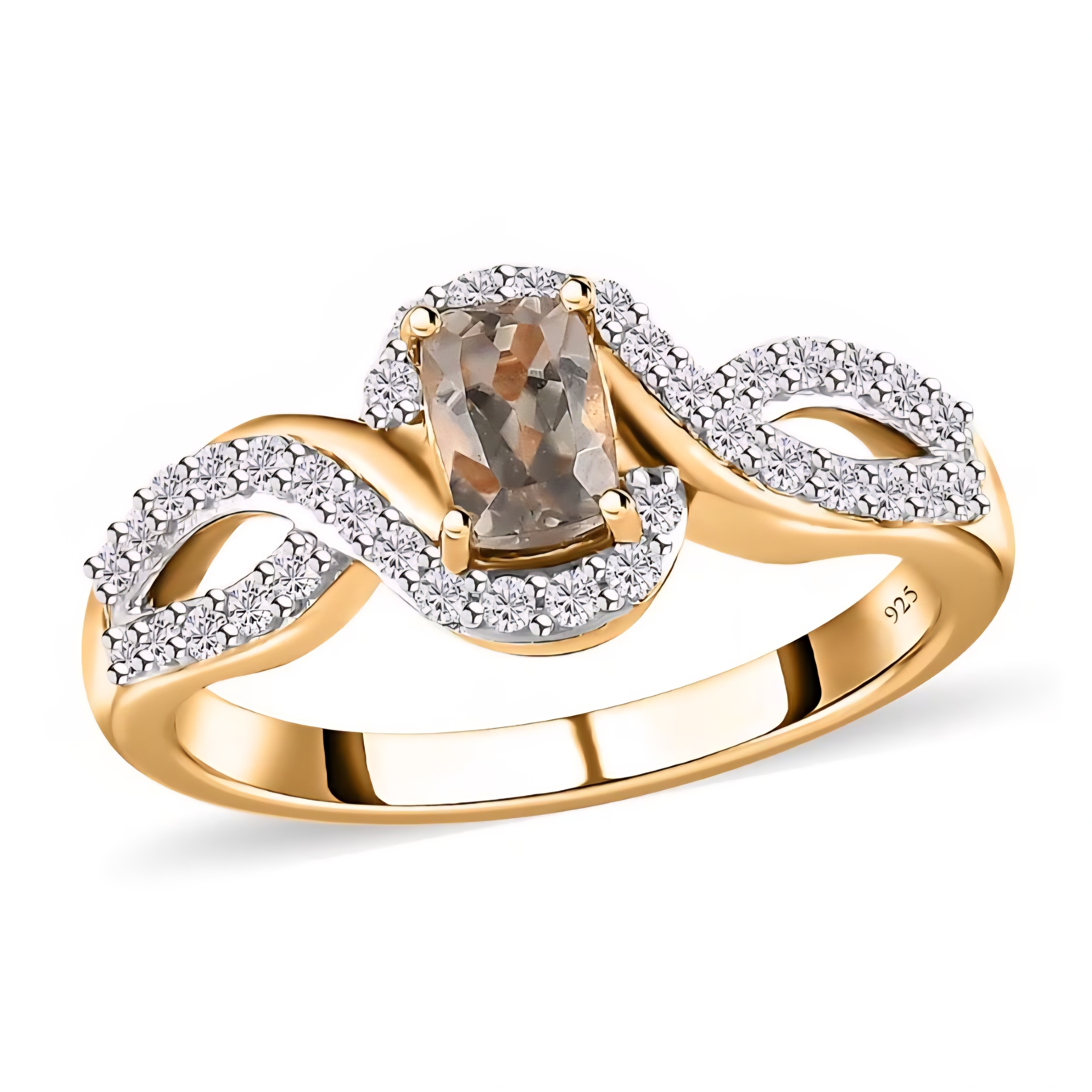 This elegant bypass style ring features a cushion cut turkizite center stone with a distinctive yellow green hue, framed by bright white zircon accents for clean contrast and sparkle. The flowing design wraps around the center, with pavé set zircon detailing along both sides to create a balanced, modern silhouette. Crafted in solid 925 sterling silver and finished in 18K yellow gold and rhodium plating, this ring combines warm gold tone with crisp white brilliance for a refined everyday statement.