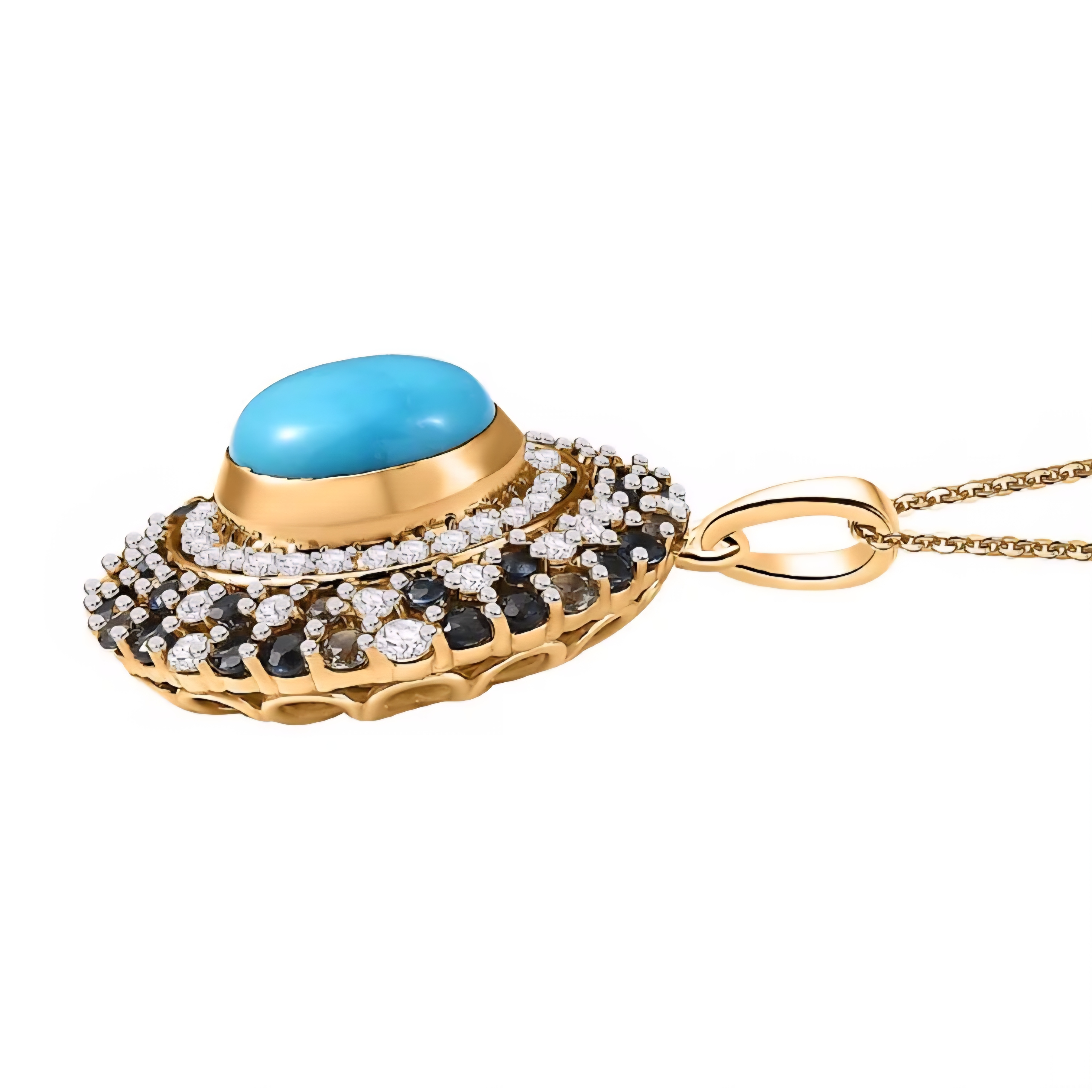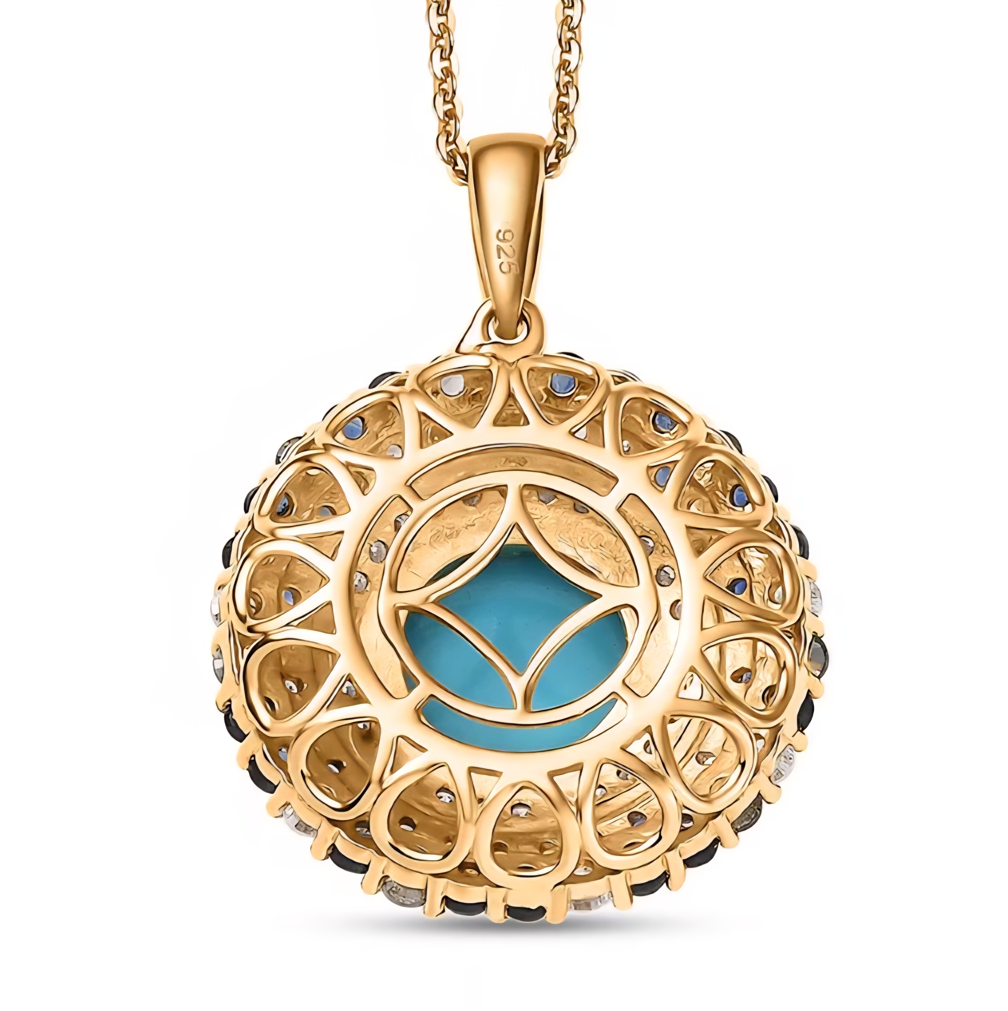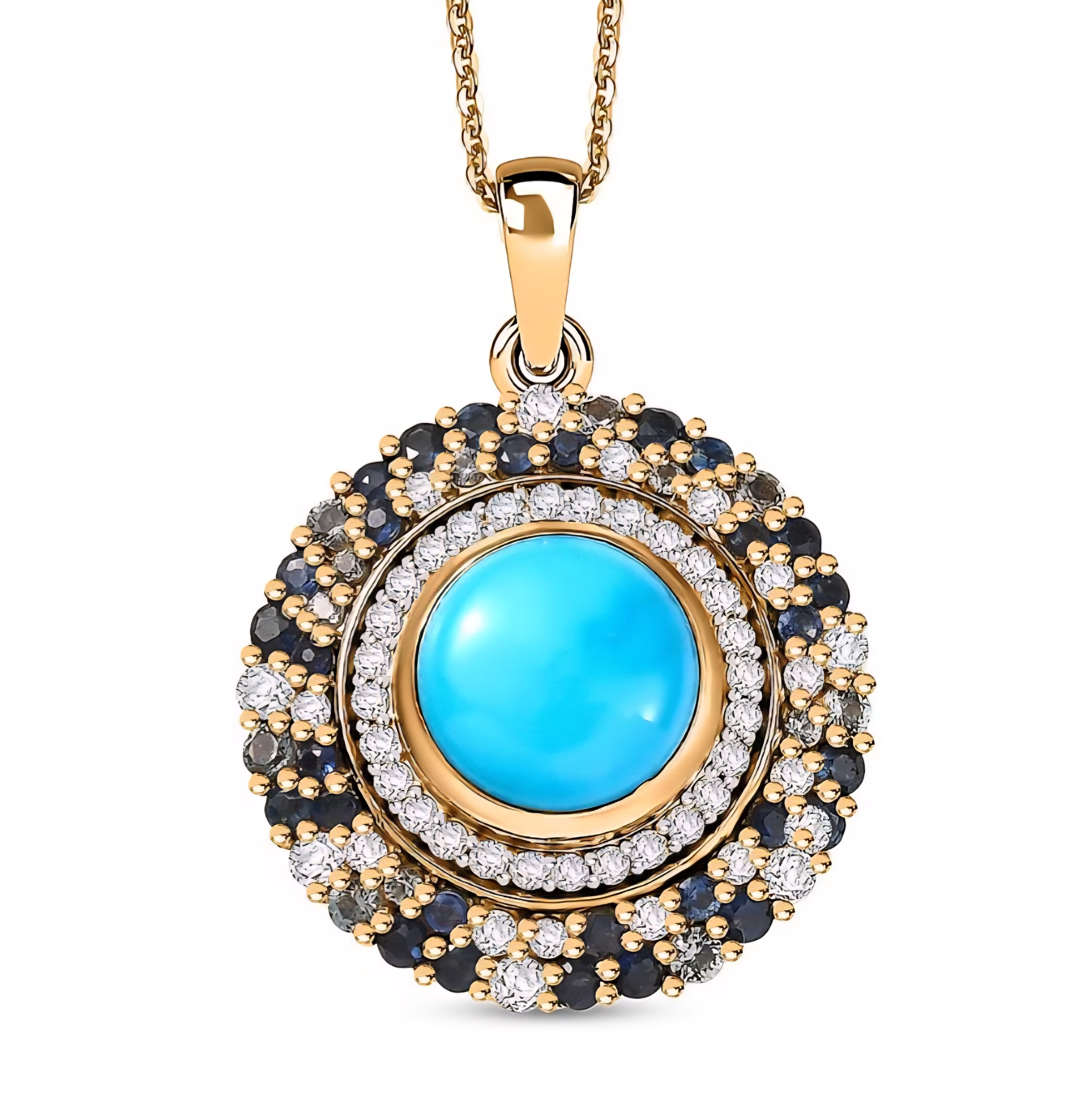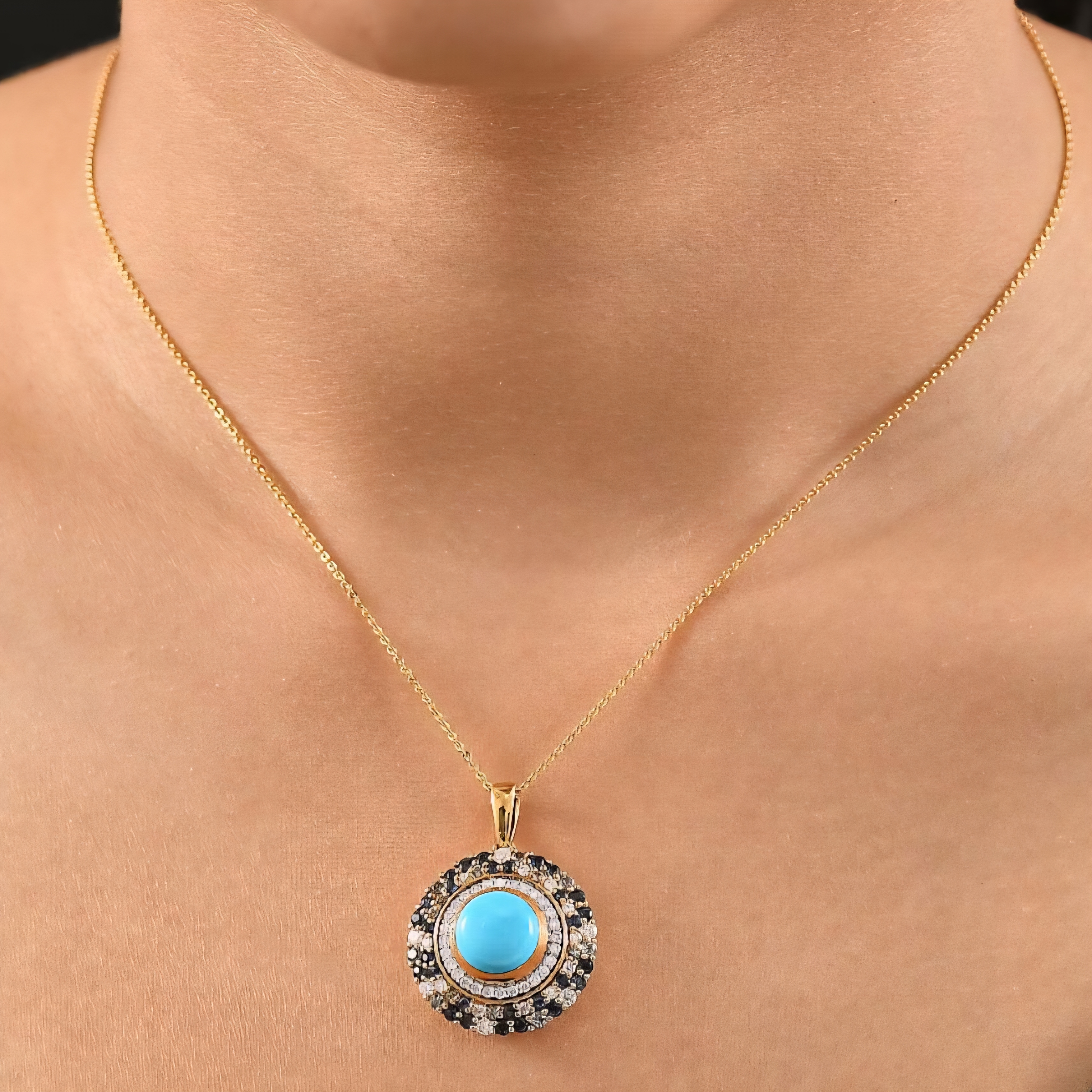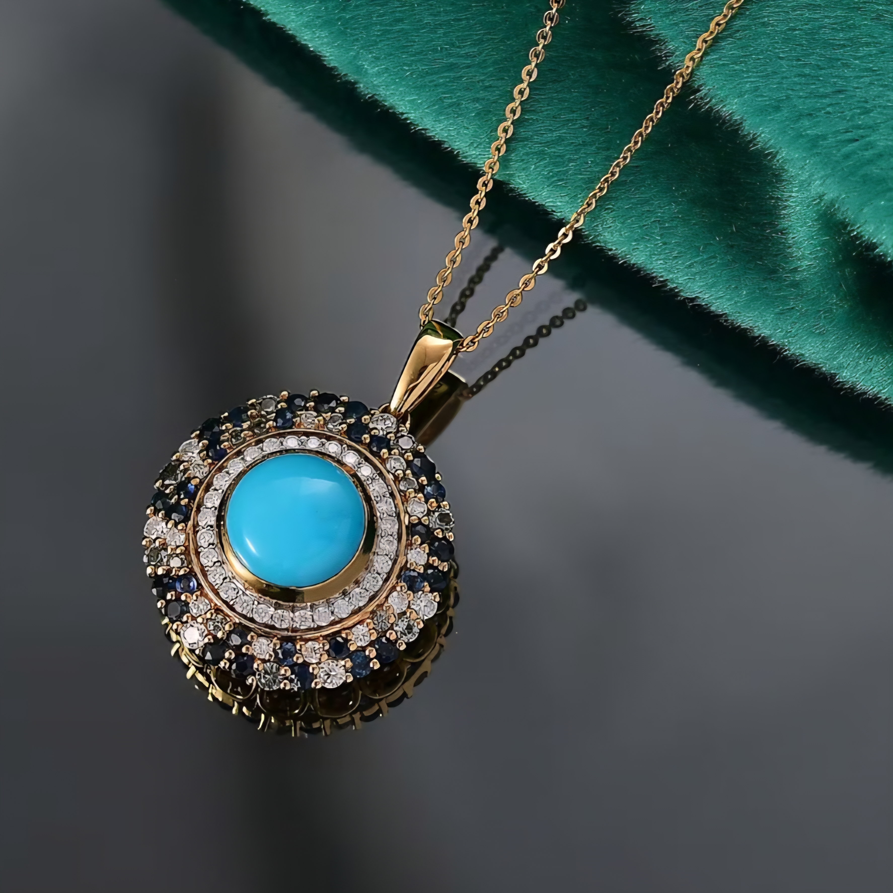 A bold burst of color and sparkle, this pendant centers a vivid Sleeping Beauty Turquoise cabochon framed by two vibrant sapphire & moissanite halos and a brilliant inner ring of moissanite. The result is a rich, sunlit palette of blue, green, and white fire that feels regal, radiant, and unmistakably luxurious.