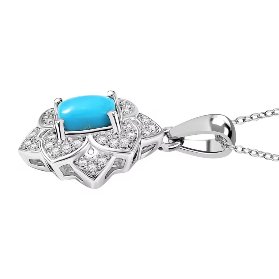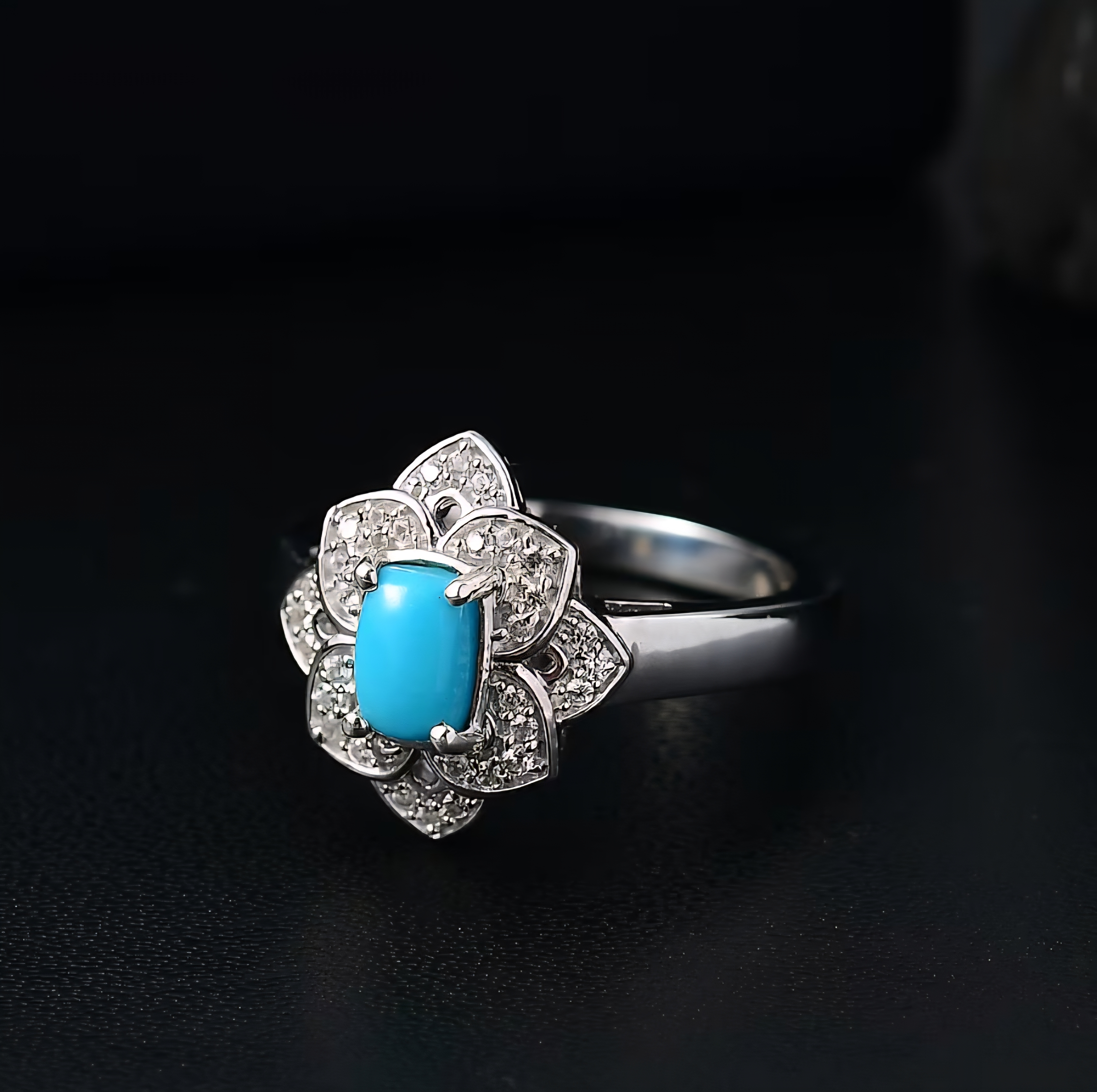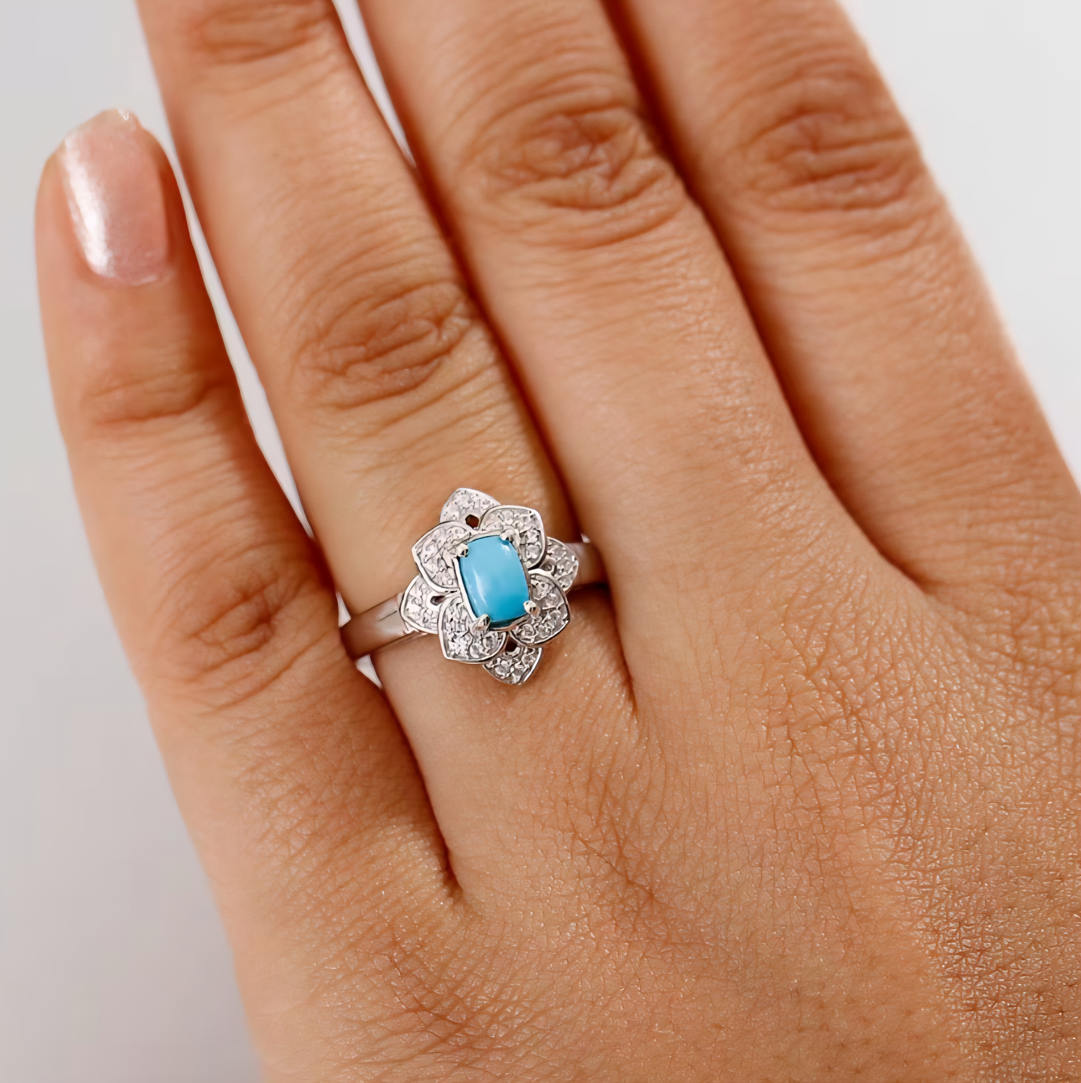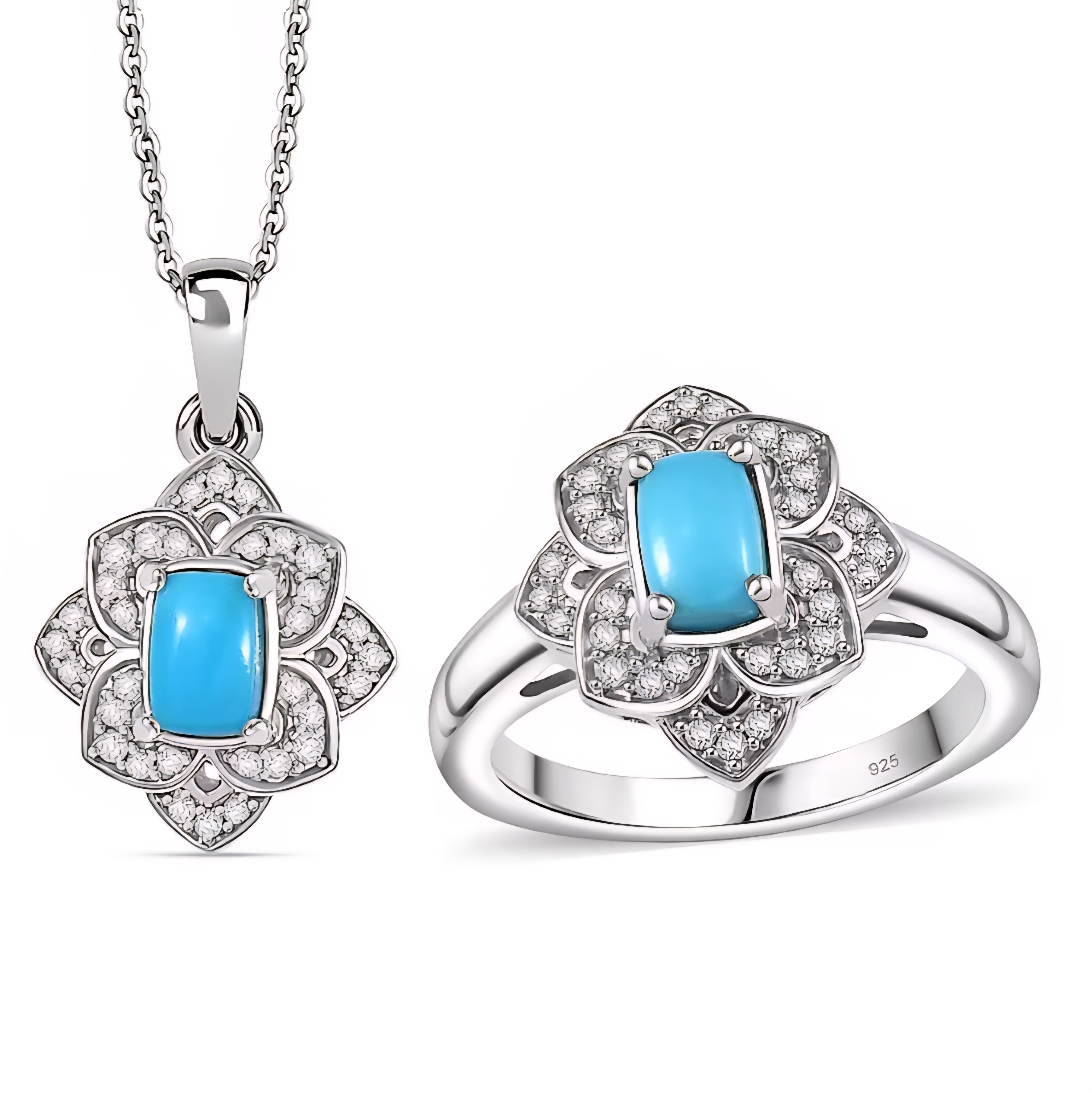 A refined, floral-inspired duo that brings Sleeping Beauty color to life. This matching ring and pendant necklace set centers around vivid 6x4mm turquoise cushions, each framed by a shimmering petal halo of precision-cut white zircon.