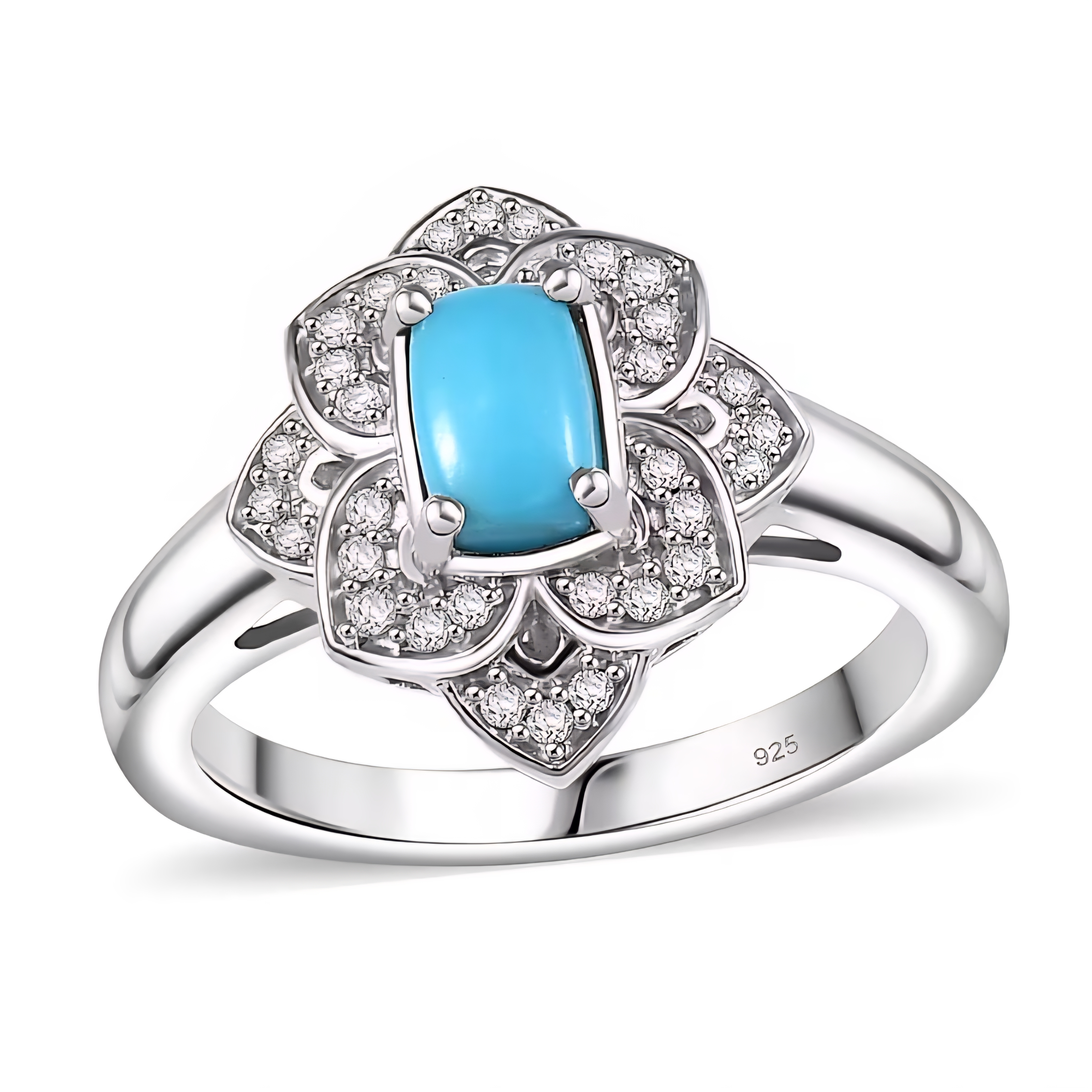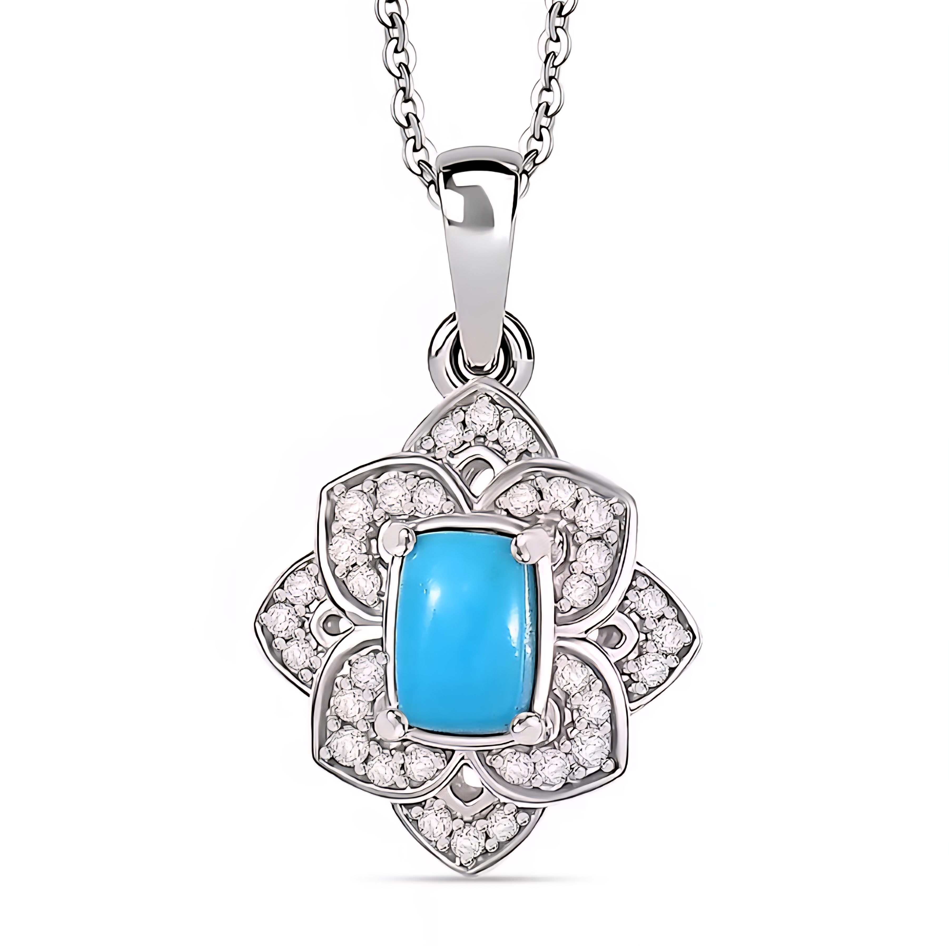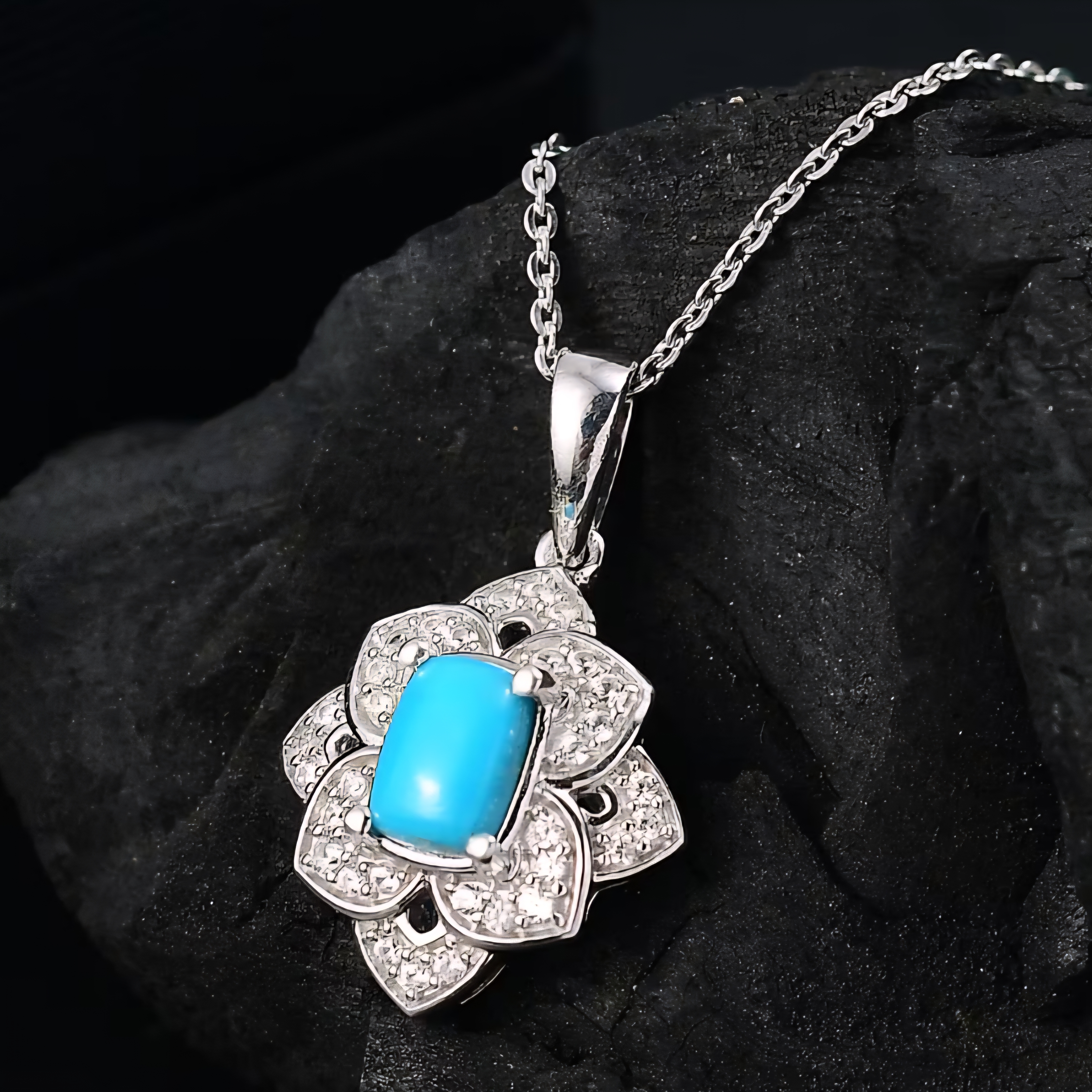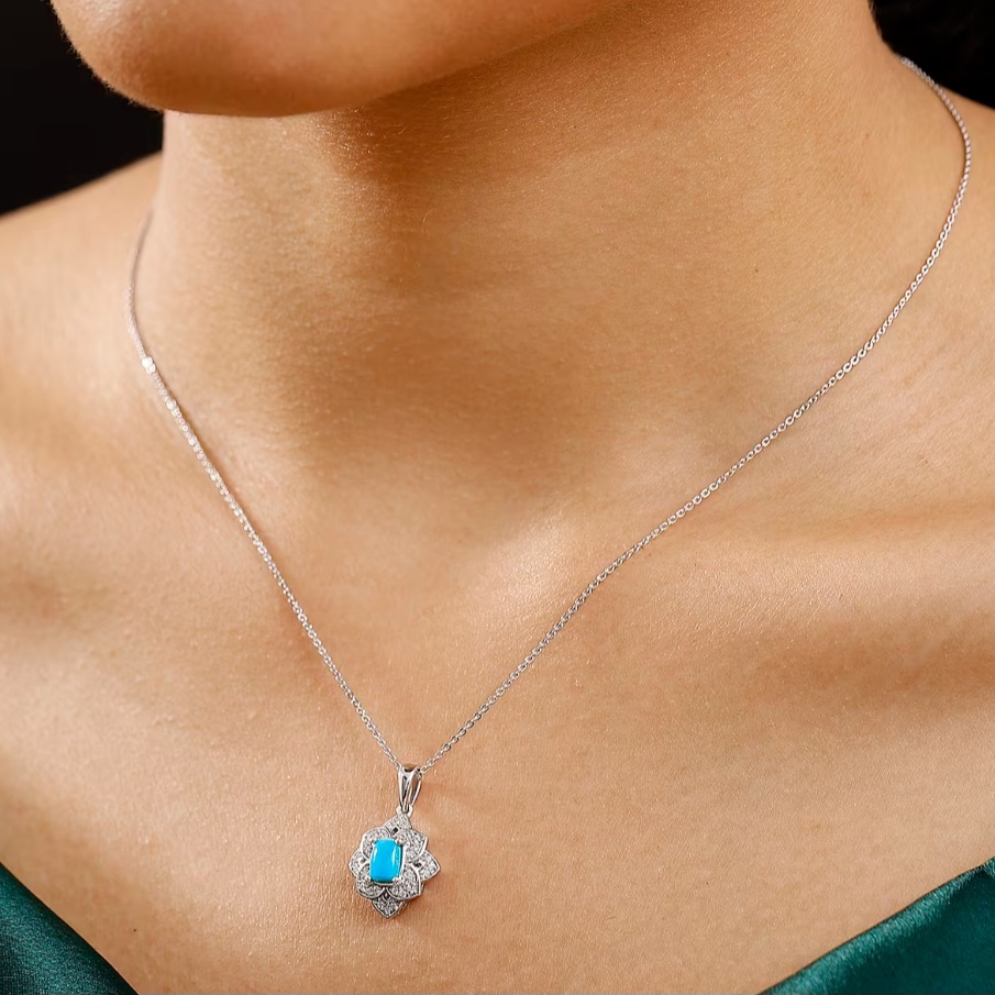 A refined, floral-inspired duo that brings Sleeping Beauty color to life. This matching ring and pendant necklace set centers around vivid 6x4mm turquoise cushions, each framed by a shimmering petal halo of precision-cut white zircon.