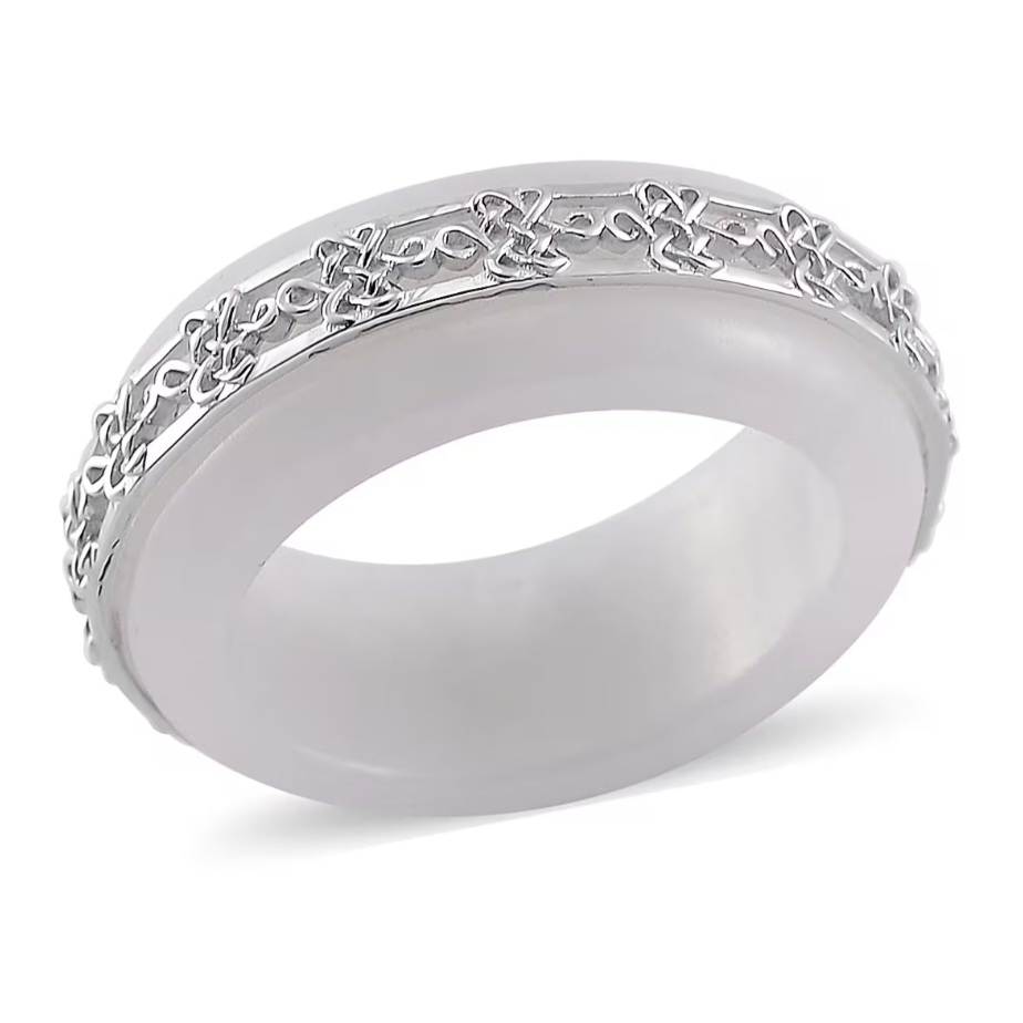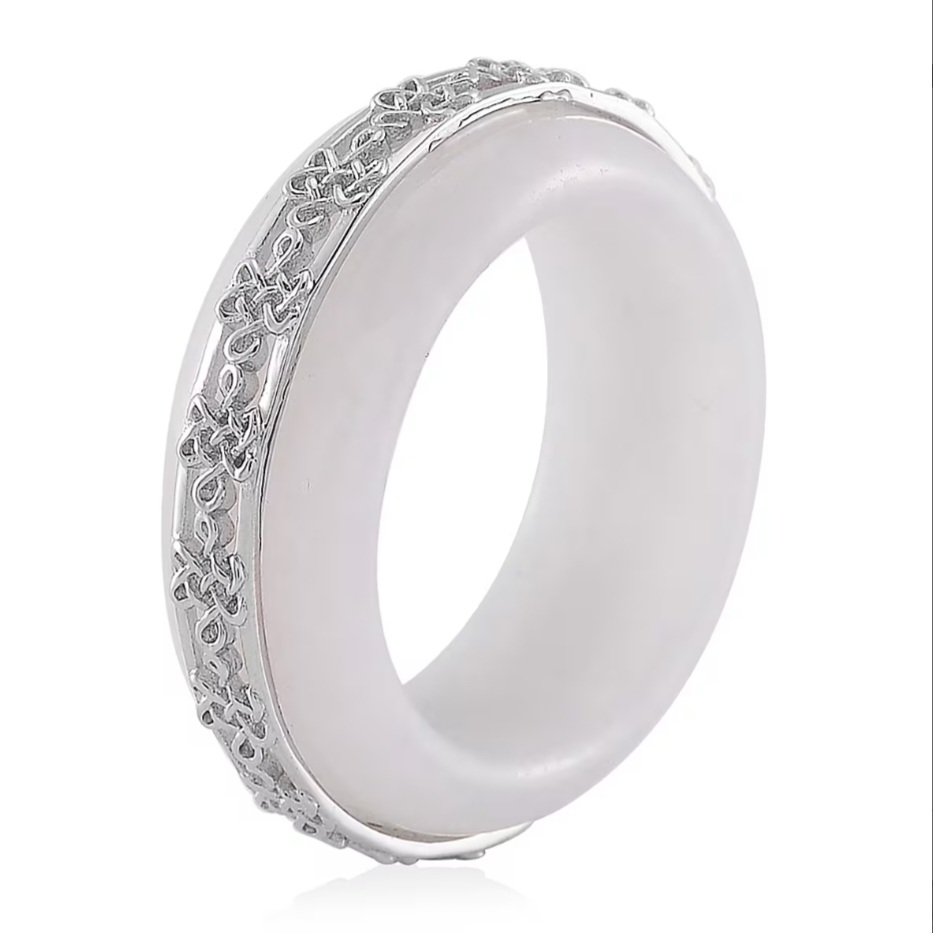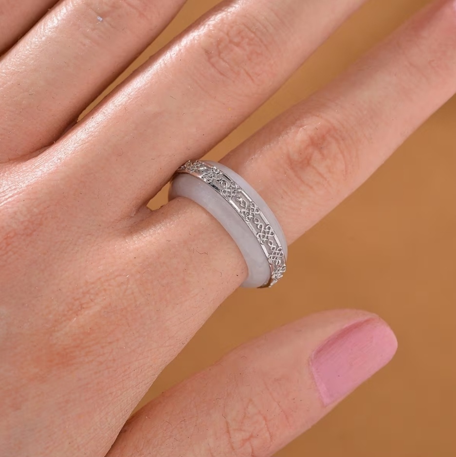 A full, sculpted band of cool white jadeite carved into a smooth free form ring, wrapped in rhodium over sterling silver detailing. The bright white scrollwork sits like a crown along the top edge, adding structure and contrast without taking away from the stone itself.