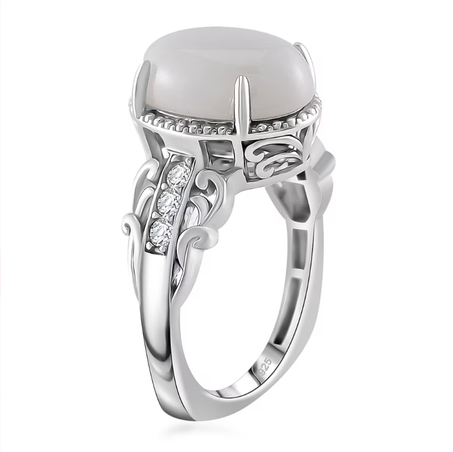 The setting is designed to support the scale of the jade while remaining balanced on the hand. Open scrollwork beneath the gallery keeps the structure light, while small round moissanite accents provide subtle brightness around the base of the center stone.