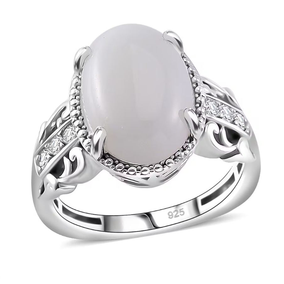 This ring centers on a 14x10mm oval cabochon of jadeite jade weighing 7.40 carats. The stone displays a soft white tone with gentle translucency, allowing light to move through the cabochon and emphasize the smooth polish typical of fine jade carvings.