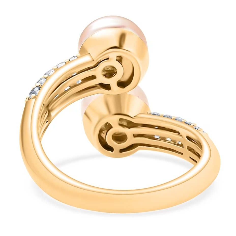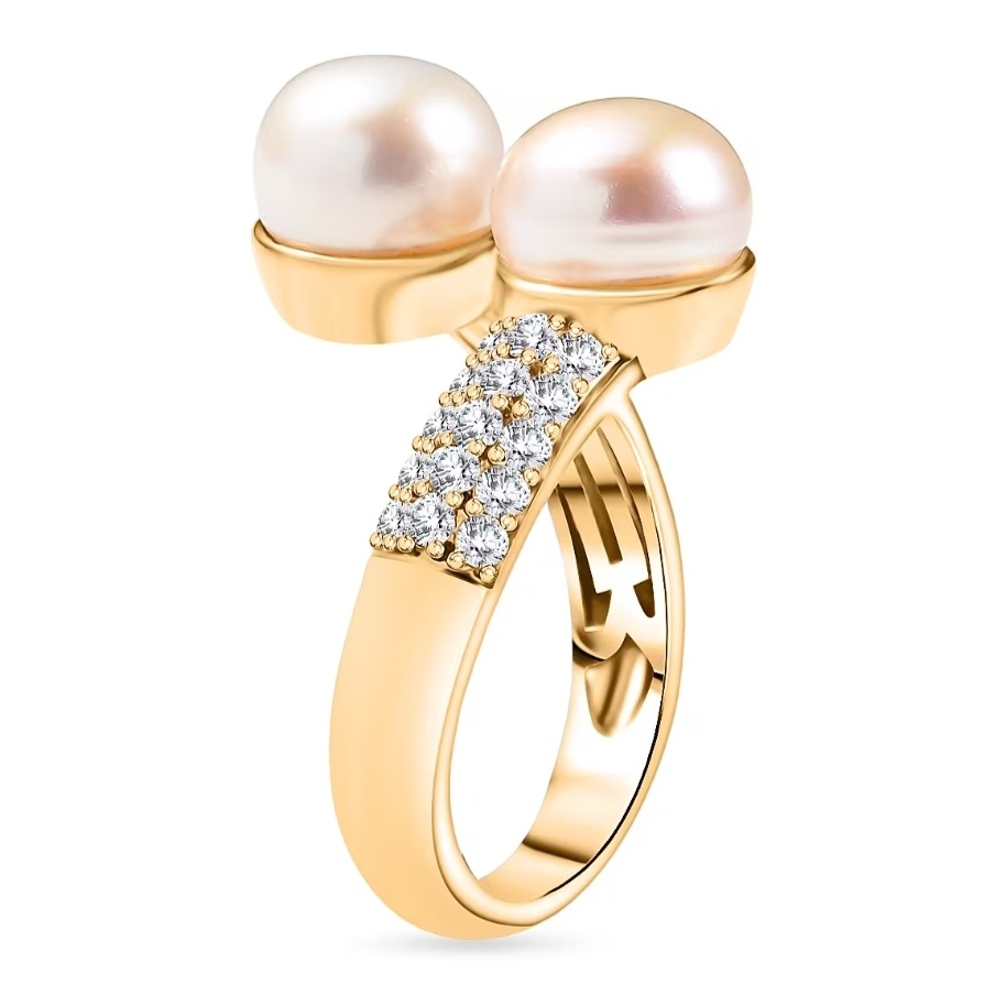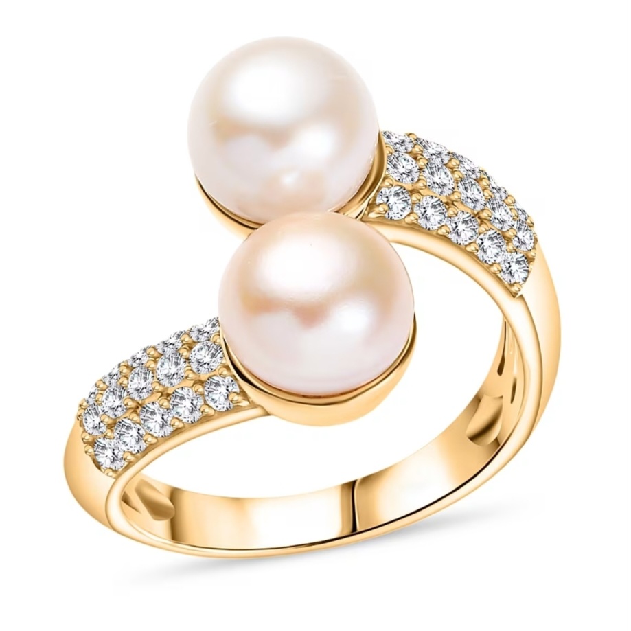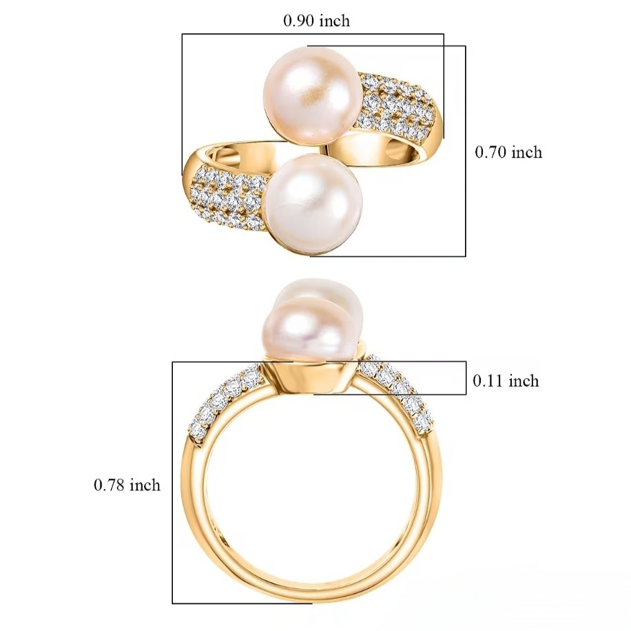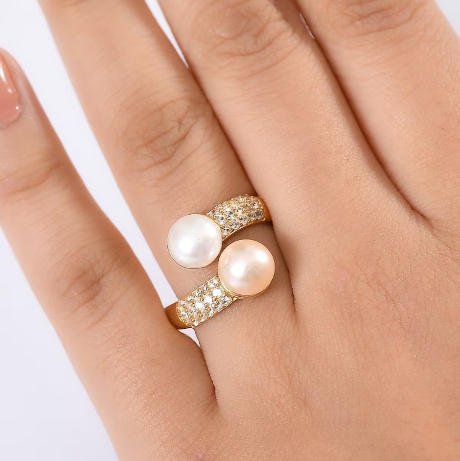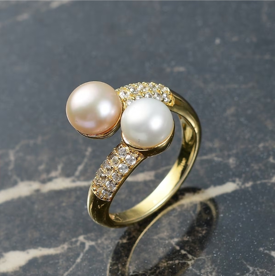 Two glowing freshwater pearls meet in an elegant bypass design, symbolizing harmony and balance. One blush-peach and one classic white pearl create a soft, complementary contrast, while sparkling white zircon accents sweep along each curve of the band for added brilliance. Crafted in solid sterling silver with a warm 18k yellow gold finish, this ring blends timeless femininity with a touch of modern luxury—perfect for any occasion.