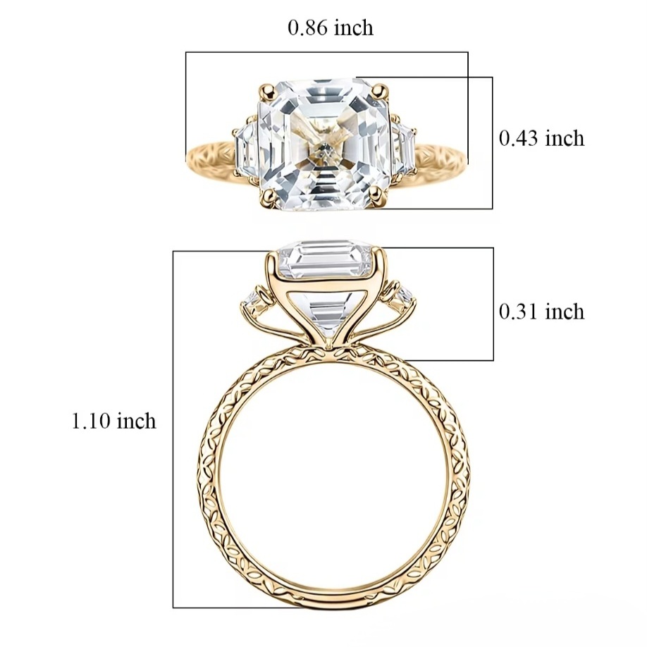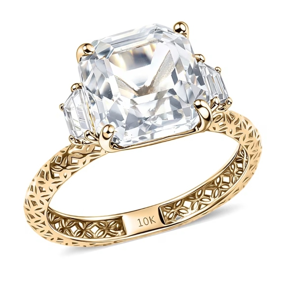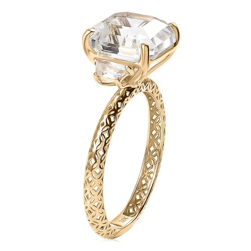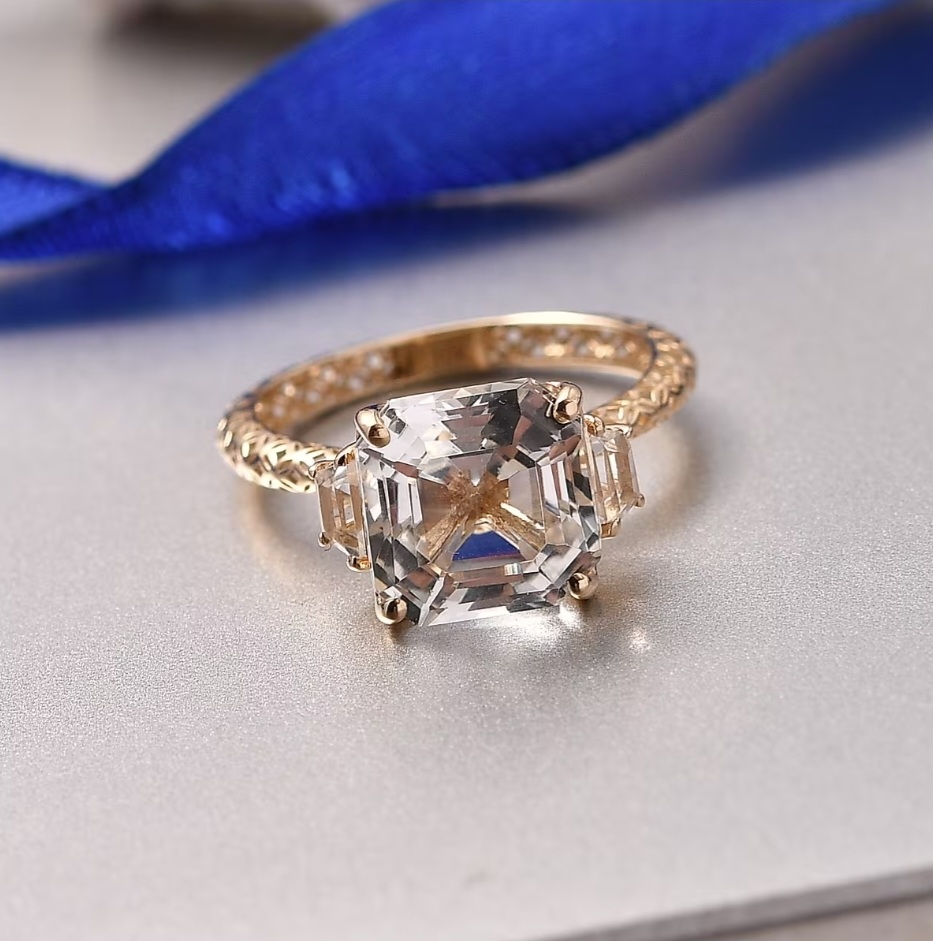 Flanking the center are trapezoid-cut white topaz accents totaling 0.65 carats. Their tapered shape mirrors the linear structure of the Asscher cut, reinforcing the ring’s balanced symmetry.