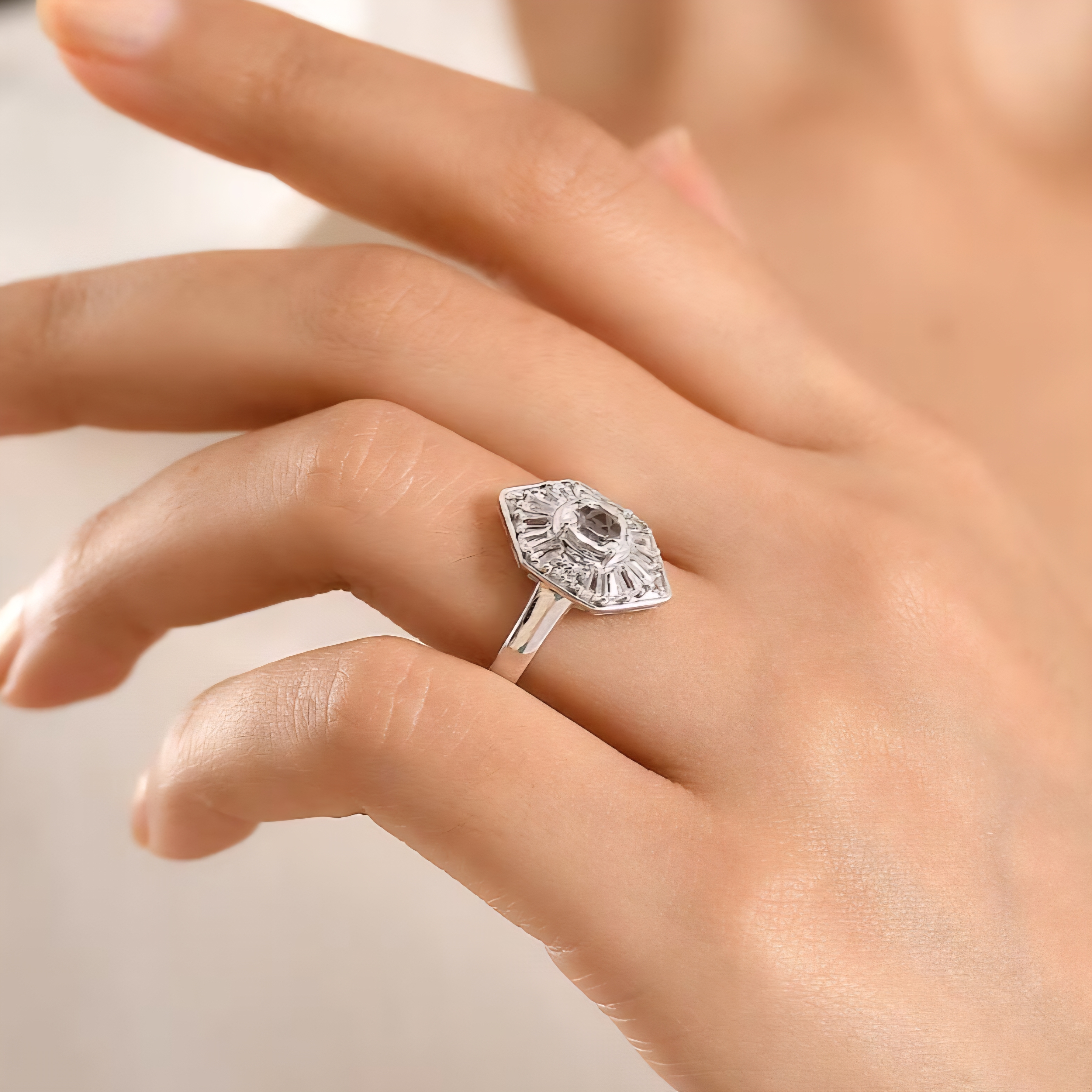 Surrounding the center stone is a structured halo of tapered baguette and round white topaz. The baguette stones create a radiant sunburst pattern that adds depth and geometric elegance, while the round accents enhance the sparkle of the overall design.