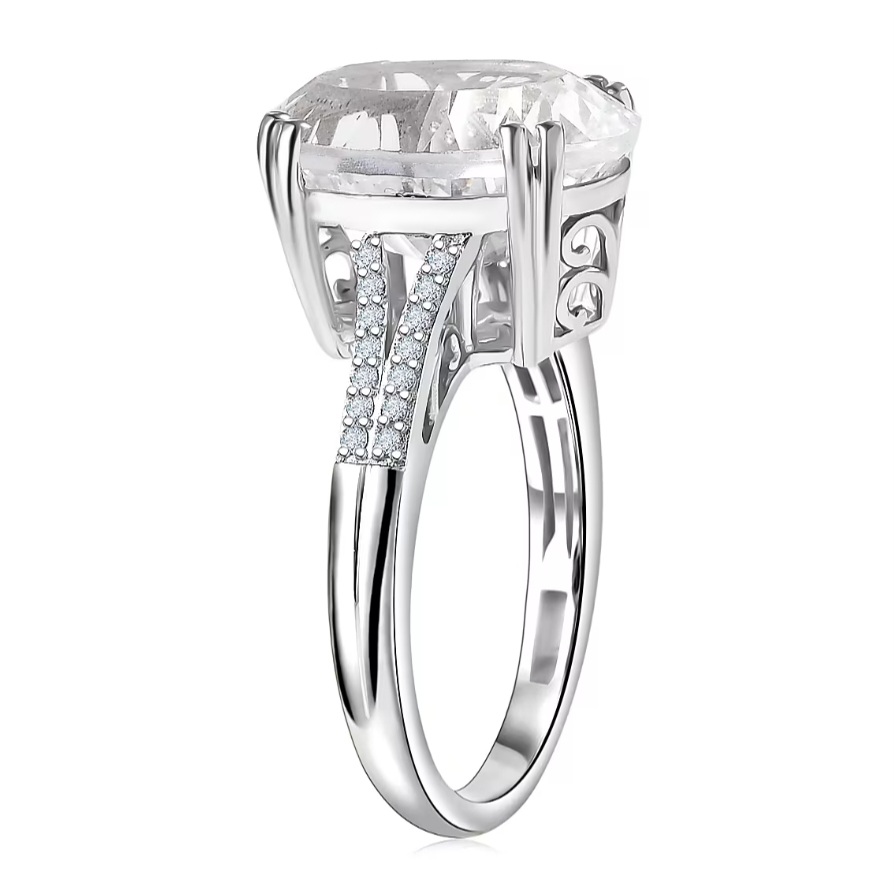 Subtle round white topaz accents (0.13ctw) line the shoulders, adding controlled sparkle without distracting from the center stone’s scale and performance.