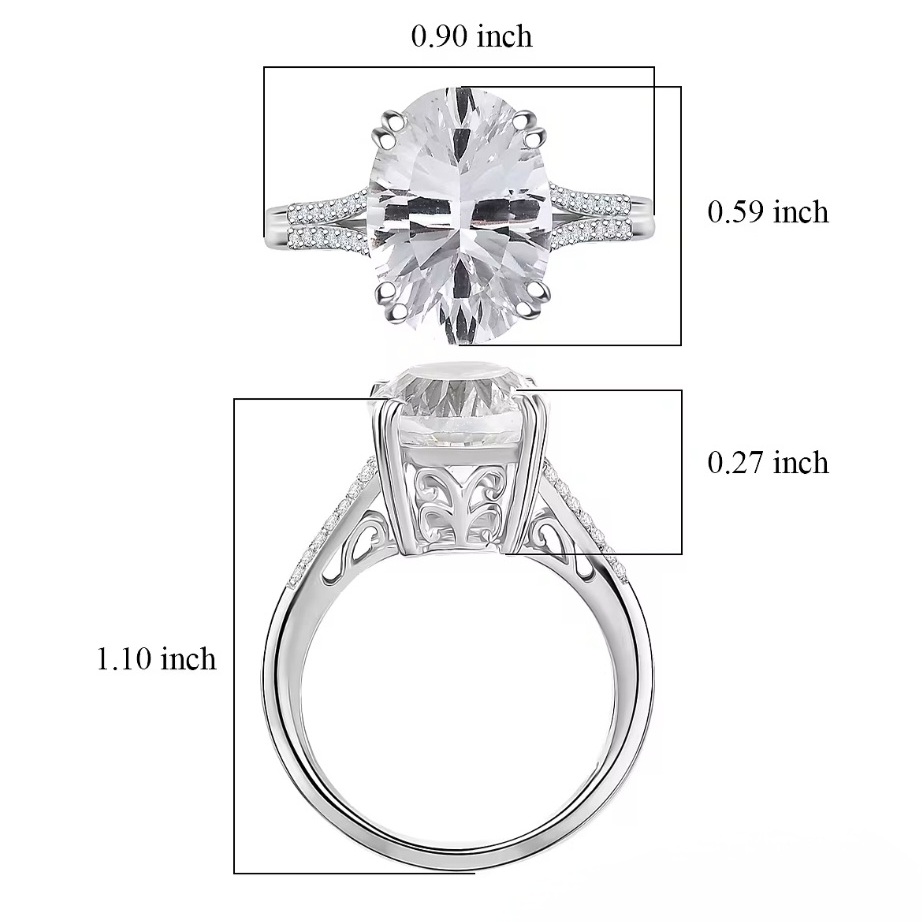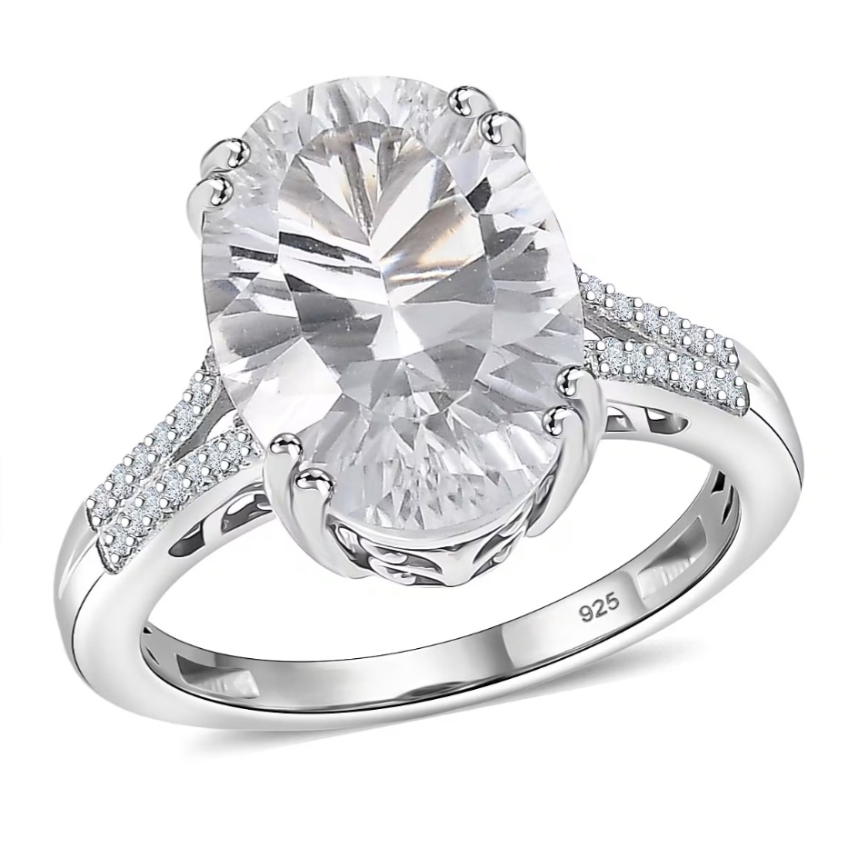 This ring centers on a 14x10mm oval white topaz weighing 7.22 carats, finished with a concave faceting pattern that amplifies internal reflection and creates a dynamic, almost liquid light effect across the surface.