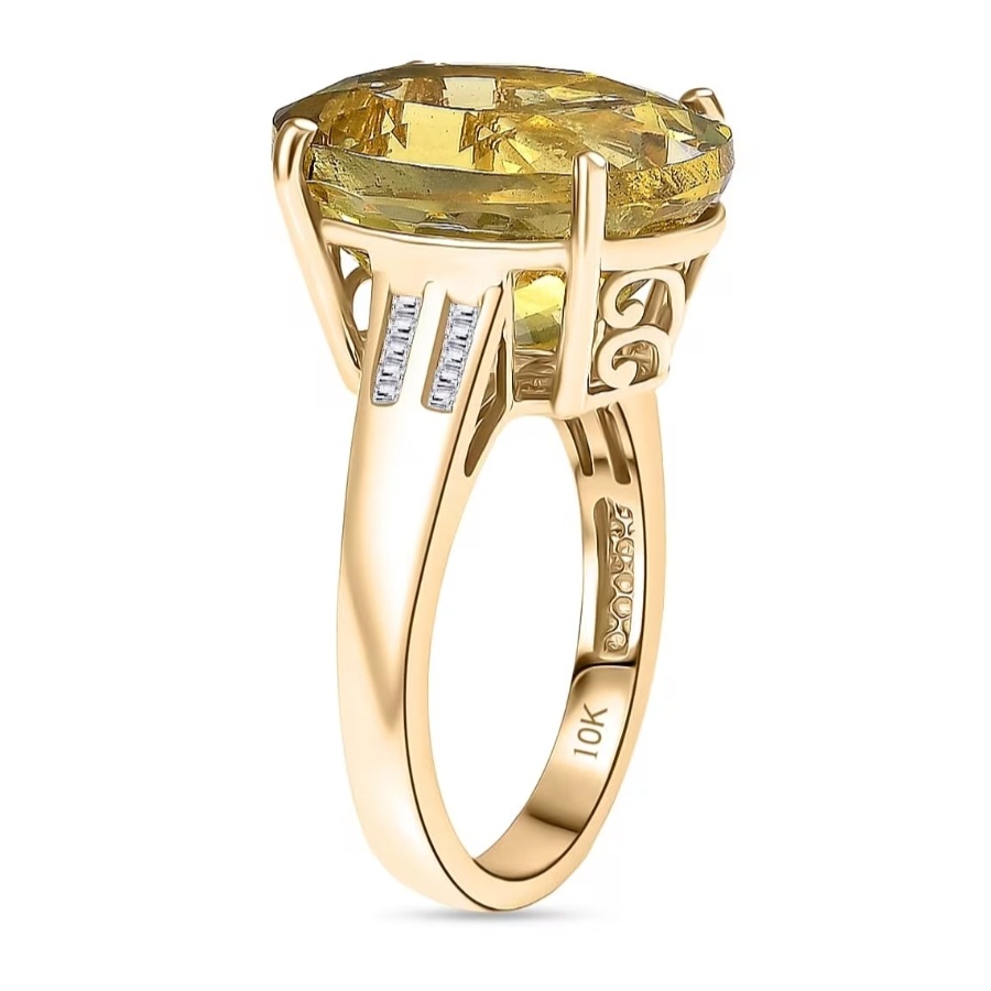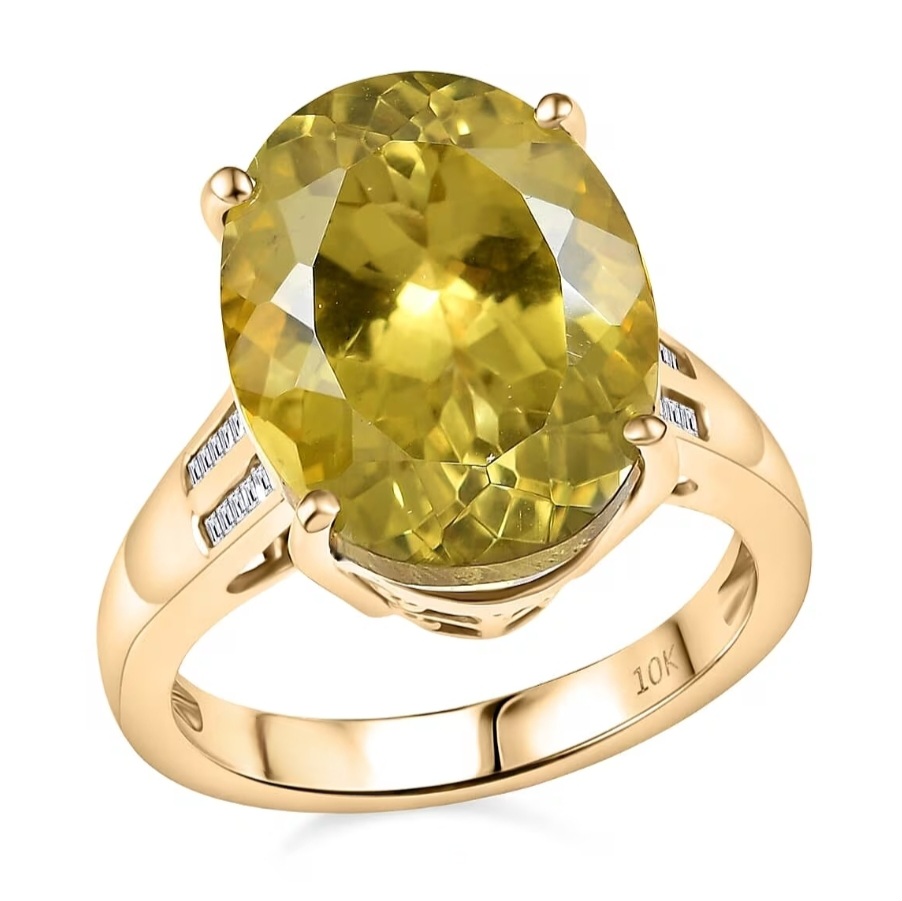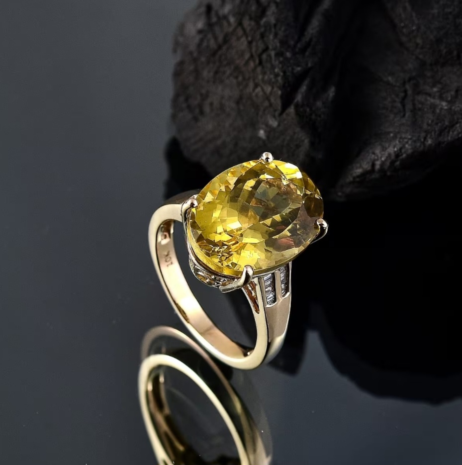 Each shoulder is adorned with a double row of channel-set natural diamonds (0.10ctw, G-H color, I1 clarity), adding crisp brilliance to the saturated golden centerpiece. Altogether, you’re looking at an impressive 11.70 carats of rare gemstone and diamond perfection in a design that’s refined, timeless, and impossible to ignore.