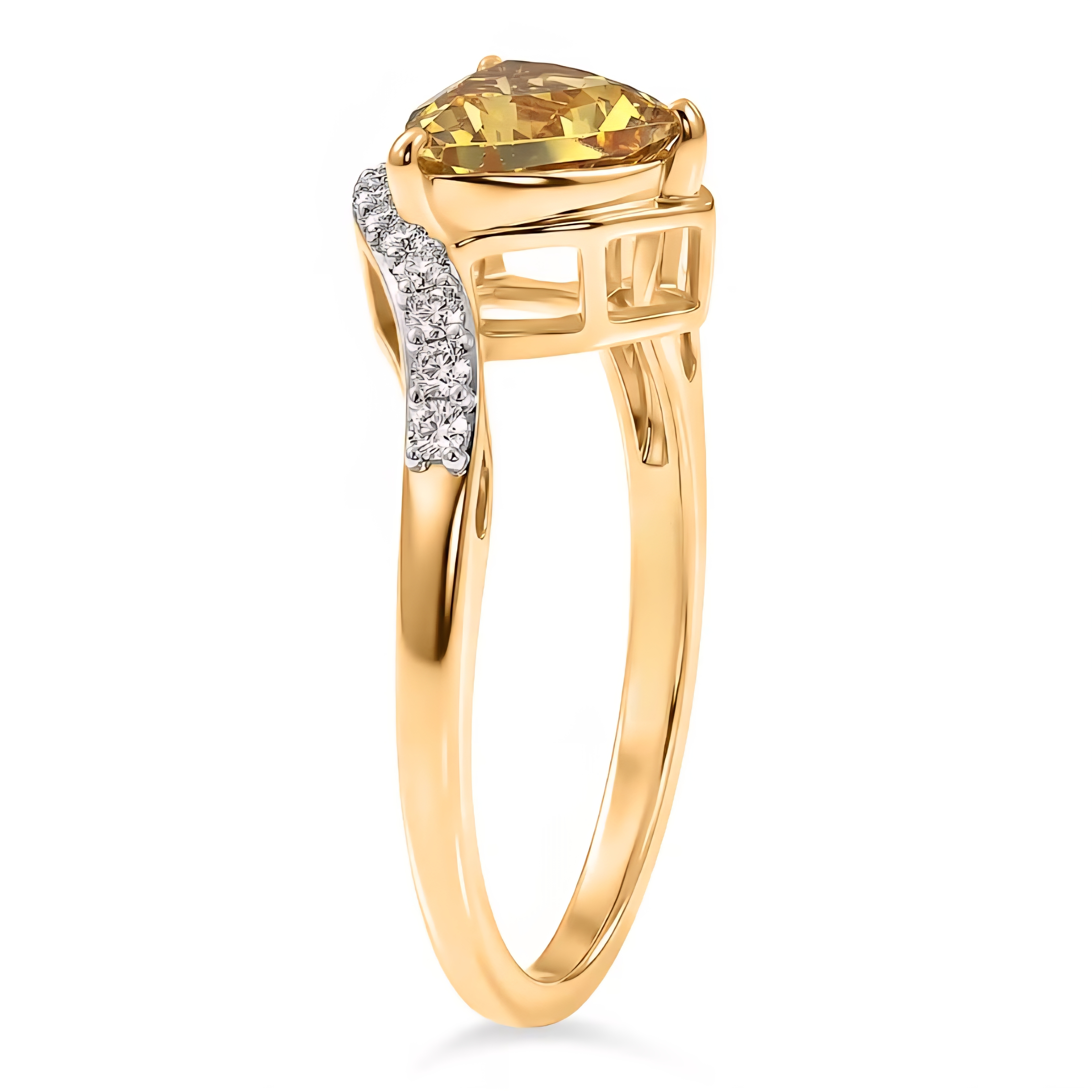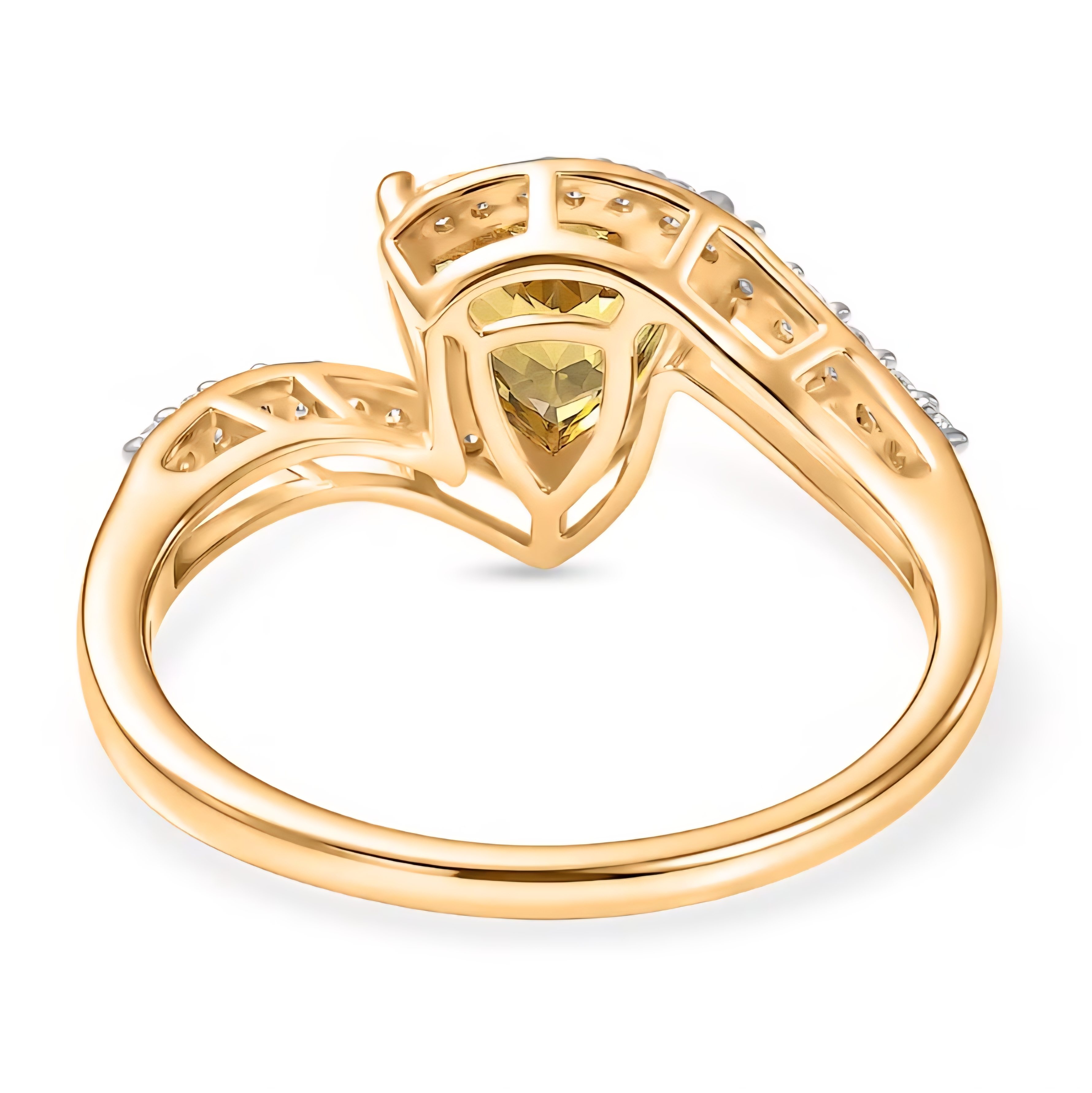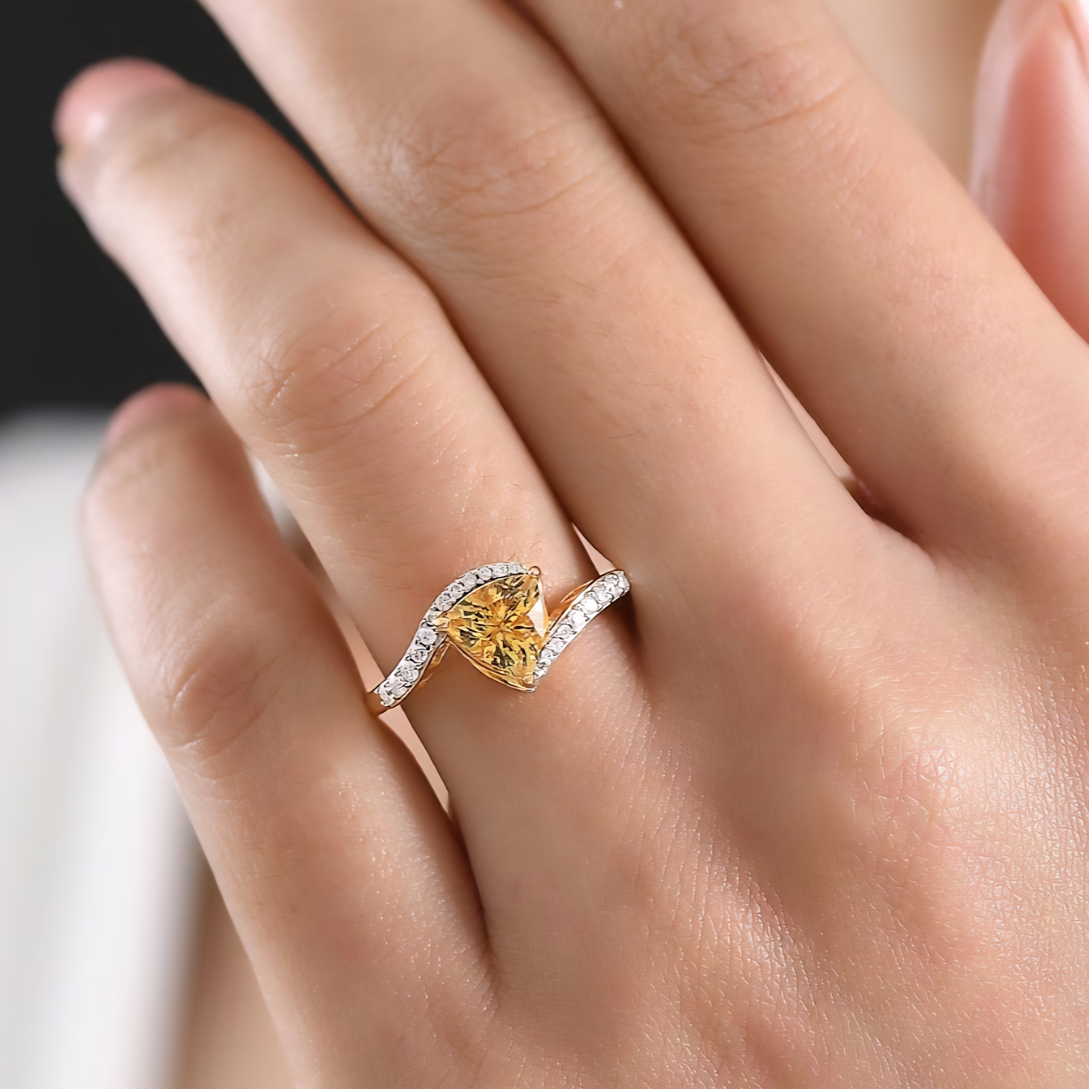 This bypass ring features a vivid yellow apatite from Madagascar, cut into a sharp 7mm trillion that delivers strong brilliance and crisp geometry. The open bypass design wraps the center stone with flowing lines, accented by bright moissanite along the shoulders for added contrast and sparkle. Finished in 18K yellow gold over solid sterling silver, this ring balances bold color with clean, modern structure.