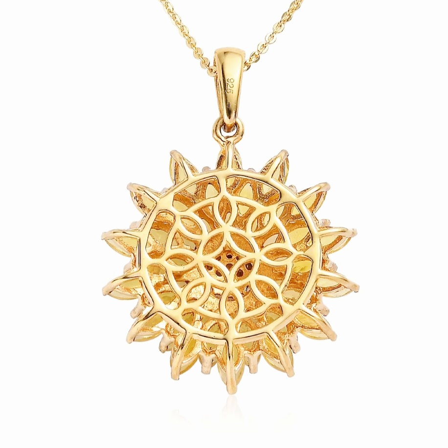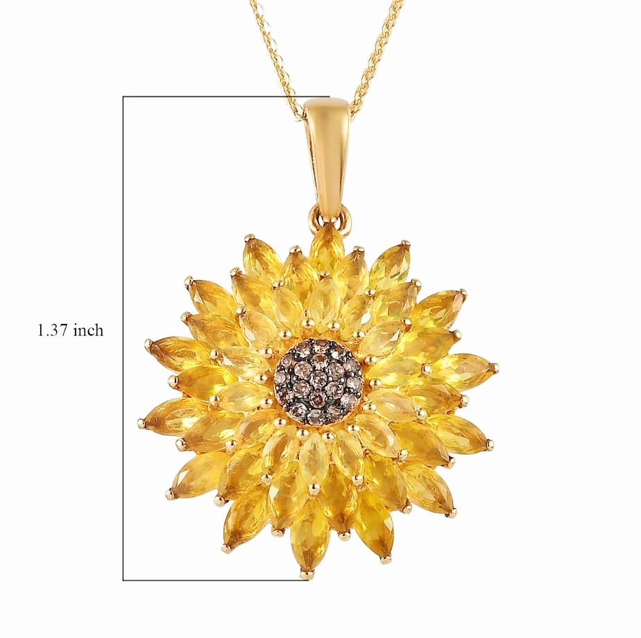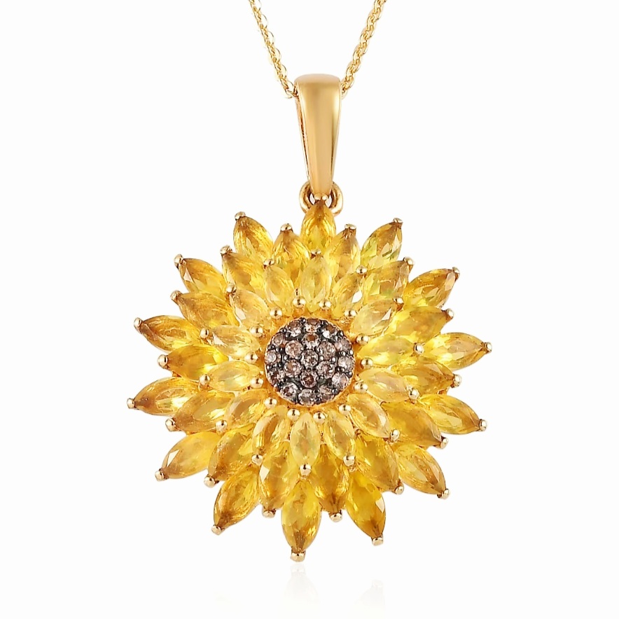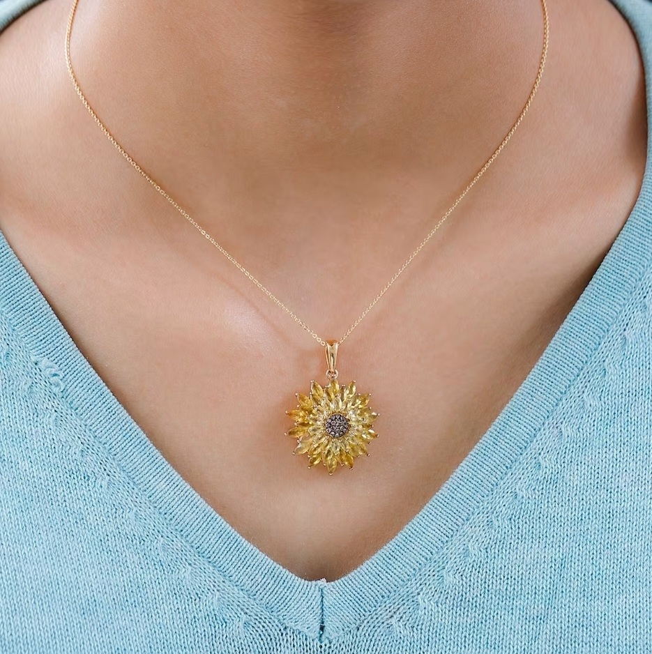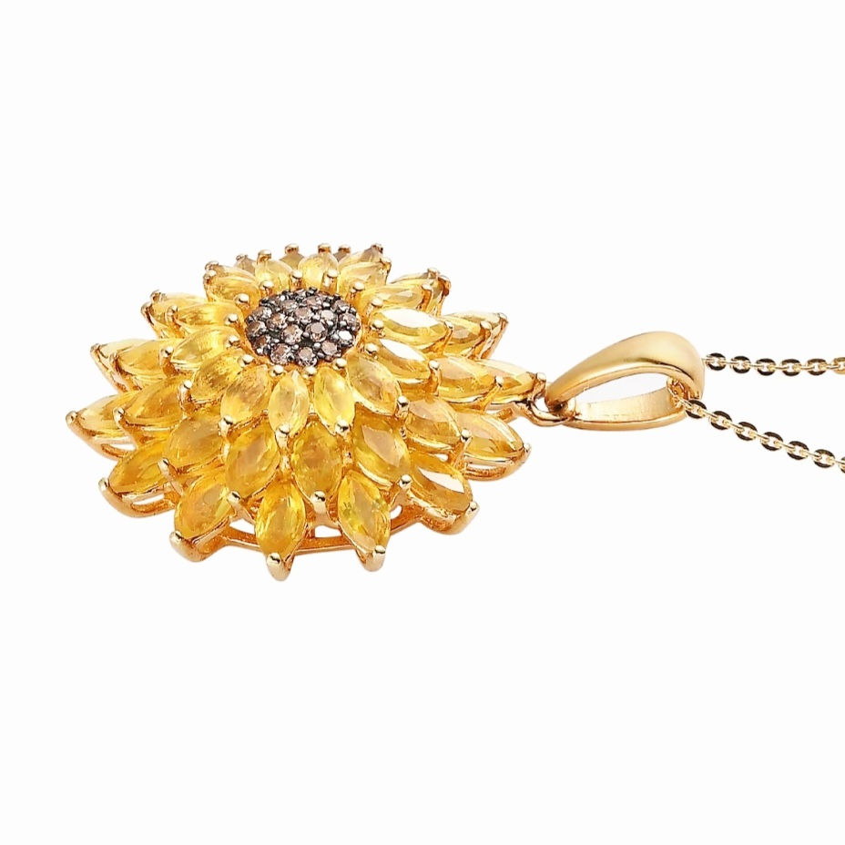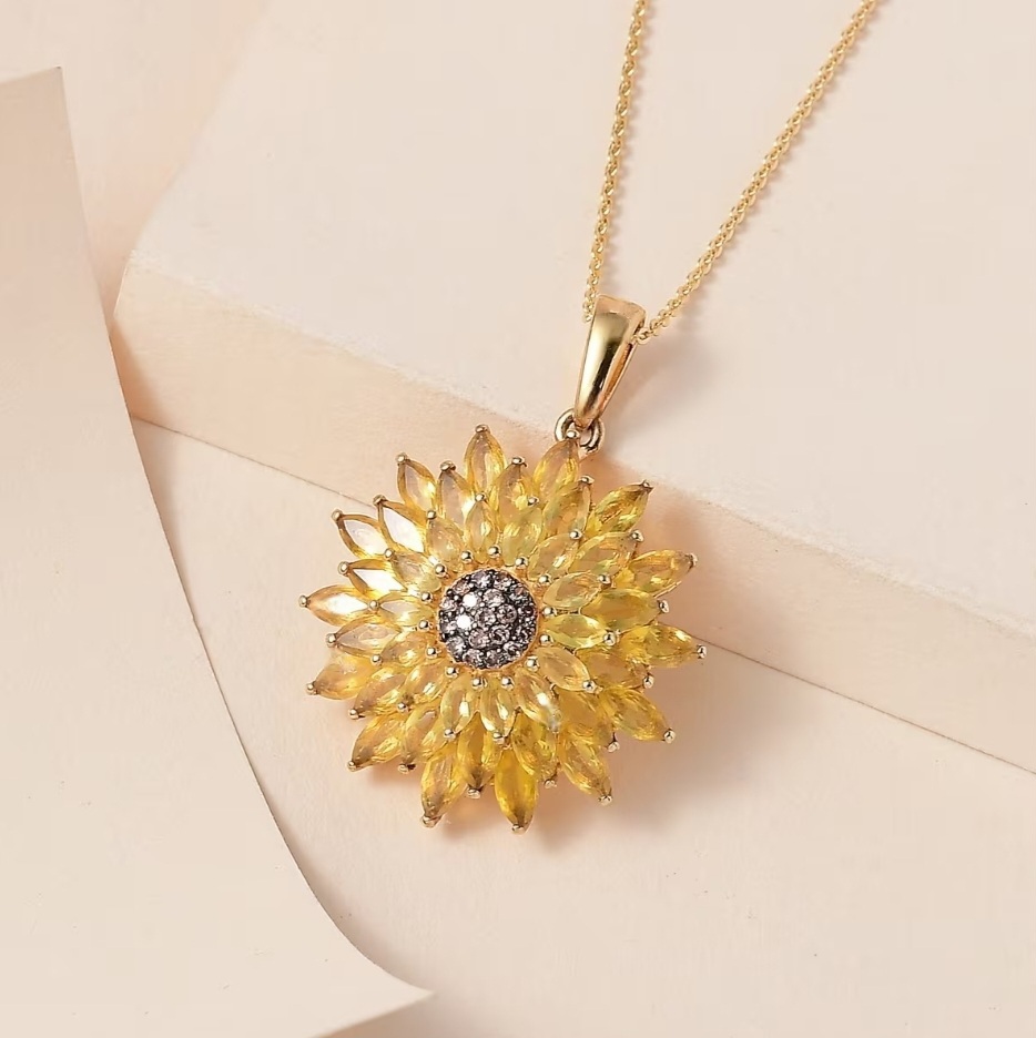A bright sunflower you can wear. Marquise-cut yellow opal “petals” radiate crisp, saturated color while a pavé center of brown zircon adds rich contrast and sparkle. The pendant is fully finished front to back, with clean prong work and a smooth, comfortable back—built in solid sterling silver and finished in warm 18k yellow gold with black-rhodiumed prongs for the center stones. It lands in that sweet spot between playful and polished, making an easy statement layered or solo, day or night.