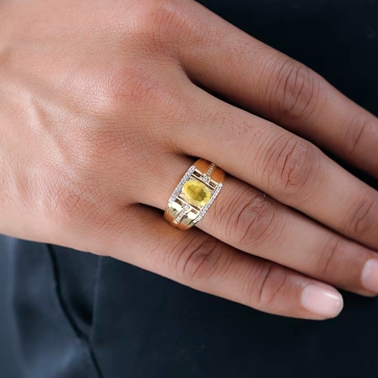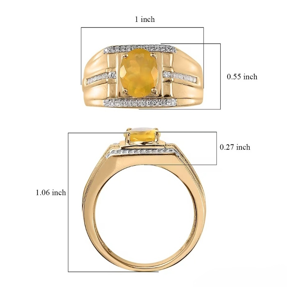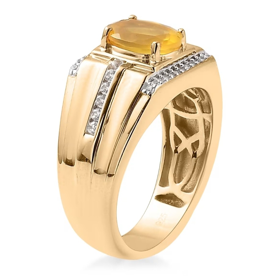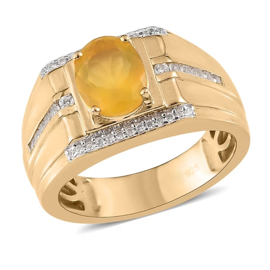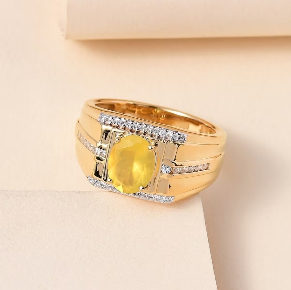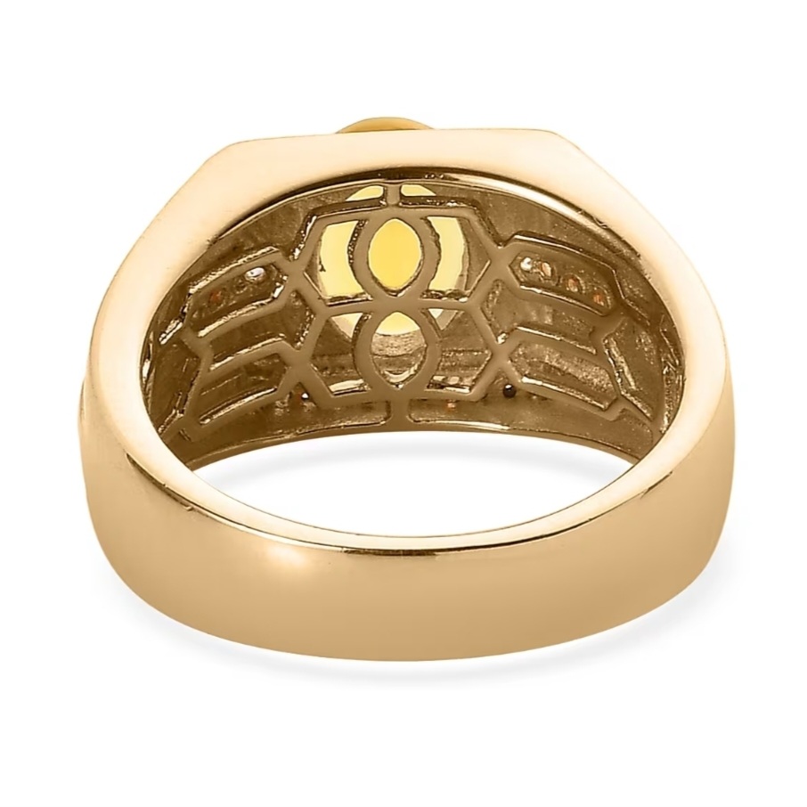 This commanding men’s ring brings together bold geometry and fine gem detail. At its center, a vivid canary-yellow Tanzanian Opal radiates warm, translucent fire—anchored in a polished, wide-band design that speaks of precision and strength. Rows of pavé-set white zircons cut across the angular shoulders, their clean sparkle contrasting the opal’s inner glow. The mounting is crafted in solid sterling silver with a thick layer of 18k yellow gold for lasting durability and weight, accented by rhodium detailing around the prongs for extra brilliance. Designed for modern sophistication, it’s a statement of craftsmanship that balances luxury with everyday wearability.
