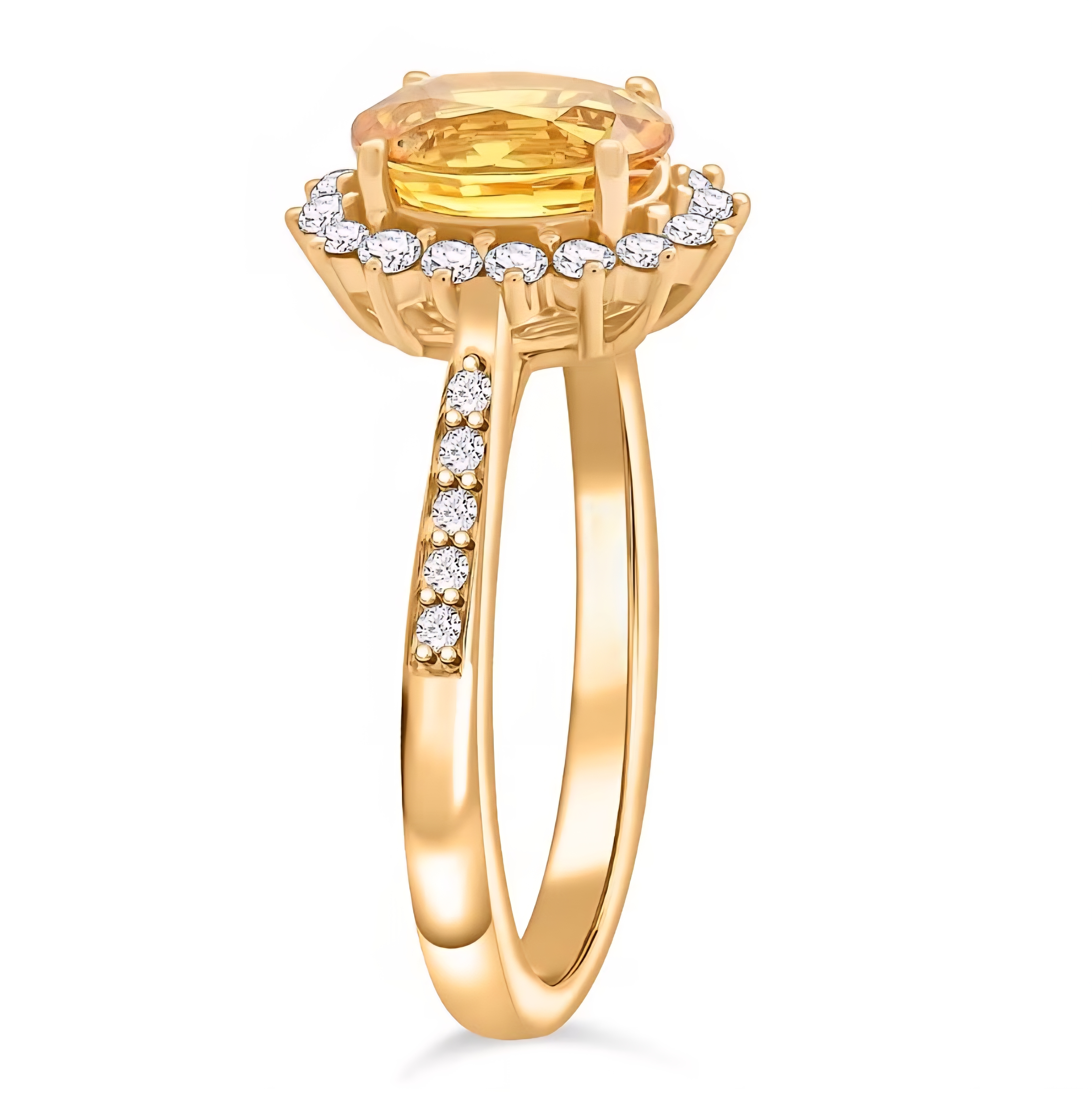 A classic diamond halo frames the sapphire with clean, high-contrast brilliance, amplifying its size and fire without stealing the spotlight. The diamonds continue down the shoulders, adding sparkle from every angle and giving the ring a balanced, finished look on the hand. Crafted in solid 14K yellow gold, the setting reinforces the warmth of the sapphire while providing lasting structure and weight.