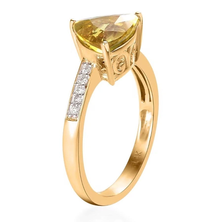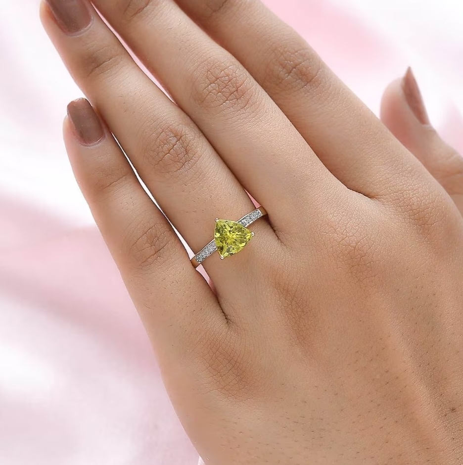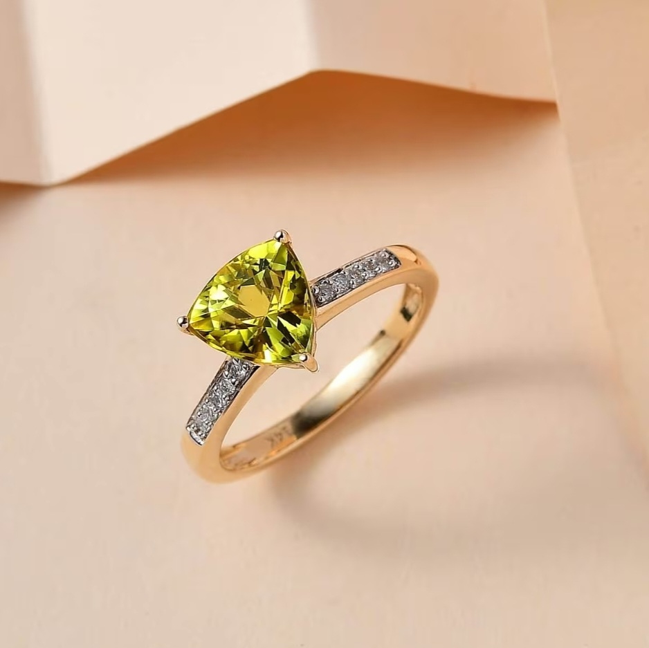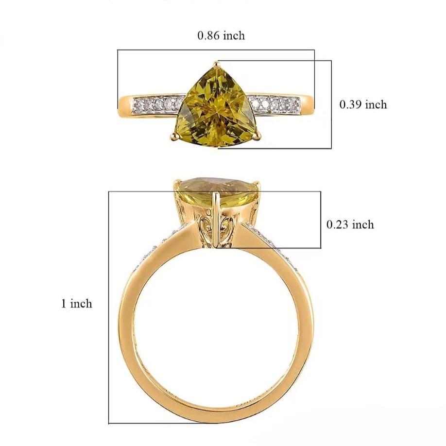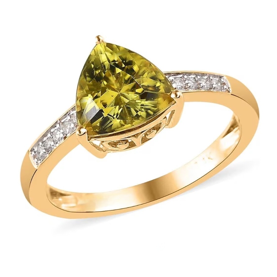 This is classic jewelry done right—no gimmicks, no drama, just a knockout canary yellow tourmaline taking center stage. The 8mm trillion cut shows off its sun-lit saturation with crisp, bright facets that keep the color vivid from every angle. A line of white diamonds along the shoulders adds just enough lift and sparkle to frame the tourmaline without stealing attention.