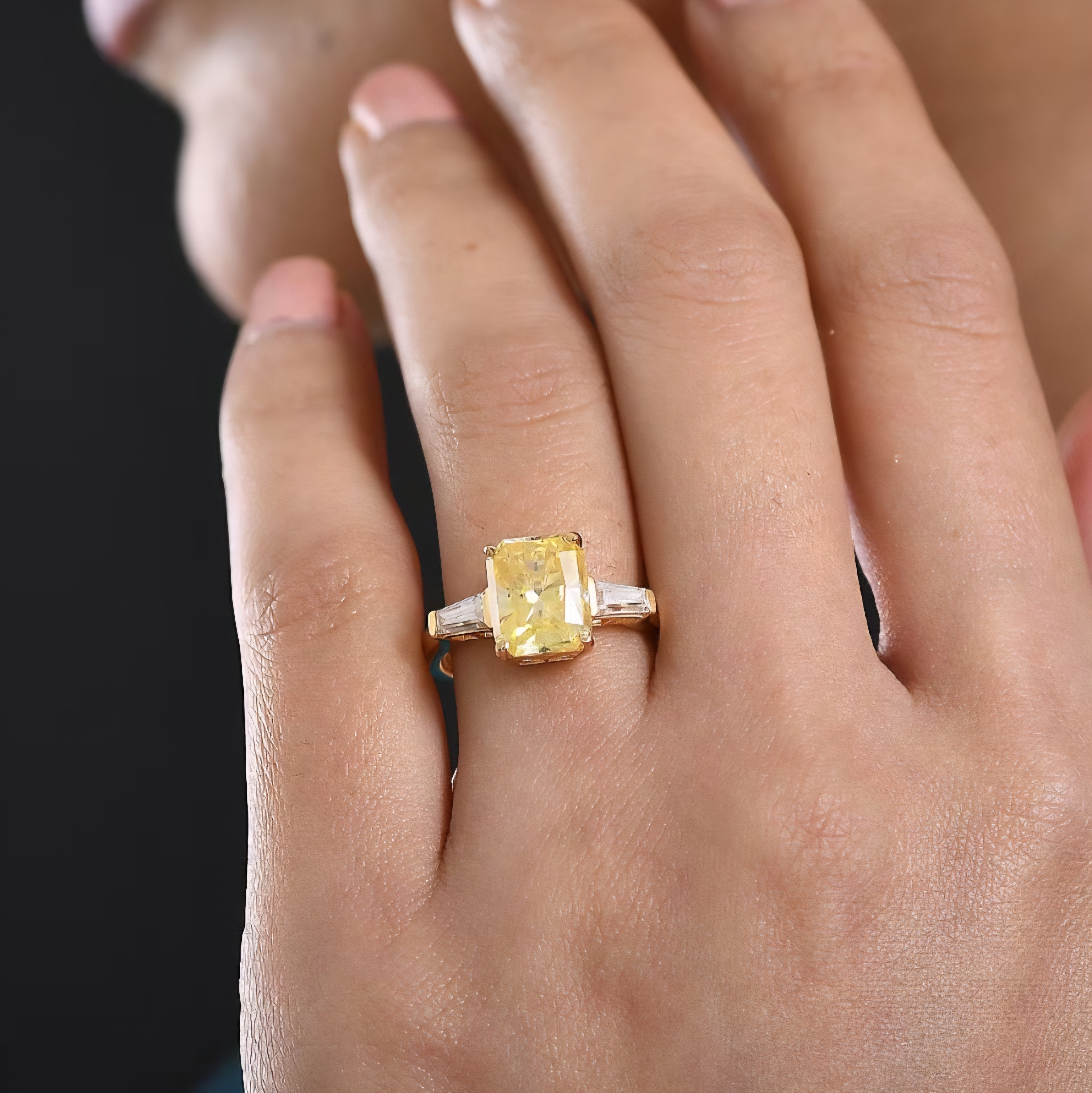A bold emerald cut yellow moissanite takes center stage in this clean, architectural solitaire ring. Tapered white moissanite baguettes enhance the symmetry and brilliance of the design, while 18K yellow gold plating over sterling silver adds warmth and contrast. Strong, refined, and intentionally minimal.