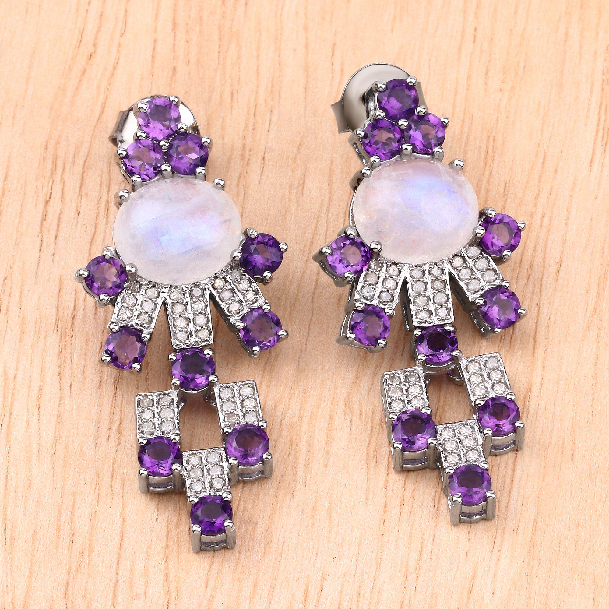 Surrounding and extending from the moonstone are round amethyst accents, approximately 4mm, adding rich purple contrast and depth. White diamonds are set throughout the design, providing fine sparkle and structure that ties the entire piece together.