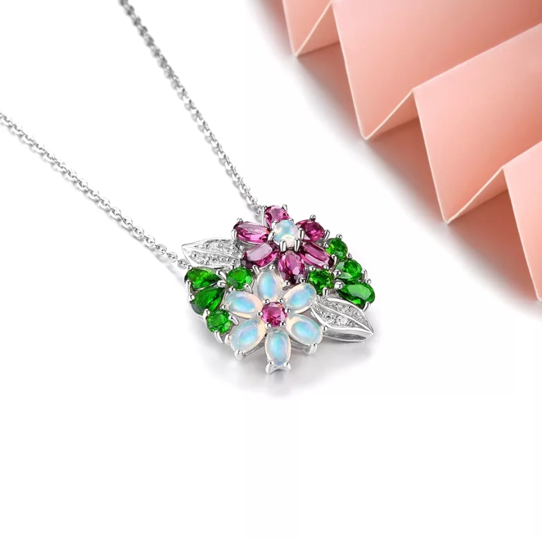 This amazing pendant necklace features a stunning mix of natural colored gemstones. You have natural Rhodolite Garnet, Ethiopian Opal, Chrome Diopside & White Zircon 4.00ctw. The stones are set in a beautiful floral pattern. The pendant and chain are crafted in solid 925 Sterling Silver with your choice in Rhodium over, 18K Yellow Gold Over or 18K Rose Gold over 5.3g. We also have the matching ring avaliable if you want to complete this jewelry set.