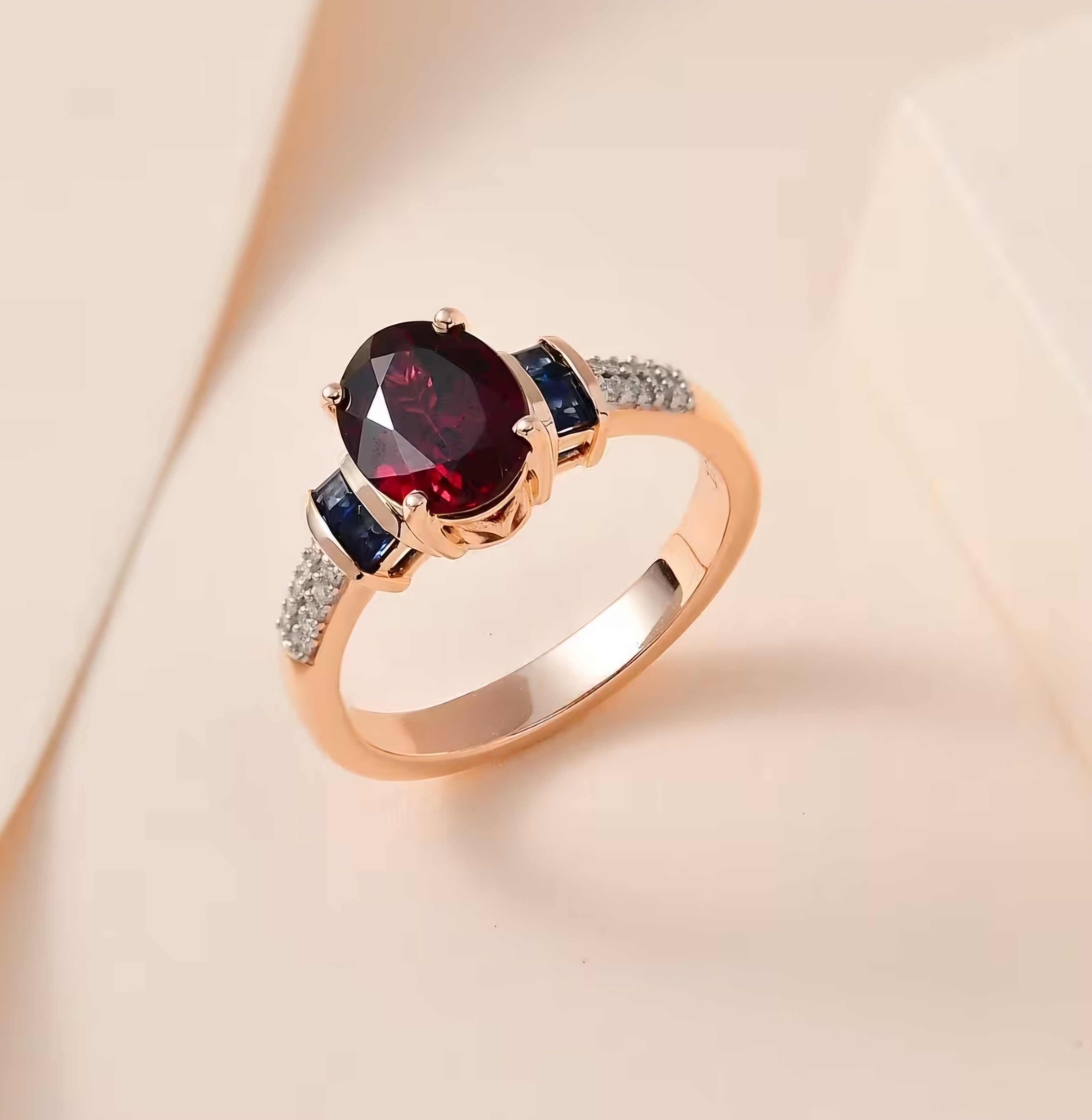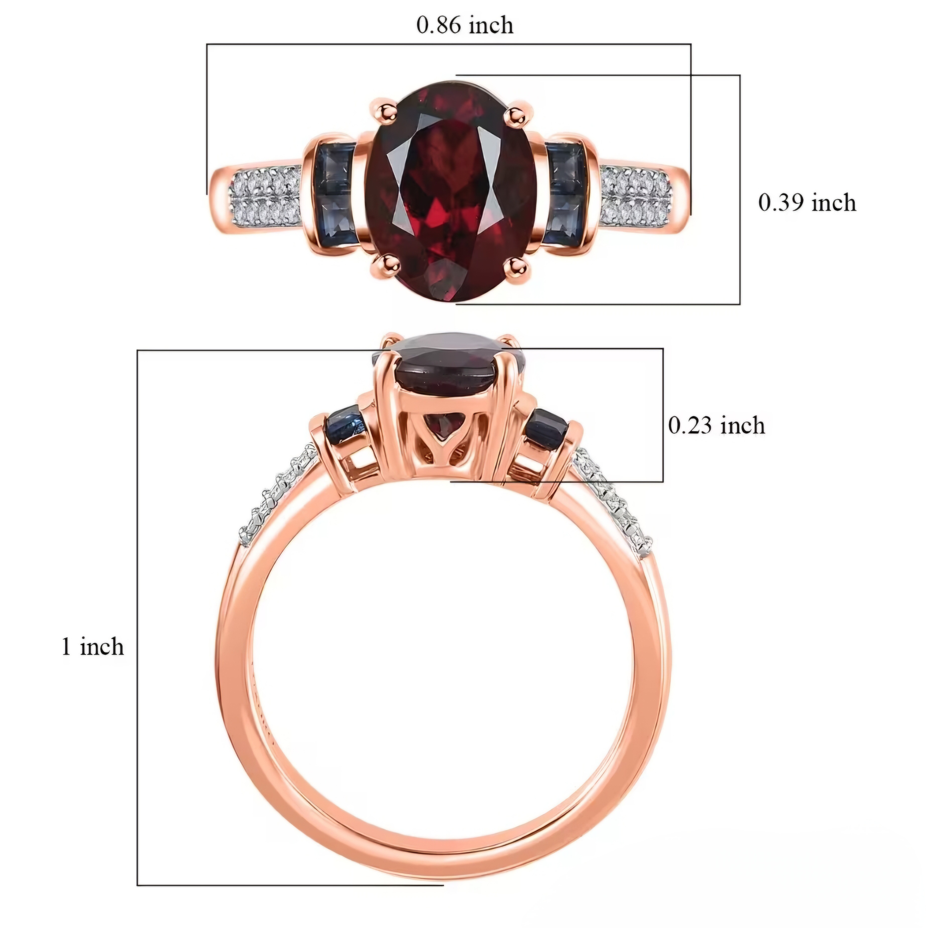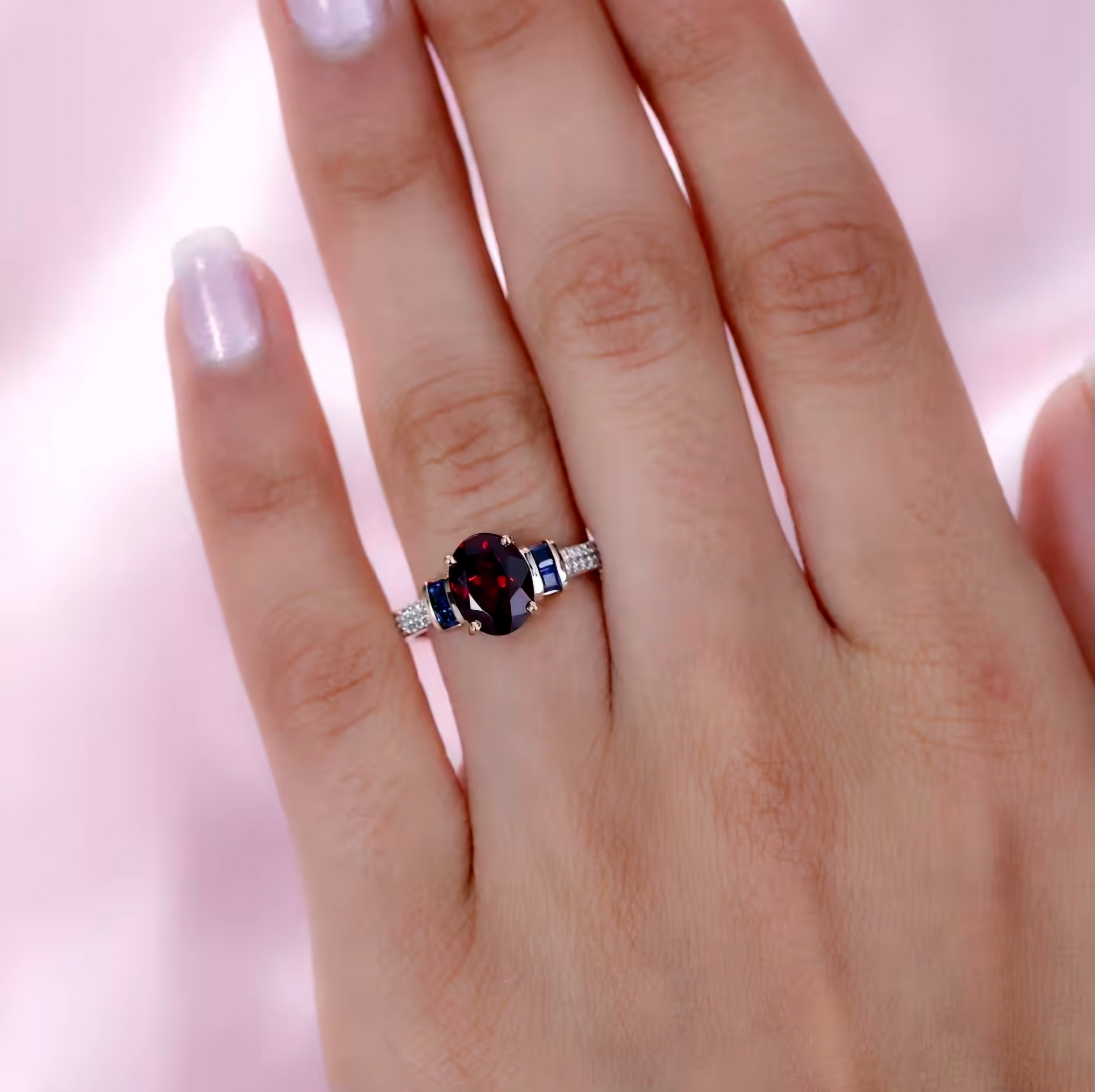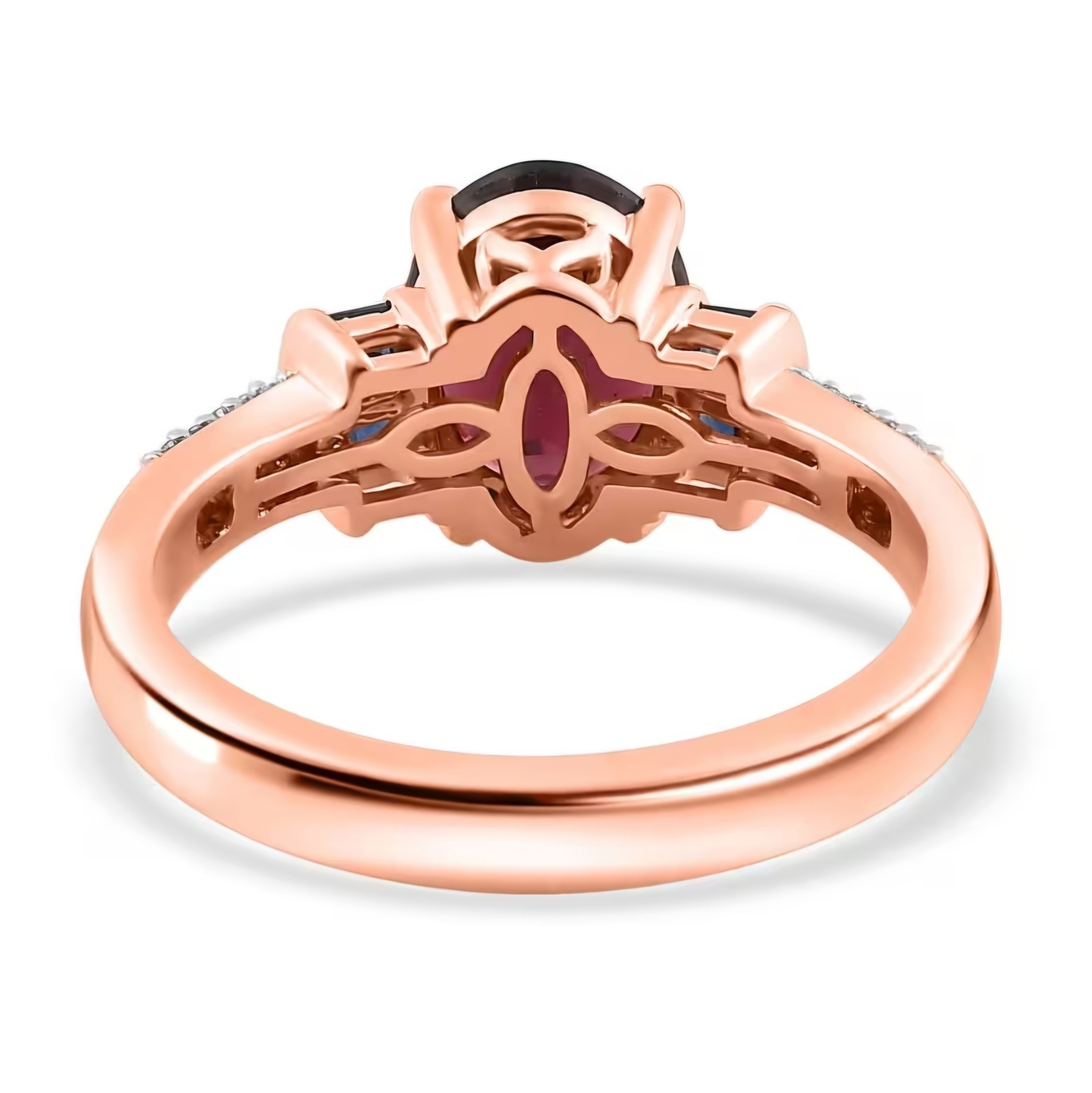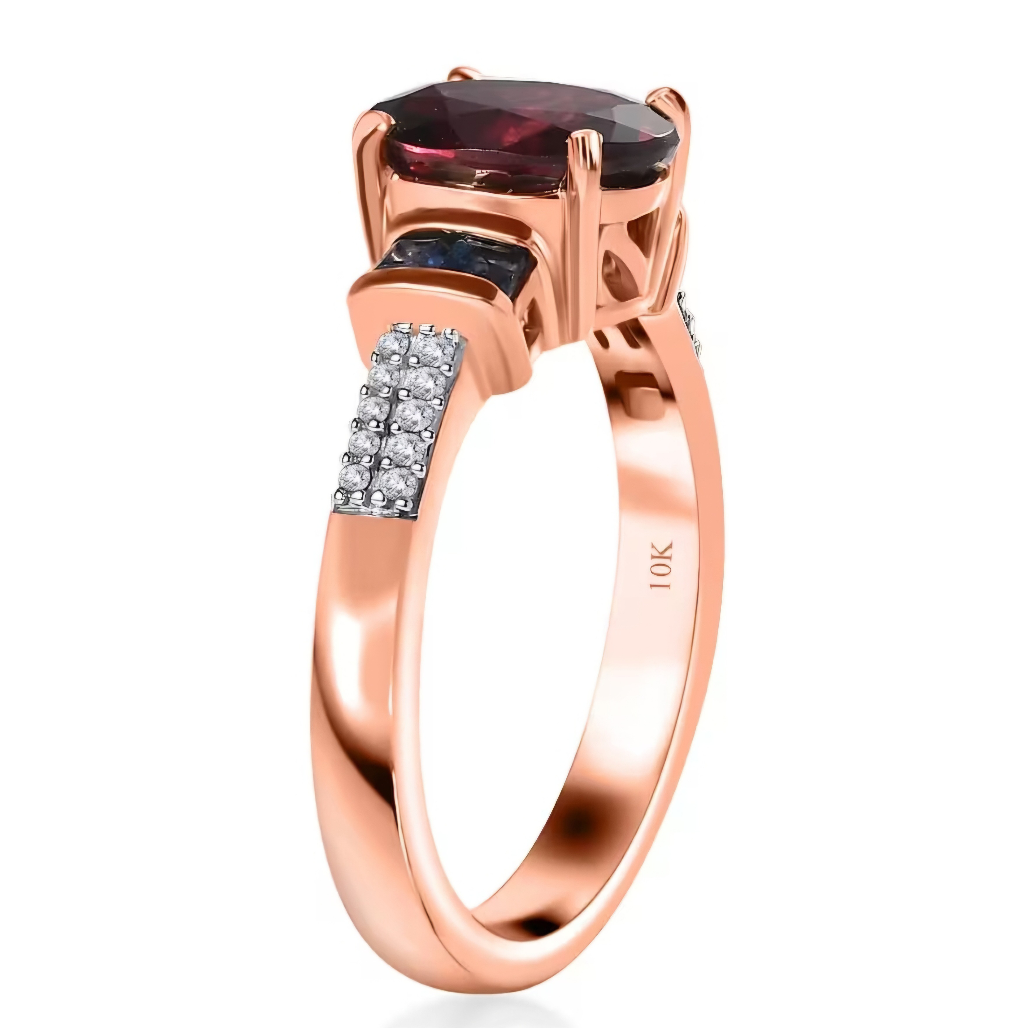 This stunning ring features a 9x7mm oval cut natural Tanzanian Rhodolite Garnet center stone, flanked by square cut blue sapphires on either side. The shank sides are adorned with a double row of round cut white diamonds, adding a touch of elegance to this pretty piece. Crafted in solid 10k Rose Gold, this ring boasts a total carat weight of 2.60ctw.