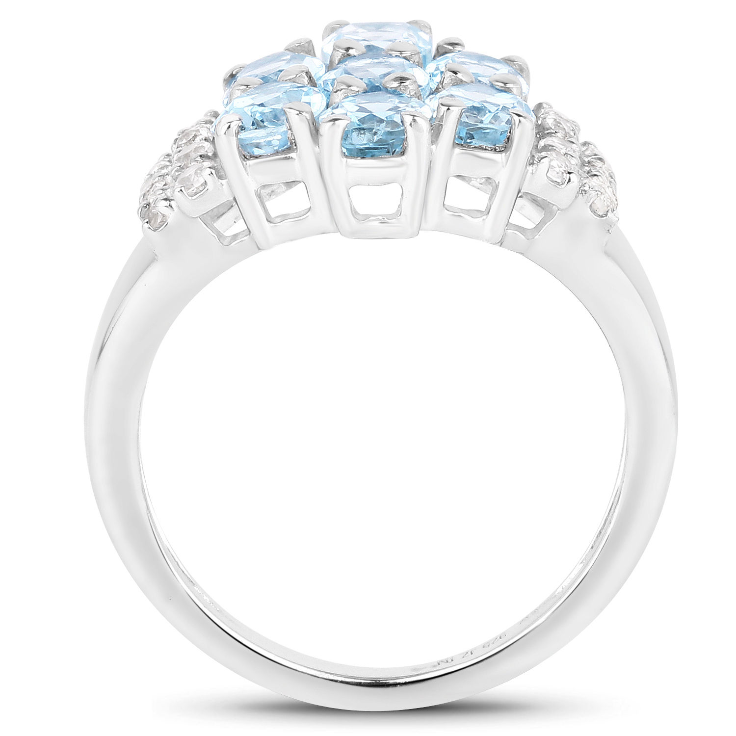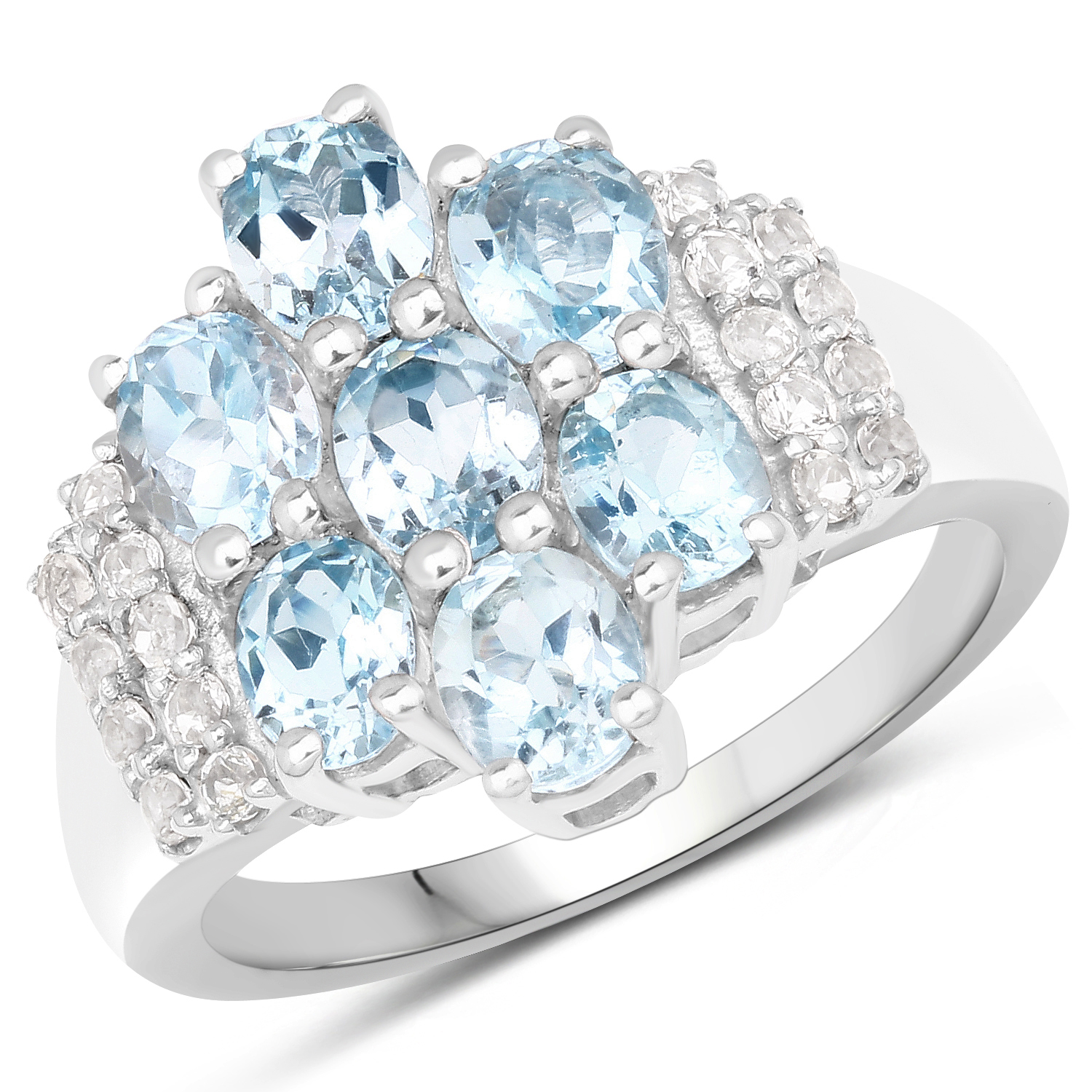Crafted in rhodium-plated sterling silver, the ring has a clean, polished finish that complements the cool tones of the gemstones.