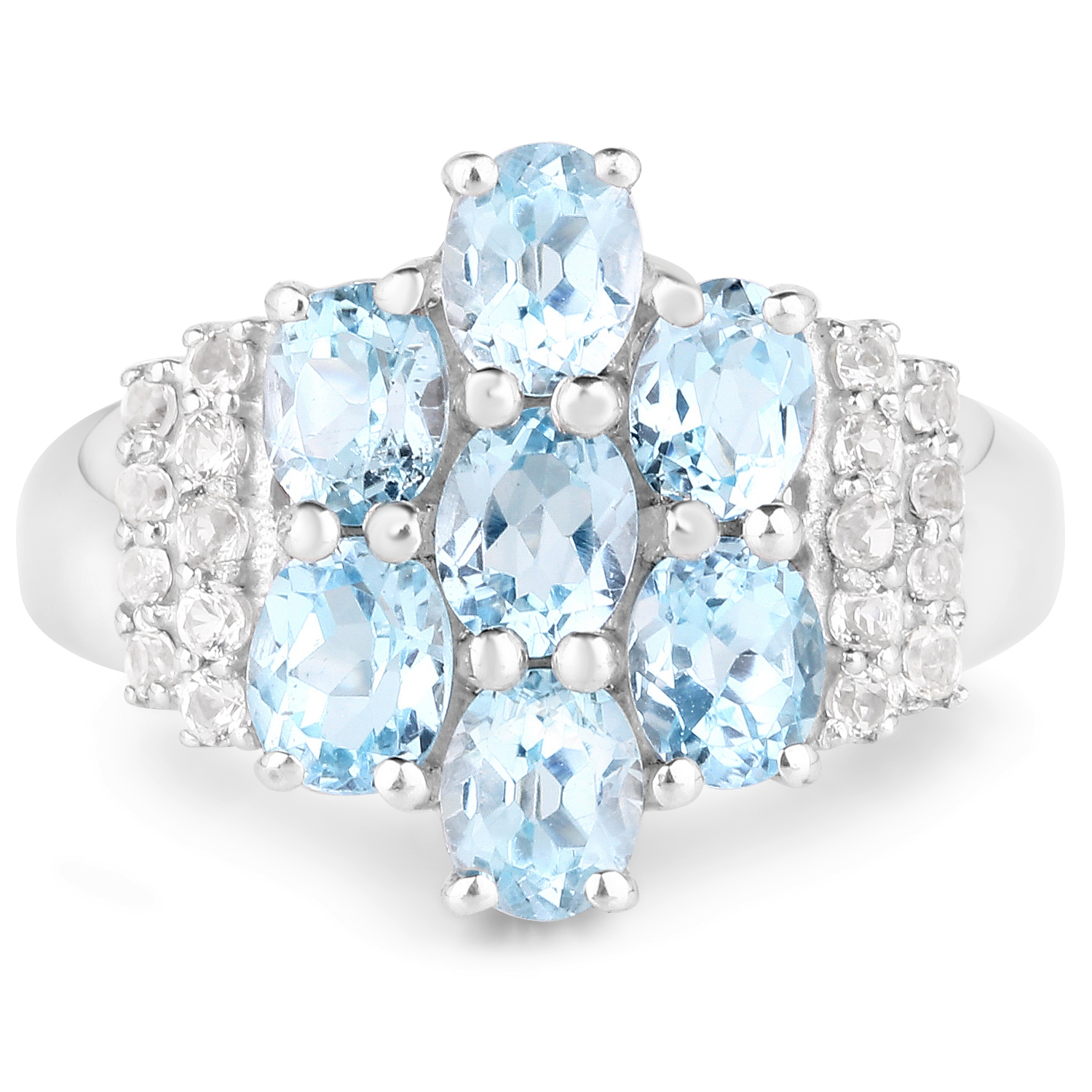 On each side, rows of white topaz add contrast and detail. Their smaller size and neutral color frame the center cluster, providing additional sparkle while keeping the focus on the blue topaz.