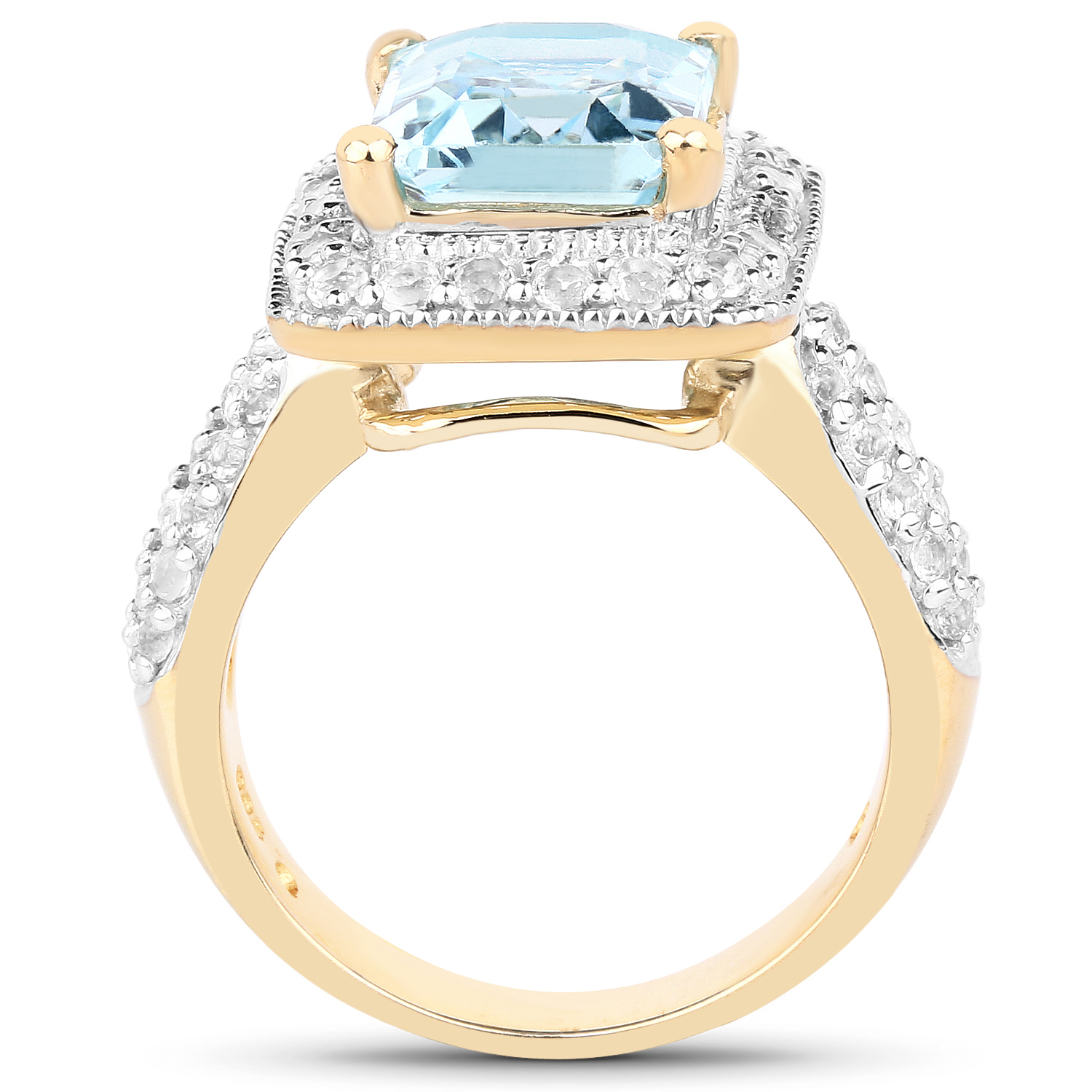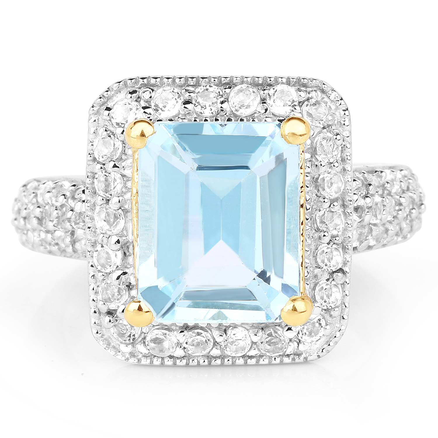 Surrounding the center stone is a halo of white topaz, adding brightness and contrast while framing the blue topaz with a consistent, reflective border. Additional white topaz along the shoulders extends the sparkle, giving the ring a more elevated and continuous look.